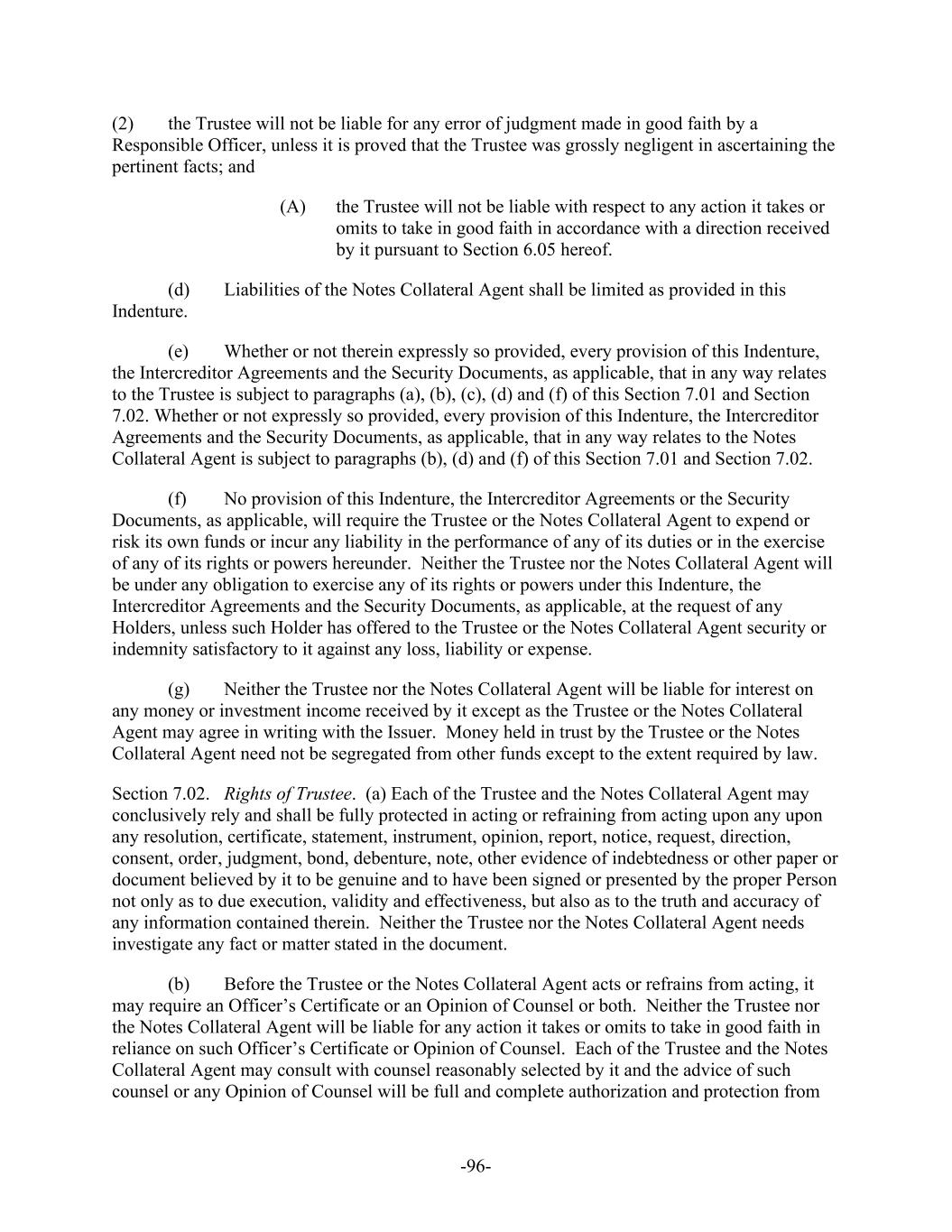 -96- (2) the Trustee will not be liable for any error of judgment made in good faith by a Responsible Officer, unless it is proved that the Trustee was grossly negligent in ascertaining the pertinent facts; and (A) the Trustee will not be liable with respect to any action it takes or omits to take in good faith in accordance with a direction received by it pursuant to Section 6.05 hereof. (d) Liabilities of the Notes Collateral Agent shall be limited as provided in this Indenture. (e) Whether or not therein expressly so provided, every provision of this Indenture, the Intercreditor Agreements and the Security Documents, as applicable, that in any way relates to the Trustee is subject to paragraphs (a), (b), (c), (d) and (f) of this Section 7.01 and Section 7.02. Whether or not expressly so provided, every provision of this Indenture, the Intercreditor Agreements and the Security Documents, as applicable, that in any way relates to the Notes Collateral Agent is subject to paragraphs (b), (d) and (f) of this Section 7.01 and Section 7.02. (f) No provision of this Indenture, the Intercreditor Agreements or the Security Documents, as applicable, will require the Trustee or the Notes Collateral Agent to expend or risk its own funds or incur any liability in the performance of any of its duties or in the exercise of any of its rights or powers hereunder. Neither the Trustee nor the Notes Collateral Agent will be under any obligation to exercise any of its rights or powers under this Indenture, the Intercreditor Agreements and the Security Documents, as applicable, at the request of any Holders, unless such Holder has offered to the Trustee or the Notes Collateral Agent security or indemnity satisfactory to it against any loss, liability or expense. (g) Neither the Trustee nor the Notes Collateral Agent will be liable for interest on any money or investment income received by it except as the Trustee or the Notes Collateral Agent may agree in writing with the Issuer. Money held in trust by the Trustee or the Notes Collateral Agent need not be segregated from other funds except to the extent required by law. Section 7.02. Rights of Trustee. (a) Each of the Trustee and the Notes Collateral Agent may conclusively rely and shall be fully protected in acting or refraining from acting upon any upon any resolution, certificate, statement, instrument, opinion, report, notice, request, direction, consent, order, judgment, bond, debenture, note, other evidence of indebtedness or other paper or document believed by it to be genuine and to have been signed or presented by the proper Person not only as to due execution, validity and effectiveness, but also as to the truth and accuracy of any information contained therein. Neither the Trustee nor the Notes Collateral Agent needs investigate any fact or matter stated in the document. (b) Before the Trustee or the Notes Collateral Agent acts or refrains from acting, it may require an Officer’s Certificate or an Opinion of Counsel or both. Neither the Trustee nor the Notes Collateral Agent will be liable for any action it takes or omits to take in good faith in reliance on such Officer’s Certificate or Opinion of Counsel. Each of the Trustee and the Notes Collateral Agent may consult with counsel reasonably selected by it and the advice of such counsel or any Opinion of Counsel will be full and complete authorization and protection from
