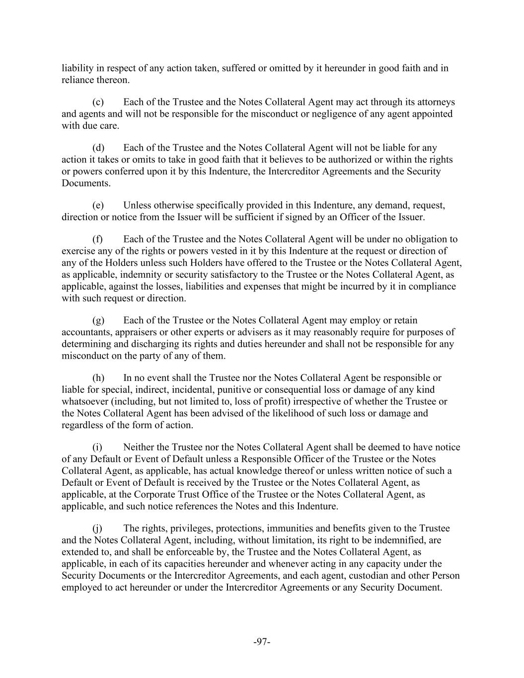 -97- liability in respect of any action taken, suffered or omitted by it hereunder in good faith and in reliance thereon. (c) Each of the Trustee and the Notes Collateral Agent may act through its attorneys and agents and will not be responsible for the misconduct or negligence of any agent appointed with due care. (d) Each of the Trustee and the Notes Collateral Agent will not be liable for any action it takes or omits to take in good faith that it believes to be authorized or within the rights or powers conferred upon it by this Indenture, the Intercreditor Agreements and the Security Documents. (e) Unless otherwise specifically provided in this Indenture, any demand, request, direction or notice from the Issuer will be sufficient if signed by an Officer of the Issuer. (f) Each of the Trustee and the Notes Collateral Agent will be under no obligation to exercise any of the rights or powers vested in it by this Indenture at the request or direction of any of the Holders unless such Holders have offered to the Trustee or the Notes Collateral Agent, as applicable, indemnity or security satisfactory to the Trustee or the Notes Collateral Agent, as applicable, against the losses, liabilities and expenses that might be incurred by it in compliance with such request or direction. (g) Each of the Trustee or the Notes Collateral Agent may employ or retain accountants, appraisers or other experts or advisers as it may reasonably require for purposes of determining and discharging its rights and duties hereunder and shall not be responsible for any misconduct on the party of any of them. (h) In no event shall the Trustee nor the Notes Collateral Agent be responsible or liable for special, indirect, incidental, punitive or consequential loss or damage of any kind whatsoever (including, but not limited to, loss of profit) irrespective of whether the Trustee or the Notes Collateral Agent has been advised of the likelihood of such loss or damage and regardless of the form of action. (i) Neither the Trustee nor the Notes Collateral Agent shall be deemed to have notice of any Default or Event of Default unless a Responsible Officer of the Trustee or the Notes Collateral Agent, as applicable, has actual knowledge thereof or unless written notice of such a Default or Event of Default is received by the Trustee or the Notes Collateral Agent, as applicable, at the Corporate Trust Office of the Trustee or the Notes Collateral Agent, as applicable, and such notice references the Notes and this Indenture. (j) The rights, privileges, protections, immunities and benefits given to the Trustee and the Notes Collateral Agent, including, without limitation, its right to be indemnified, are extended to, and shall be enforceable by, the Trustee and the Notes Collateral Agent, as applicable, in each of its capacities hereunder and whenever acting in any capacity under the Security Documents or the Intercreditor Agreements, and each agent, custodian and other Person employed to act hereunder or under the Intercreditor Agreements or any Security Document.