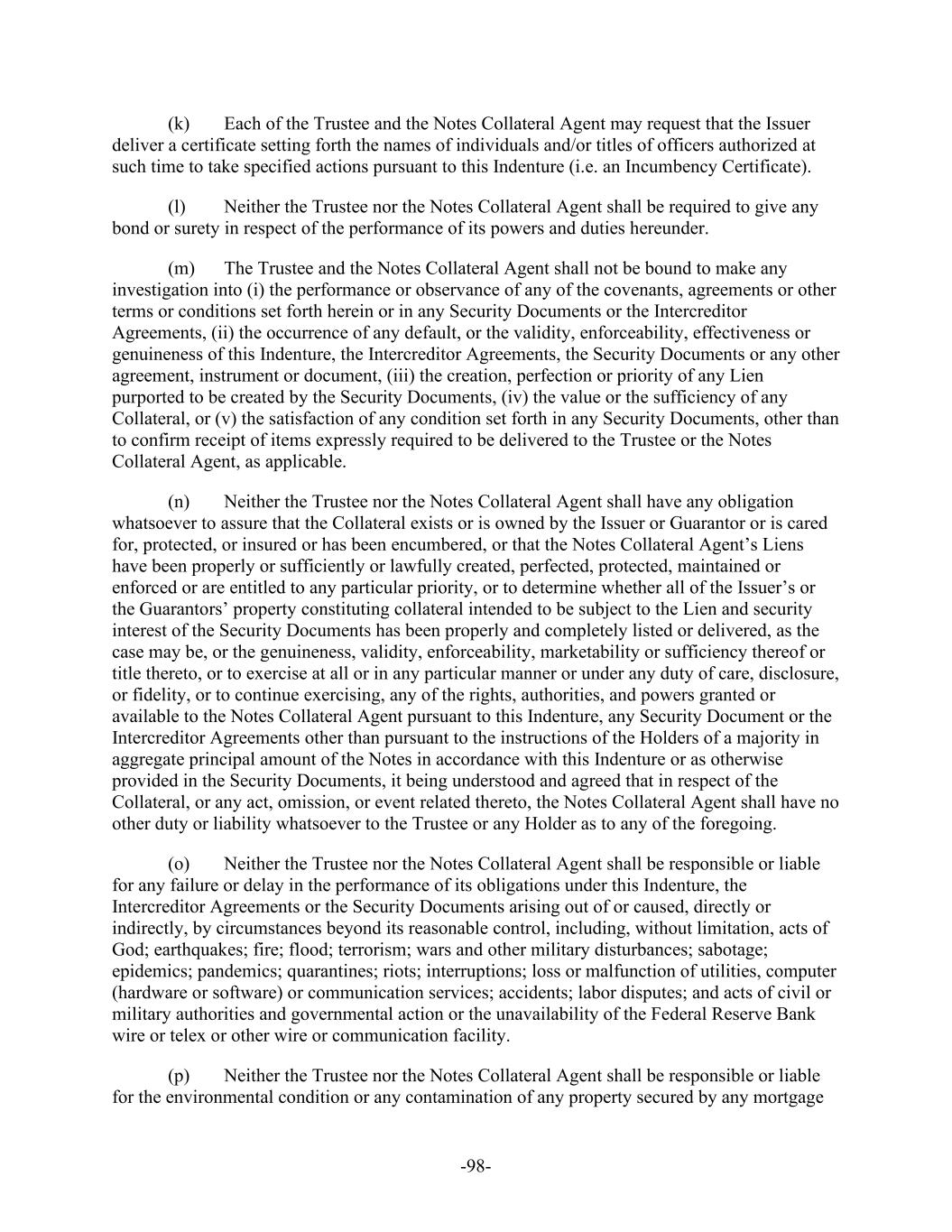 -98- (k) Each of the Trustee and the Notes Collateral Agent may request that the Issuer deliver a certificate setting forth the names of individuals and/or titles of officers authorized at such time to take specified actions pursuant to this Indenture (i.e. an Incumbency Certificate). (l) Neither the Trustee nor the Notes Collateral Agent shall be required to give any bond or surety in respect of the performance of its powers and duties hereunder. (m) The Trustee and the Notes Collateral Agent shall not be bound to make any investigation into (i) the performance or observance of any of the covenants, agreements or other terms or conditions set forth herein or in any Security Documents or the Intercreditor Agreements, (ii) the occurrence of any default, or the validity, enforceability, effectiveness or genuineness of this Indenture, the Intercreditor Agreements, the Security Documents or any other agreement, instrument or document, (iii) the creation, perfection or priority of any Lien purported to be created by the Security Documents, (iv) the value or the sufficiency of any Collateral, or (v) the satisfaction of any condition set forth in any Security Documents, other than to confirm receipt of items expressly required to be delivered to the Trustee or the Notes Collateral Agent, as applicable. (n) Neither the Trustee nor the Notes Collateral Agent shall have any obligation whatsoever to assure that the Collateral exists or is owned by the Issuer or Guarantor or is cared for, protected, or insured or has been encumbered, or that the Notes Collateral Agent’s Liens have been properly or sufficiently or lawfully created, perfected, protected, maintained or enforced or are entitled to any particular priority, or to determine whether all of the Issuer’s or the Guarantors’ property constituting collateral intended to be subject to the Lien and security interest of the Security Documents has been properly and completely listed or delivered, as the case may be, or the genuineness, validity, enforceability, marketability or sufficiency thereof or title thereto, or to exercise at all or in any particular manner or under any duty of care, disclosure, or fidelity, or to continue exercising, any of the rights, authorities, and powers granted or available to the Notes Collateral Agent pursuant to this Indenture, any Security Document or the Intercreditor Agreements other than pursuant to the instructions of the Holders of a majority in aggregate principal amount of the Notes in accordance with this Indenture or as otherwise provided in the Security Documents, it being understood and agreed that in respect of the Collateral, or any act, omission, or event related thereto, the Notes Collateral Agent shall have no other duty or liability whatsoever to the Trustee or any Holder as to any of the foregoing. (o) Neither the Trustee nor the Notes Collateral Agent shall be responsible or liable for any failure or delay in the performance of its obligations under this Indenture, the Intercreditor Agreements or the Security Documents arising out of or caused, directly or indirectly, by circumstances beyond its reasonable control, including, without limitation, acts of God; earthquakes; fire; flood; terrorism; wars and other military disturbances; sabotage; epidemics; pandemics; quarantines; riots; interruptions; loss or malfunction of utilities, computer (hardware or software) or communication services; accidents; labor disputes; and acts of civil or military authorities and governmental action or the unavailability of the Federal Reserve Bank wire or telex or other wire or communication facility. (p) Neither the Trustee nor the Notes Collateral Agent shall be responsible or liable for the environmental condition or any contamination of any property secured by any mortgage