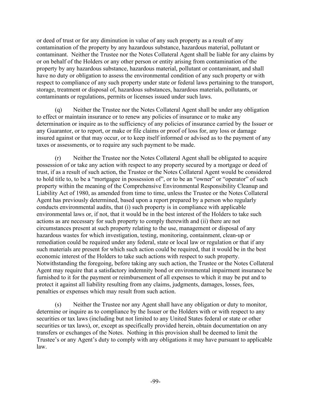 -99- or deed of trust or for any diminution in value of any such property as a result of any contamination of the property by any hazardous substance, hazardous material, pollutant or contaminant. Neither the Trustee nor the Notes Collateral Agent shall be liable for any claims by or on behalf of the Holders or any other person or entity arising from contamination of the property by any hazardous substance, hazardous material, pollutant or contaminant, and shall have no duty or obligation to assess the environmental condition of any such property or with respect to compliance of any such property under state or federal laws pertaining to the transport, storage, treatment or disposal of, hazardous substances, hazardous materials, pollutants, or contaminants or regulations, permits or licenses issued under such laws. (q) Neither the Trustee nor the Notes Collateral Agent shall be under any obligation to effect or maintain insurance or to renew any policies of insurance or to make any determination or inquire as to the sufficiency of any policies of insurance carried by the Issuer or any Guarantor, or to report, or make or file claims or proof of loss for, any loss or damage insured against or that may occur, or to keep itself informed or advised as to the payment of any taxes or assessments, or to require any such payment to be made. (r) Neither the Trustee nor the Notes Collateral Agent shall be obligated to acquire possession of or take any action with respect to any property secured by a mortgage or deed of trust, if as a result of such action, the Trustee or the Notes Collateral Agent would be considered to hold title to, to be a “mortgagee in possession of”, or to be an “owner” or “operator” of such property within the meaning of the Comprehensive Environmental Responsibility Cleanup and Liability Act of 1980, as amended from time to time, unless the Trustee or the Notes Collateral Agent has previously determined, based upon a report prepared by a person who regularly conducts environmental audits, that (i) such property is in compliance with applicable environmental laws or, if not, that it would be in the best interest of the Holders to take such actions as are necessary for such property to comply therewith and (ii) there are not circumstances present at such property relating to the use, management or disposal of any hazardous wastes for which investigation, testing, monitoring, containment, clean-up or remediation could be required under any federal, state or local law or regulation or that if any such materials are present for which such action could be required, that it would be in the best economic interest of the Holders to take such actions with respect to such property. Notwithstanding the foregoing, before taking any such action, the Trustee or the Notes Collateral Agent may require that a satisfactory indemnity bond or environmental impairment insurance be furnished to it for the payment or reimbursement of all expenses to which it may be put and to protect it against all liability resulting from any claims, judgments, damages, losses, fees, penalties or expenses which may result from such action. (s) Neither the Trustee nor any Agent shall have any obligation or duty to monitor, determine or inquire as to compliance by the Issuer or the Holders with or with respect to any securities or tax laws (including but not limited to any United States federal or state or other securities or tax laws), or, except as specifically provided herein, obtain documentation on any transfers or exchanges of the Notes. Nothing in this provision shall be deemed to limit the Trustee’s or any Agent’s duty to comply with any obligations it may have pursuant to applicable law.