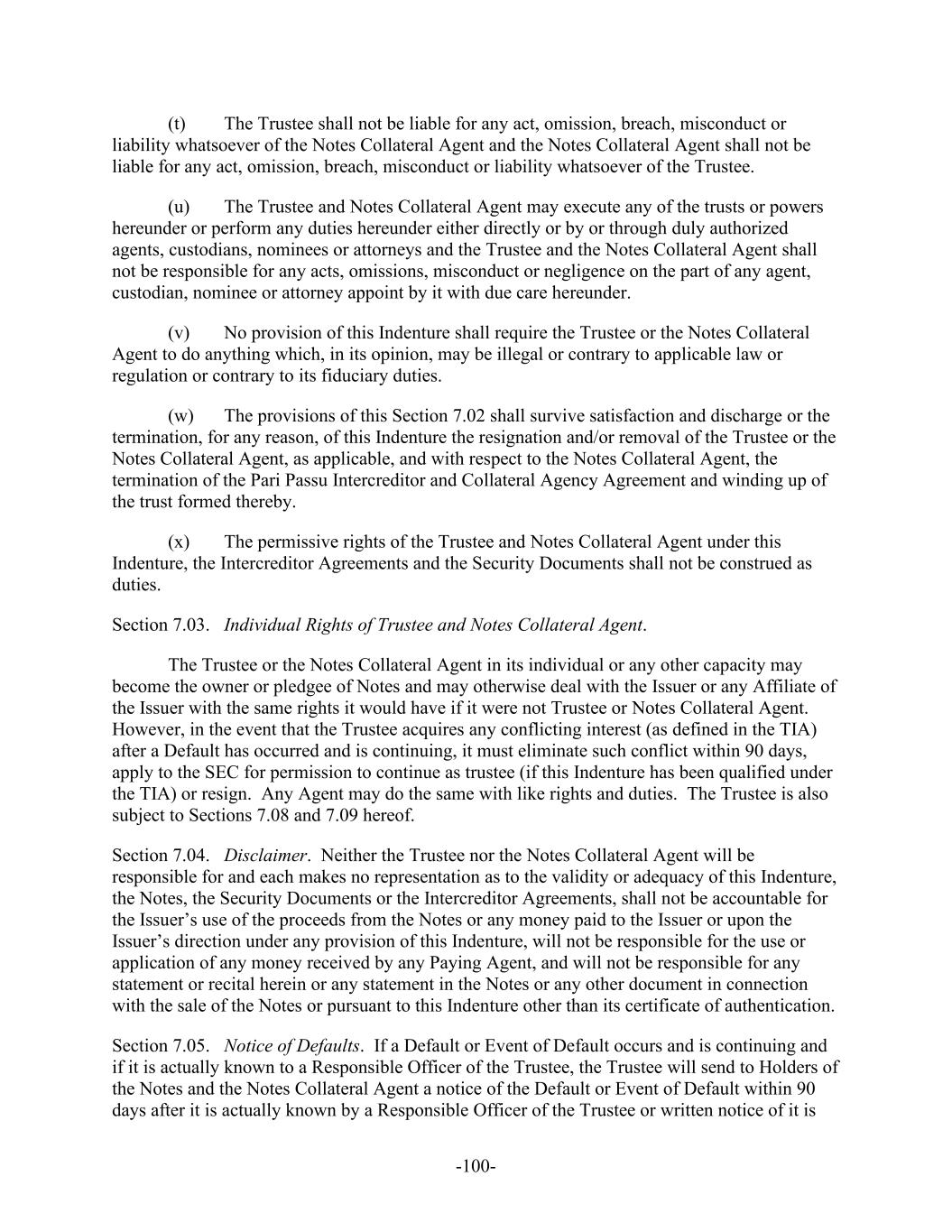 -100- (t) The Trustee shall not be liable for any act, omission, breach, misconduct or liability whatsoever of the Notes Collateral Agent and the Notes Collateral Agent shall not be liable for any act, omission, breach, misconduct or liability whatsoever of the Trustee. (u) The Trustee and Notes Collateral Agent may execute any of the trusts or powers hereunder or perform any duties hereunder either directly or by or through duly authorized agents, custodians, nominees or attorneys and the Trustee and the Notes Collateral Agent shall not be responsible for any acts, omissions, misconduct or negligence on the part of any agent, custodian, nominee or attorney appoint by it with due care hereunder. (v) No provision of this Indenture shall require the Trustee or the Notes Collateral Agent to do anything which, in its opinion, may be illegal or contrary to applicable law or regulation or contrary to its fiduciary duties. (w) The provisions of this Section 7.02 shall survive satisfaction and discharge or the termination, for any reason, of this Indenture the resignation and/or removal of the Trustee or the Notes Collateral Agent, as applicable, and with respect to the Notes Collateral Agent, the termination of the Pari Passu Intercreditor and Collateral Agency Agreement and winding up of the trust formed thereby. (x) The permissive rights of the Trustee and Notes Collateral Agent under this Indenture, the Intercreditor Agreements and the Security Documents shall not be construed as duties. Section 7.03. Individual Rights of Trustee and Notes Collateral Agent. The Trustee or the Notes Collateral Agent in its individual or any other capacity may become the owner or pledgee of Notes and may otherwise deal with the Issuer or any Affiliate of the Issuer with the same rights it would have if it were not Trustee or Notes Collateral Agent. However, in the event that the Trustee acquires any conflicting interest (as defined in the TIA) after a Default has occurred and is continuing, it must eliminate such conflict within 90 days, apply to the SEC for permission to continue as trustee (if this Indenture has been qualified under the TIA) or resign. Any Agent may do the same with like rights and duties. The Trustee is also subject to Sections 7.08 and 7.09 hereof. Section 7.04. Disclaimer. Neither the Trustee nor the Notes Collateral Agent will be responsible for and each makes no representation as to the validity or adequacy of this Indenture, the Notes, the Security Documents or the Intercreditor Agreements, shall not be accountable for the Issuer’s use of the proceeds from the Notes or any money paid to the Issuer or upon the Issuer’s direction under any provision of this Indenture, will not be responsible for the use or application of any money received by any Paying Agent, and will not be responsible for any statement or recital herein or any statement in the Notes or any other document in connection with the sale of the Notes or pursuant to this Indenture other than its certificate of authentication. Section 7.05. Notice of Defaults. If a Default or Event of Default occurs and is continuing and if it is actually known to a Responsible Officer of the Trustee, the Trustee will send to Holders of the Notes and the Notes Collateral Agent a notice of the Default or Event of Default within 90 days after it is actually known by a Responsible Officer of the Trustee or written notice of it is