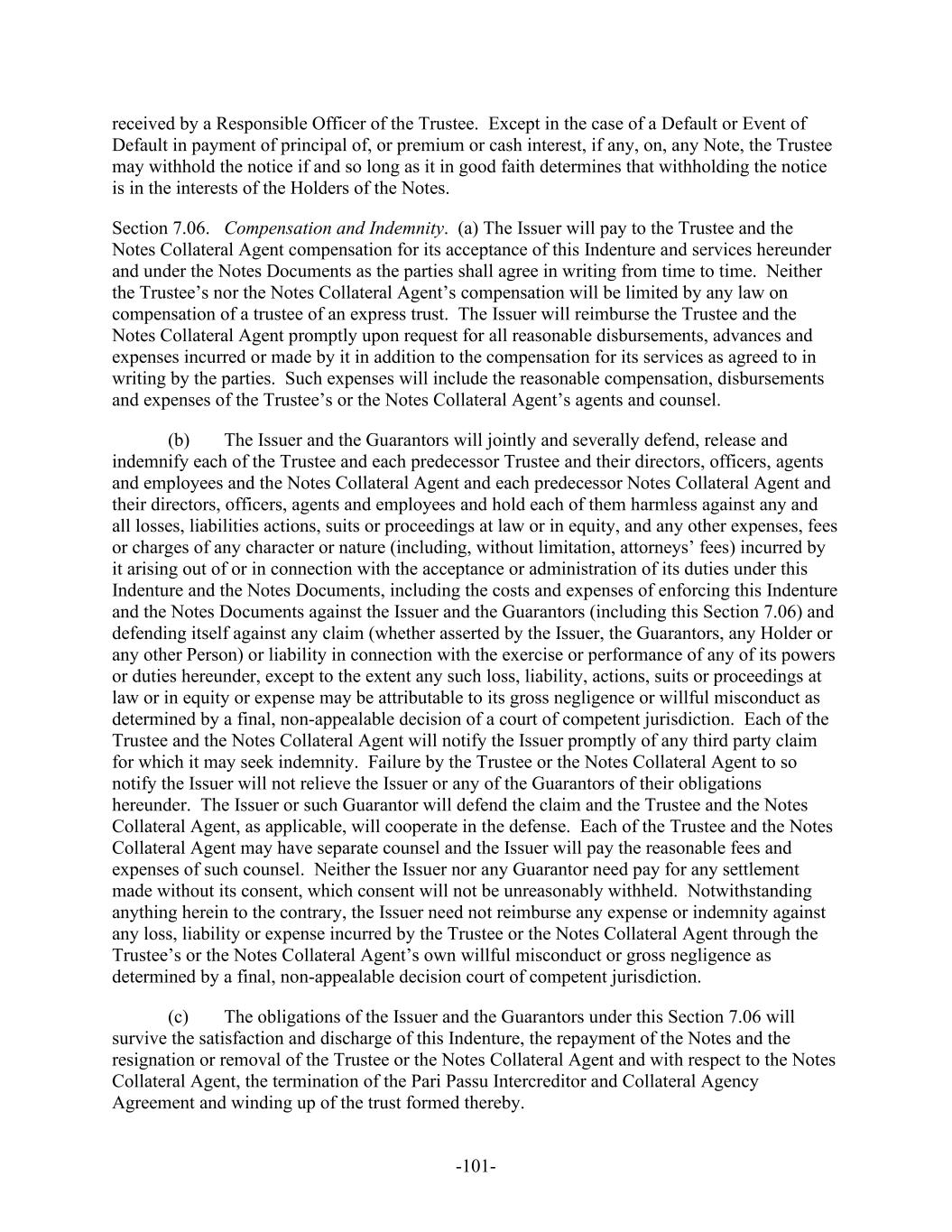 -101- received by a Responsible Officer of the Trustee. Except in the case of a Default or Event of Default in payment of principal of, or premium or cash interest, if any, on, any Note, the Trustee may withhold the notice if and so long as it in good faith determines that withholding the notice is in the interests of the Holders of the Notes. Section 7.06. Compensation and Indemnity. (a) The Issuer will pay to the Trustee and the Notes Collateral Agent compensation for its acceptance of this Indenture and services hereunder and under the Notes Documents as the parties shall agree in writing from time to time. Neither the Trustee’s nor the Notes Collateral Agent’s compensation will be limited by any law on compensation of a trustee of an express trust. The Issuer will reimburse the Trustee and the Notes Collateral Agent promptly upon request for all reasonable disbursements, advances and expenses incurred or made by it in addition to the compensation for its services as agreed to in writing by the parties. Such expenses will include the reasonable compensation, disbursements and expenses of the Trustee’s or the Notes Collateral Agent’s agents and counsel. (b) The Issuer and the Guarantors will jointly and severally defend, release and indemnify each of the Trustee and each predecessor Trustee and their directors, officers, agents and employees and the Notes Collateral Agent and each predecessor Notes Collateral Agent and their directors, officers, agents and employees and hold each of them harmless against any and all losses, liabilities actions, suits or proceedings at law or in equity, and any other expenses, fees or charges of any character or nature (including, without limitation, attorneys’ fees) incurred by it arising out of or in connection with the acceptance or administration of its duties under this Indenture and the Notes Documents, including the costs and expenses of enforcing this Indenture and the Notes Documents against the Issuer and the Guarantors (including this Section 7.06) and defending itself against any claim (whether asserted by the Issuer, the Guarantors, any Holder or any other Person) or liability in connection with the exercise or performance of any of its powers or duties hereunder, except to the extent any such loss, liability, actions, suits or proceedings at law or in equity or expense may be attributable to its gross negligence or willful misconduct as determined by a final, non-appealable decision of a court of competent jurisdiction. Each of the Trustee and the Notes Collateral Agent will notify the Issuer promptly of any third party claim for which it may seek indemnity. Failure by the Trustee or the Notes Collateral Agent to so notify the Issuer will not relieve the Issuer or any of the Guarantors of their obligations hereunder. The Issuer or such Guarantor will defend the claim and the Trustee and the Notes Collateral Agent, as applicable, will cooperate in the defense. Each of the Trustee and the Notes Collateral Agent may have separate counsel and the Issuer will pay the reasonable fees and expenses of such counsel. Neither the Issuer nor any Guarantor need pay for any settlement made without its consent, which consent will not be unreasonably withheld. Notwithstanding anything herein to the contrary, the Issuer need not reimburse any expense or indemnity against any loss, liability or expense incurred by the Trustee or the Notes Collateral Agent through the Trustee’s or the Notes Collateral Agent’s own willful misconduct or gross negligence as determined by a final, non-appealable decision court of competent jurisdiction. (c) The obligations of the Issuer and the Guarantors under this Section 7.06 will survive the satisfaction and discharge of this Indenture, the repayment of the Notes and the resignation or removal of the Trustee or the Notes Collateral Agent and with respect to the Notes Collateral Agent, the termination of the Pari Passu Intercreditor and Collateral Agency Agreement and winding up of the trust formed thereby.