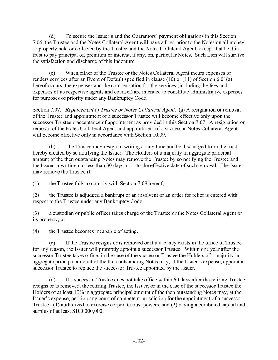 -102- (d) To secure the Issuer’s and the Guarantors’ payment obligations in this Section 7.06, the Trustee and the Notes Collateral Agent will have a Lien prior to the Notes on all money or property held or collected by the Trustee and the Notes Collateral Agent, except that held in trust to pay principal of, premium or interest, if any, on, particular Notes. Such Lien will survive the satisfaction and discharge of this Indenture. (e) When either of the Trustee or the Notes Collateral Agent incurs expenses or renders services after an Event of Default specified in clause (10) or (11) of Section 6.01(a) hereof occurs, the expenses and the compensation for the services (including the fees and expenses of its respective agents and counsel) are intended to constitute administrative expenses for purposes of priority under any Bankruptcy Code. Section 7.07. Replacement of Trustee or Notes Collateral Agent. (a) A resignation or removal of the Trustee and appointment of a successor Trustee will become effective only upon the successor Trustee’s acceptance of appointment as provided in this Section 7.07. A resignation or removal of the Notes Collateral Agent and appointment of a successor Notes Collateral Agent will become effective only in accordance with Section 10.09. (b) The Trustee may resign in writing at any time and be discharged from the trust hereby created by so notifying the Issuer. The Holders of a majority in aggregate principal amount of the then outstanding Notes may remove the Trustee by so notifying the Trustee and the Issuer in writing not less than 30 days prior to the effective date of such removal. The Issuer may remove the Trustee if: (1) the Trustee fails to comply with Section 7.09 hereof; (2) the Trustee is adjudged a bankrupt or an insolvent or an order for relief is entered with respect to the Trustee under any Bankruptcy Code; (3) a custodian or public officer takes charge of the Trustee or the Notes Collateral Agent or its property; or (4) the Trustee becomes incapable of acting. (c) If the Trustee resigns or is removed or if a vacancy exists in the office of Trustee for any reason, the Issuer will promptly appoint a successor Trustee. Within one year after the successor Trustee takes office, in the case of the successor Trustee the Holders of a majority in aggregate principal amount of the then outstanding Notes may, at the Issuer’s expense, appoint a successor Trustee to replace the successor Trustee appointed by the Issuer. (d) If a successor Trustee does not take office within 60 days after the retiring Trustee resigns or is removed, the retiring Trustee, the Issuer, or in the case of the successor Trustee the Holders of at least 10% in aggregate principal amount of the then outstanding Notes may, at the Issuer’s expense, petition any court of competent jurisdiction for the appointment of a successor Trustee: (1) authorized to exercise corporate trust powers, and (2) having a combined capital and surplus of at least $100,000,000.