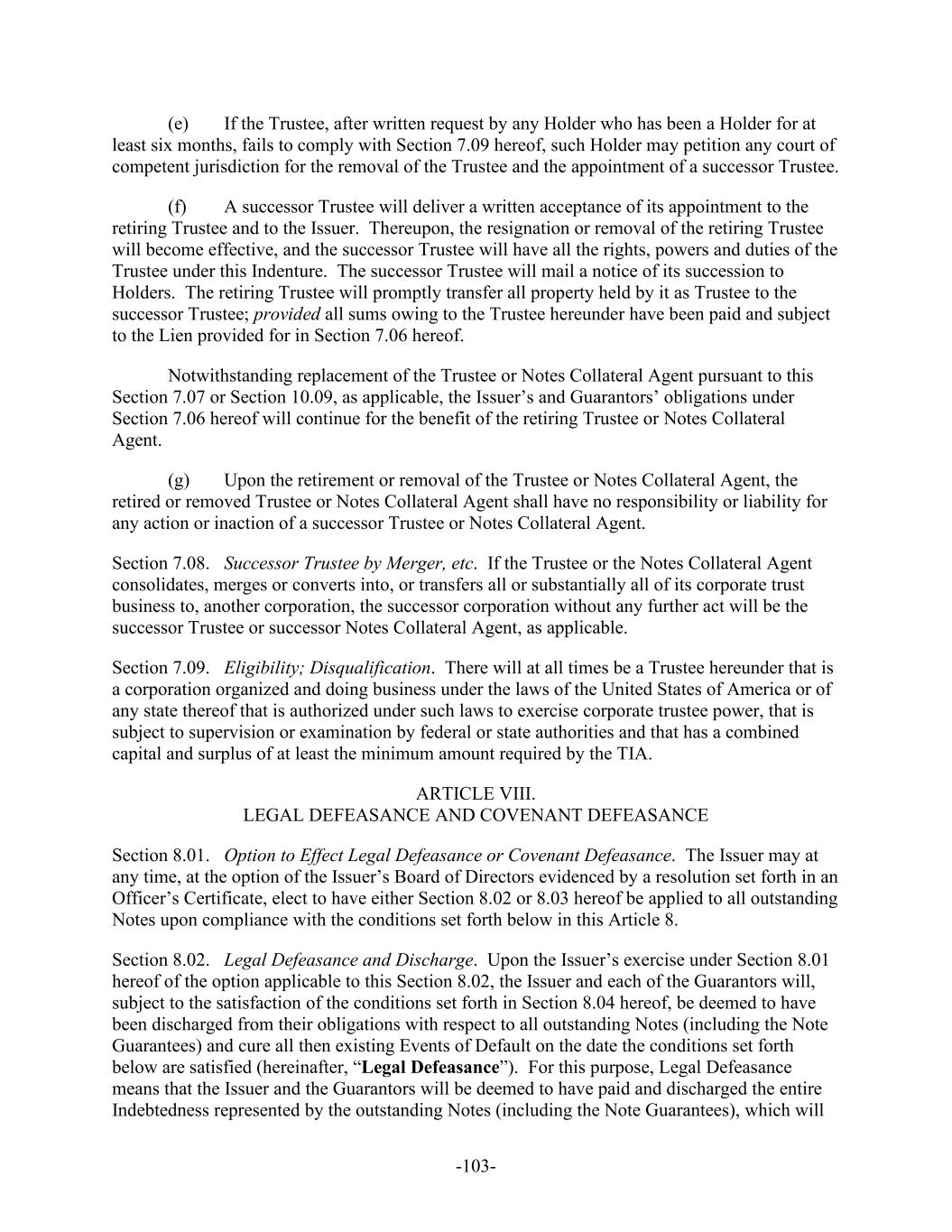 -103- (e) If the Trustee, after written request by any Holder who has been a Holder for at least six months, fails to comply with Section 7.09 hereof, such Holder may petition any court of competent jurisdiction for the removal of the Trustee and the appointment of a successor Trustee. (f) A successor Trustee will deliver a written acceptance of its appointment to the retiring Trustee and to the Issuer. Thereupon, the resignation or removal of the retiring Trustee will become effective, and the successor Trustee will have all the rights, powers and duties of the Trustee under this Indenture. The successor Trustee will mail a notice of its succession to Holders. The retiring Trustee will promptly transfer all property held by it as Trustee to the successor Trustee; provided all sums owing to the Trustee hereunder have been paid and subject to the Lien provided for in Section 7.06 hereof. Notwithstanding replacement of the Trustee or Notes Collateral Agent pursuant to this Section 7.07 or Section 10.09, as applicable, the Issuer’s and Guarantors’ obligations under Section 7.06 hereof will continue for the benefit of the retiring Trustee or Notes Collateral Agent. (g) Upon the retirement or removal of the Trustee or Notes Collateral Agent, the retired or removed Trustee or Notes Collateral Agent shall have no responsibility or liability for any action or inaction of a successor Trustee or Notes Collateral Agent. Section 7.08. Successor Trustee by Merger, etc. If the Trustee or the Notes Collateral Agent consolidates, merges or converts into, or transfers all or substantially all of its corporate trust business to, another corporation, the successor corporation without any further act will be the successor Trustee or successor Notes Collateral Agent, as applicable. Section 7.09. Eligibility; Disqualification. There will at all times be a Trustee hereunder that is a corporation organized and doing business under the laws of the United States of America or of any state thereof that is authorized under such laws to exercise corporate trustee power, that is subject to supervision or examination by federal or state authorities and that has a combined capital and surplus of at least the minimum amount required by the TIA. ARTICLE VIII. LEGAL DEFEASANCE AND COVENANT DEFEASANCE Section 8.01. Option to Effect Legal Defeasance or Covenant Defeasance. The Issuer may at any time, at the option of the Issuer’s Board of Directors evidenced by a resolution set forth in an Officer’s Certificate, elect to have either Section 8.02 or 8.03 hereof be applied to all outstanding Notes upon compliance with the conditions set forth below in this Article 8. Section 8.02. Legal Defeasance and Discharge. Upon the Issuer’s exercise under Section 8.01 hereof of the option applicable to this Section 8.02, the Issuer and each of the Guarantors will, subject to the satisfaction of the conditions set forth in Section 8.04 hereof, be deemed to have been discharged from their obligations with respect to all outstanding Notes (including the Note Guarantees) and cure all then existing Events of Default on the date the conditions set forth below are satisfied (hereinafter, “Legal Defeasance”). For this purpose, Legal Defeasance means that the Issuer and the Guarantors will be deemed to have paid and discharged the entire Indebtedness represented by the outstanding Notes (including the Note Guarantees), which will