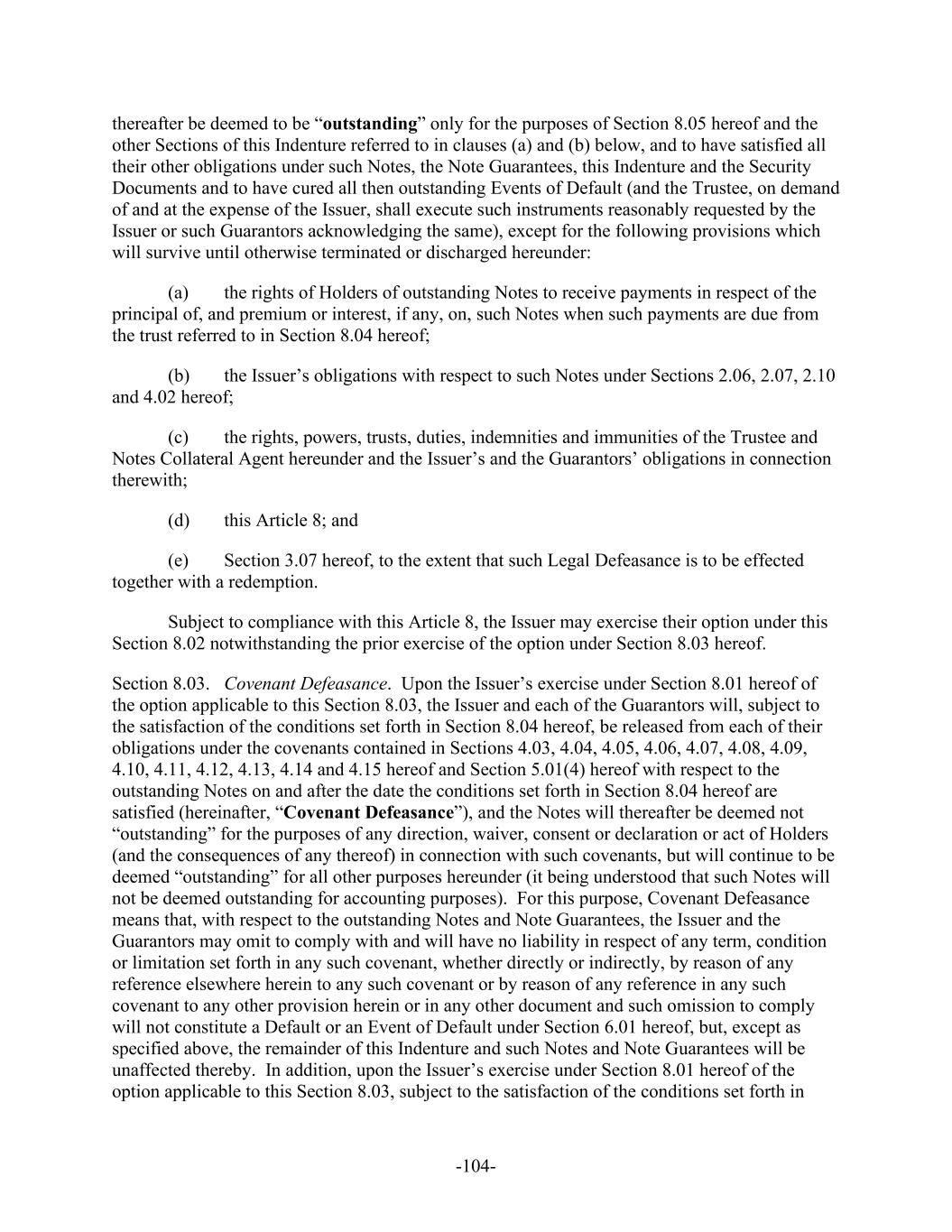 -104- thereafter be deemed to be “outstanding” only for the purposes of Section 8.05 hereof and the other Sections of this Indenture referred to in clauses (a) and (b) below, and to have satisfied all their other obligations under such Notes, the Note Guarantees, this Indenture and the Security Documents and to have cured all then outstanding Events of Default (and the Trustee, on demand of and at the expense of the Issuer, shall execute such instruments reasonably requested by the Issuer or such Guarantors acknowledging the same), except for the following provisions which will survive until otherwise terminated or discharged hereunder: (a) the rights of Holders of outstanding Notes to receive payments in respect of the principal of, and premium or interest, if any, on, such Notes when such payments are due from the trust referred to in Section 8.04 hereof; (b) the Issuer’s obligations with respect to such Notes under Sections 2.06, 2.07, 2.10 and 4.02 hereof; (c) the rights, powers, trusts, duties, indemnities and immunities of the Trustee and Notes Collateral Agent hereunder and the Issuer’s and the Guarantors’ obligations in connection therewith; (d) this Article 8; and (e) Section 3.07 hereof, to the extent that such Legal Defeasance is to be effected together with a redemption. Subject to compliance with this Article 8, the Issuer may exercise their option under this Section 8.02 notwithstanding the prior exercise of the option under Section 8.03 hereof. Section 8.03. Covenant Defeasance. Upon the Issuer’s exercise under Section 8.01 hereof of the option applicable to this Section 8.03, the Issuer and each of the Guarantors will, subject to the satisfaction of the conditions set forth in Section 8.04 hereof, be released from each of their obligations under the covenants contained in Sections 4.03, 4.04, 4.05, 4.06, 4.07, 4.08, 4.09, 4.10, 4.11, 4.12, 4.13, 4.14 and 4.15 hereof and Section 5.01(4) hereof with respect to the outstanding Notes on and after the date the conditions set forth in Section 8.04 hereof are satisfied (hereinafter, “Covenant Defeasance”), and the Notes will thereafter be deemed not “outstanding” for the purposes of any direction, waiver, consent or declaration or act of Holders (and the consequences of any thereof) in connection with such covenants, but will continue to be deemed “outstanding” for all other purposes hereunder (it being understood that such Notes will not be deemed outstanding for accounting purposes). For this purpose, Covenant Defeasance means that, with respect to the outstanding Notes and Note Guarantees, the Issuer and the Guarantors may omit to comply with and will have no liability in respect of any term, condition or limitation set forth in any such covenant, whether directly or indirectly, by reason of any reference elsewhere herein to any such covenant or by reason of any reference in any such covenant to any other provision herein or in any other document and such omission to comply will not constitute a Default or an Event of Default under Section 6.01 hereof, but, except as specified above, the remainder of this Indenture and such Notes and Note Guarantees will be unaffected thereby. In addition, upon the Issuer’s exercise under Section 8.01 hereof of the option applicable to this Section 8.03, subject to the satisfaction of the conditions set forth in