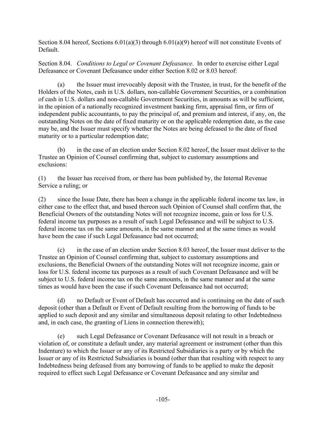 -105- Section 8.04 hereof, Sections 6.01(a)(3) through 6.01(a)(9) hereof will not constitute Events of Default. Section 8.04. Conditions to Legal or Covenant Defeasance. In order to exercise either Legal Defeasance or Covenant Defeasance under either Section 8.02 or 8.03 hereof: (a) the Issuer must irrevocably deposit with the Trustee, in trust, for the benefit of the Holders of the Notes, cash in U.S. dollars, non-callable Government Securities, or a combination of cash in U.S. dollars and non-callable Government Securities, in amounts as will be sufficient, in the opinion of a nationally recognized investment banking firm, appraisal firm, or firm of independent public accountants, to pay the principal of, and premium and interest, if any, on, the outstanding Notes on the date of fixed maturity or on the applicable redemption date, as the case may be, and the Issuer must specify whether the Notes are being defeased to the date of fixed maturity or to a particular redemption date; (b) in the case of an election under Section 8.02 hereof, the Issuer must deliver to the Trustee an Opinion of Counsel confirming that, subject to customary assumptions and exclusions: (1) the Issuer has received from, or there has been published by, the Internal Revenue Service a ruling; or (2) since the Issue Date, there has been a change in the applicable federal income tax law, in either case to the effect that, and based thereon such Opinion of Counsel shall confirm that, the Beneficial Owners of the outstanding Notes will not recognize income, gain or loss for U.S. federal income tax purposes as a result of such Legal Defeasance and will be subject to U.S. federal income tax on the same amounts, in the same manner and at the same times as would have been the case if such Legal Defeasance had not occurred; (c) in the case of an election under Section 8.03 hereof, the Issuer must deliver to the Trustee an Opinion of Counsel confirming that, subject to customary assumptions and exclusions, the Beneficial Owners of the outstanding Notes will not recognize income, gain or loss for U.S. federal income tax purposes as a result of such Covenant Defeasance and will be subject to U.S. federal income tax on the same amounts, in the same manner and at the same times as would have been the case if such Covenant Defeasance had not occurred; (d) no Default or Event of Default has occurred and is continuing on the date of such deposit (other than a Default or Event of Default resulting from the borrowing of funds to be applied to such deposit and any similar and simultaneous deposit relating to other Indebtedness and, in each case, the granting of Liens in connection therewith); (e) such Legal Defeasance or Covenant Defeasance will not result in a breach or violation of, or constitute a default under, any material agreement or instrument (other than this Indenture) to which the Issuer or any of its Restricted Subsidiaries is a party or by which the Issuer or any of its Restricted Subsidiaries is bound (other than that resulting with respect to any Indebtedness being defeased from any borrowing of funds to be applied to make the deposit required to effect such Legal Defeasance or Covenant Defeasance and any similar and