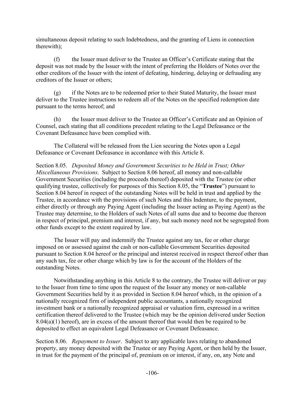 -106- simultaneous deposit relating to such Indebtedness, and the granting of Liens in connection therewith); (f) the Issuer must deliver to the Trustee an Officer’s Certificate stating that the deposit was not made by the Issuer with the intent of preferring the Holders of Notes over the other creditors of the Issuer with the intent of defeating, hindering, delaying or defrauding any creditors of the Issuer or others; (g) if the Notes are to be redeemed prior to their Stated Maturity, the Issuer must deliver to the Trustee instructions to redeem all of the Notes on the specified redemption date pursuant to the terms hereof; and (h) the Issuer must deliver to the Trustee an Officer’s Certificate and an Opinion of Counsel, each stating that all conditions precedent relating to the Legal Defeasance or the Covenant Defeasance have been complied with. The Collateral will be released from the Lien securing the Notes upon a Legal Defeasance or Covenant Defeasance in accordance with this Article 8. Section 8.05. Deposited Money and Government Securities to be Held in Trust; Other Miscellaneous Provisions. Subject to Section 8.06 hereof, all money and non-callable Government Securities (including the proceeds thereof) deposited with the Trustee (or other qualifying trustee, collectively for purposes of this Section 8.05, the “Trustee”) pursuant to Section 8.04 hereof in respect of the outstanding Notes will be held in trust and applied by the Trustee, in accordance with the provisions of such Notes and this Indenture, to the payment, either directly or through any Paying Agent (including the Issuer acting as Paying Agent) as the Trustee may determine, to the Holders of such Notes of all sums due and to become due thereon in respect of principal, premium and interest, if any, but such money need not be segregated from other funds except to the extent required by law. The Issuer will pay and indemnify the Trustee against any tax, fee or other charge imposed on or assessed against the cash or non-callable Government Securities deposited pursuant to Section 8.04 hereof or the principal and interest received in respect thereof other than any such tax, fee or other charge which by law is for the account of the Holders of the outstanding Notes. Notwithstanding anything in this Article 8 to the contrary, the Trustee will deliver or pay to the Issuer from time to time upon the request of the Issuer any money or non-callable Government Securities held by it as provided in Section 8.04 hereof which, in the opinion of a nationally recognized firm of independent public accountants, a nationally recognized investment bank or a nationally recognized appraisal or valuation firm, expressed in a written certification thereof delivered to the Trustee (which may be the opinion delivered under Section 8.04(a)(1) hereof), are in excess of the amount thereof that would then be required to be deposited to effect an equivalent Legal Defeasance or Covenant Defeasance. Section 8.06. Repayment to Issuer. Subject to any applicable laws relating to abandoned property, any money deposited with the Trustee or any Paying Agent, or then held by the Issuer, in trust for the payment of the principal of, premium on or interest, if any, on, any Note and