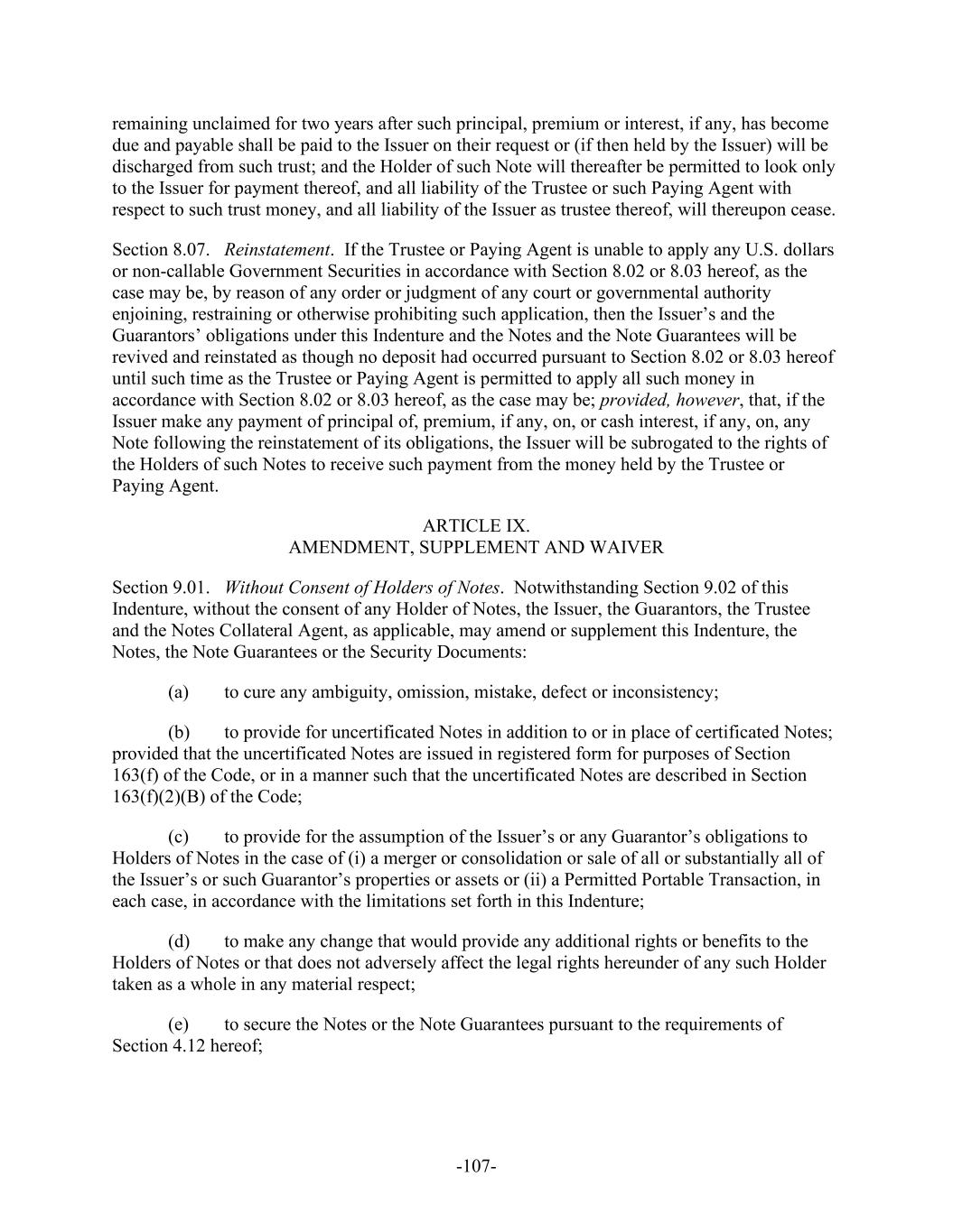 -107- remaining unclaimed for two years after such principal, premium or interest, if any, has become due and payable shall be paid to the Issuer on their request or (if then held by the Issuer) will be discharged from such trust; and the Holder of such Note will thereafter be permitted to look only to the Issuer for payment thereof, and all liability of the Trustee or such Paying Agent with respect to such trust money, and all liability of the Issuer as trustee thereof, will thereupon cease. Section 8.07. Reinstatement. If the Trustee or Paying Agent is unable to apply any U.S. dollars or non-callable Government Securities in accordance with Section 8.02 or 8.03 hereof, as the case may be, by reason of any order or judgment of any court or governmental authority enjoining, restraining or otherwise prohibiting such application, then the Issuer’s and the Guarantors’ obligations under this Indenture and the Notes and the Note Guarantees will be revived and reinstated as though no deposit had occurred pursuant to Section 8.02 or 8.03 hereof until such time as the Trustee or Paying Agent is permitted to apply all such money in accordance with Section 8.02 or 8.03 hereof, as the case may be; provided, however, that, if the Issuer make any payment of principal of, premium, if any, on, or cash interest, if any, on, any Note following the reinstatement of its obligations, the Issuer will be subrogated to the rights of the Holders of such Notes to receive such payment from the money held by the Trustee or Paying Agent. ARTICLE IX. AMENDMENT, SUPPLEMENT AND WAIVER Section 9.01. Without Consent of Holders of Notes. Notwithstanding Section 9.02 of this Indenture, without the consent of any Holder of Notes, the Issuer, the Guarantors, the Trustee and the Notes Collateral Agent, as applicable, may amend or supplement this Indenture, the Notes, the Note Guarantees or the Security Documents: (a) to cure any ambiguity, omission, mistake, defect or inconsistency; (b) to provide for uncertificated Notes in addition to or in place of certificated Notes; provided that the uncertificated Notes are issued in registered form for purposes of Section 163(f) of the Code, or in a manner such that the uncertificated Notes are described in Section 163(f)(2)(B) of the Code; (c) to provide for the assumption of the Issuer’s or any Guarantor’s obligations to Holders of Notes in the case of (i) a merger or consolidation or sale of all or substantially all of the Issuer’s or such Guarantor’s properties or assets or (ii) a Permitted Portable Transaction, in each case, in accordance with the limitations set forth in this Indenture; (d) to make any change that would provide any additional rights or benefits to the Holders of Notes or that does not adversely affect the legal rights hereunder of any such Holder taken as a whole in any material respect; (e) to secure the Notes or the Note Guarantees pursuant to the requirements of Section 4.12 hereof;