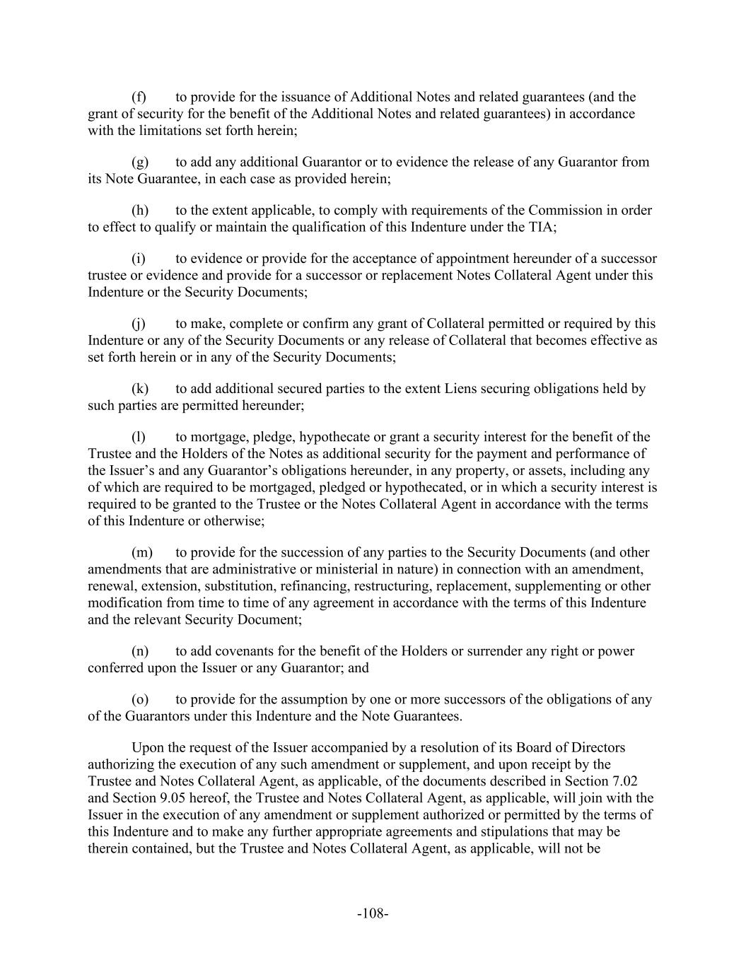 -108- (f) to provide for the issuance of Additional Notes and related guarantees (and the grant of security for the benefit of the Additional Notes and related guarantees) in accordance with the limitations set forth herein; (g) to add any additional Guarantor or to evidence the release of any Guarantor from its Note Guarantee, in each case as provided herein; (h) to the extent applicable, to comply with requirements of the Commission in order to effect to qualify or maintain the qualification of this Indenture under the TIA; (i) to evidence or provide for the acceptance of appointment hereunder of a successor trustee or evidence and provide for a successor or replacement Notes Collateral Agent under this Indenture or the Security Documents; (j) to make, complete or confirm any grant of Collateral permitted or required by this Indenture or any of the Security Documents or any release of Collateral that becomes effective as set forth herein or in any of the Security Documents; (k) to add additional secured parties to the extent Liens securing obligations held by such parties are permitted hereunder; (l) to mortgage, pledge, hypothecate or grant a security interest for the benefit of the Trustee and the Holders of the Notes as additional security for the payment and performance of the Issuer’s and any Guarantor’s obligations hereunder, in any property, or assets, including any of which are required to be mortgaged, pledged or hypothecated, or in which a security interest is required to be granted to the Trustee or the Notes Collateral Agent in accordance with the terms of this Indenture or otherwise; (m) to provide for the succession of any parties to the Security Documents (and other amendments that are administrative or ministerial in nature) in connection with an amendment, renewal, extension, substitution, refinancing, restructuring, replacement, supplementing or other modification from time to time of any agreement in accordance with the terms of this Indenture and the relevant Security Document; (n) to add covenants for the benefit of the Holders or surrender any right or power conferred upon the Issuer or any Guarantor; and (o) to provide for the assumption by one or more successors of the obligations of any of the Guarantors under this Indenture and the Note Guarantees. Upon the request of the Issuer accompanied by a resolution of its Board of Directors authorizing the execution of any such amendment or supplement, and upon receipt by the Trustee and Notes Collateral Agent, as applicable, of the documents described in Section 7.02 and Section 9.05 hereof, the Trustee and Notes Collateral Agent, as applicable, will join with the Issuer in the execution of any amendment or supplement authorized or permitted by the terms of this Indenture and to make any further appropriate agreements and stipulations that may be therein contained, but the Trustee and Notes Collateral Agent, as applicable, will not be