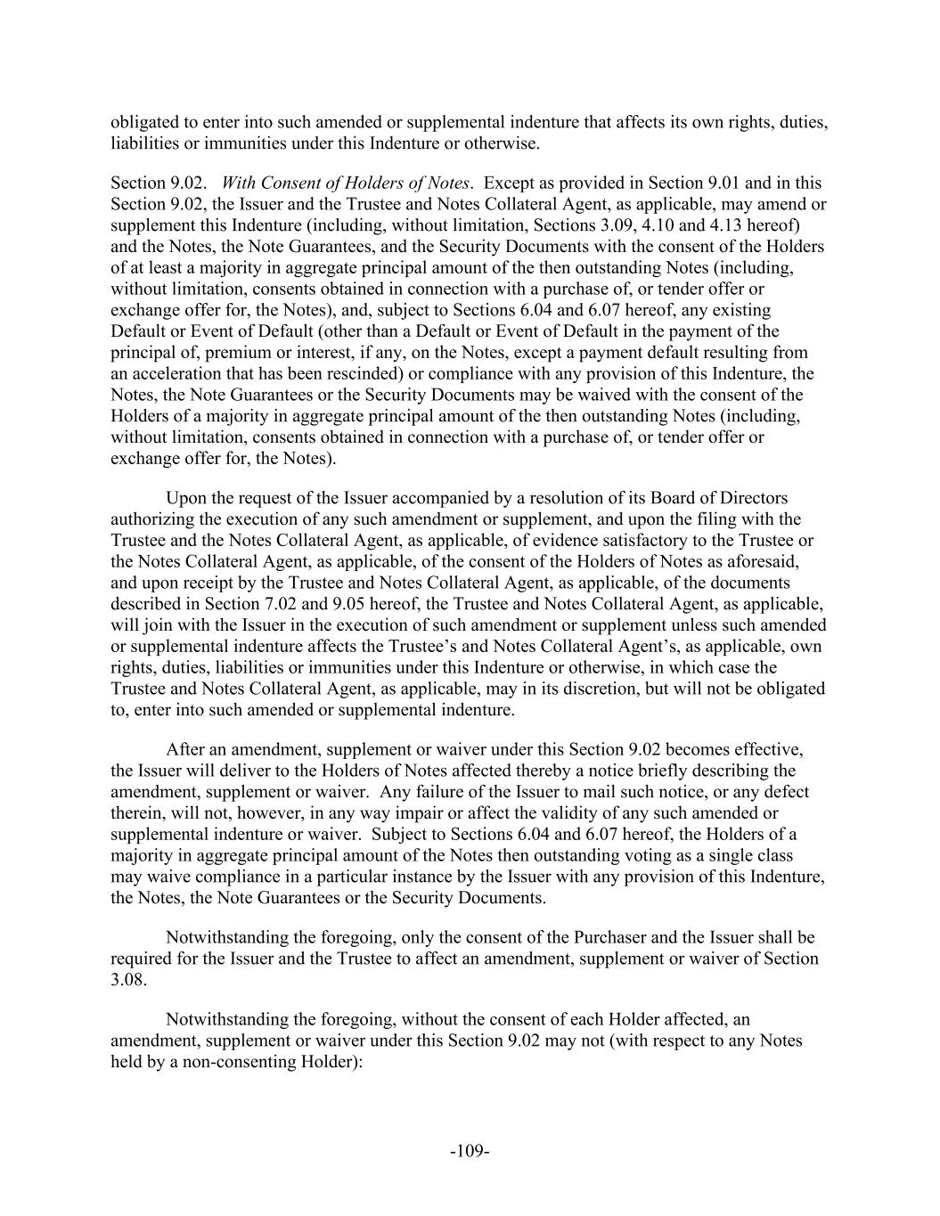 -109- obligated to enter into such amended or supplemental indenture that affects its own rights, duties, liabilities or immunities under this Indenture or otherwise. Section 9.02. With Consent of Holders of Notes. Except as provided in Section 9.01 and in this Section 9.02, the Issuer and the Trustee and Notes Collateral Agent, as applicable, may amend or supplement this Indenture (including, without limitation, Sections 3.09, 4.10 and 4.13 hereof) and the Notes, the Note Guarantees, and the Security Documents with the consent of the Holders of at least a majority in aggregate principal amount of the then outstanding Notes (including, without limitation, consents obtained in connection with a purchase of, or tender offer or exchange offer for, the Notes), and, subject to Sections 6.04 and 6.07 hereof, any existing Default or Event of Default (other than a Default or Event of Default in the payment of the principal of, premium or interest, if any, on the Notes, except a payment default resulting from an acceleration that has been rescinded) or compliance with any provision of this Indenture, the Notes, the Note Guarantees or the Security Documents may be waived with the consent of the Holders of a majority in aggregate principal amount of the then outstanding Notes (including, without limitation, consents obtained in connection with a purchase of, or tender offer or exchange offer for, the Notes). Upon the request of the Issuer accompanied by a resolution of its Board of Directors authorizing the execution of any such amendment or supplement, and upon the filing with the Trustee and the Notes Collateral Agent, as applicable, of evidence satisfactory to the Trustee or the Notes Collateral Agent, as applicable, of the consent of the Holders of Notes as aforesaid, and upon receipt by the Trustee and Notes Collateral Agent, as applicable, of the documents described in Section 7.02 and 9.05 hereof, the Trustee and Notes Collateral Agent, as applicable, will join with the Issuer in the execution of such amendment or supplement unless such amended or supplemental indenture affects the Trustee’s and Notes Collateral Agent’s, as applicable, own rights, duties, liabilities or immunities under this Indenture or otherwise, in which case the Trustee and Notes Collateral Agent, as applicable, may in its discretion, but will not be obligated to, enter into such amended or supplemental indenture. After an amendment, supplement or waiver under this Section 9.02 becomes effective, the Issuer will deliver to the Holders of Notes affected thereby a notice briefly describing the amendment, supplement or waiver. Any failure of the Issuer to mail such notice, or any defect therein, will not, however, in any way impair or affect the validity of any such amended or supplemental indenture or waiver. Subject to Sections 6.04 and 6.07 hereof, the Holders of a majority in aggregate principal amount of the Notes then outstanding voting as a single class may waive compliance in a particular instance by the Issuer with any provision of this Indenture, the Notes, the Note Guarantees or the Security Documents. Notwithstanding the foregoing, only the consent of the Purchaser and the Issuer shall be required for the Issuer and the Trustee to affect an amendment, supplement or waiver of Section 3.08. Notwithstanding the foregoing, without the consent of each Holder affected, an amendment, supplement or waiver under this Section 9.02 may not (with respect to any Notes held by a non-consenting Holder):