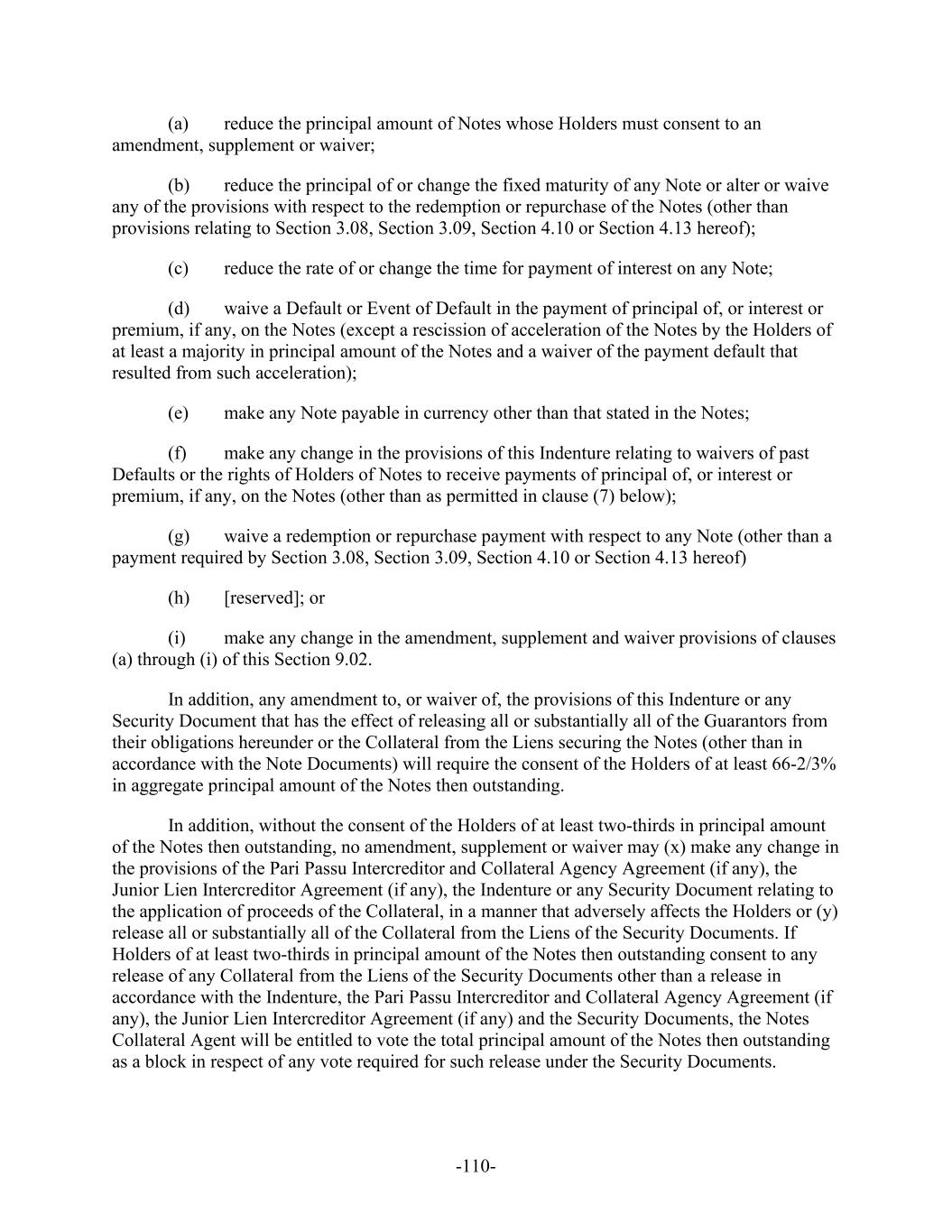 -110- (a) reduce the principal amount of Notes whose Holders must consent to an amendment, supplement or waiver; (b) reduce the principal of or change the fixed maturity of any Note or alter or waive any of the provisions with respect to the redemption or repurchase of the Notes (other than provisions relating to Section 3.08, Section 3.09, Section 4.10 or Section 4.13 hereof); (c) reduce the rate of or change the time for payment of interest on any Note; (d) waive a Default or Event of Default in the payment of principal of, or interest or premium, if any, on the Notes (except a rescission of acceleration of the Notes by the Holders of at least a majority in principal amount of the Notes and a waiver of the payment default that resulted from such acceleration); (e) make any Note payable in currency other than that stated in the Notes; (f) make any change in the provisions of this Indenture relating to waivers of past Defaults or the rights of Holders of Notes to receive payments of principal of, or interest or premium, if any, on the Notes (other than as permitted in clause (7) below); (g) waive a redemption or repurchase payment with respect to any Note (other than a payment required by Section 3.08, Section 3.09, Section 4.10 or Section 4.13 hereof) (h) [reserved]; or (i) make any change in the amendment, supplement and waiver provisions of clauses (a) through (i) of this Section 9.02. In addition, any amendment to, or waiver of, the provisions of this Indenture or any Security Document that has the effect of releasing all or substantially all of the Guarantors from their obligations hereunder or the Collateral from the Liens securing the Notes (other than in accordance with the Note Documents) will require the consent of the Holders of at least 66-2/3% in aggregate principal amount of the Notes then outstanding. In addition, without the consent of the Holders of at least two-thirds in principal amount of the Notes then outstanding, no amendment, supplement or waiver may (x) make any change in the provisions of the Pari Passu Intercreditor and Collateral Agency Agreement (if any), the Junior Lien Intercreditor Agreement (if any), the Indenture or any Security Document relating to the application of proceeds of the Collateral, in a manner that adversely affects the Holders or (y) release all or substantially all of the Collateral from the Liens of the Security Documents. If Holders of at least two-thirds in principal amount of the Notes then outstanding consent to any release of any Collateral from the Liens of the Security Documents other than a release in accordance with the Indenture, the Pari Passu Intercreditor and Collateral Agency Agreement (if any), the Junior Lien Intercreditor Agreement (if any) and the Security Documents, the Notes Collateral Agent will be entitled to vote the total principal amount of the Notes then outstanding as a block in respect of any vote required for such release under the Security Documents.