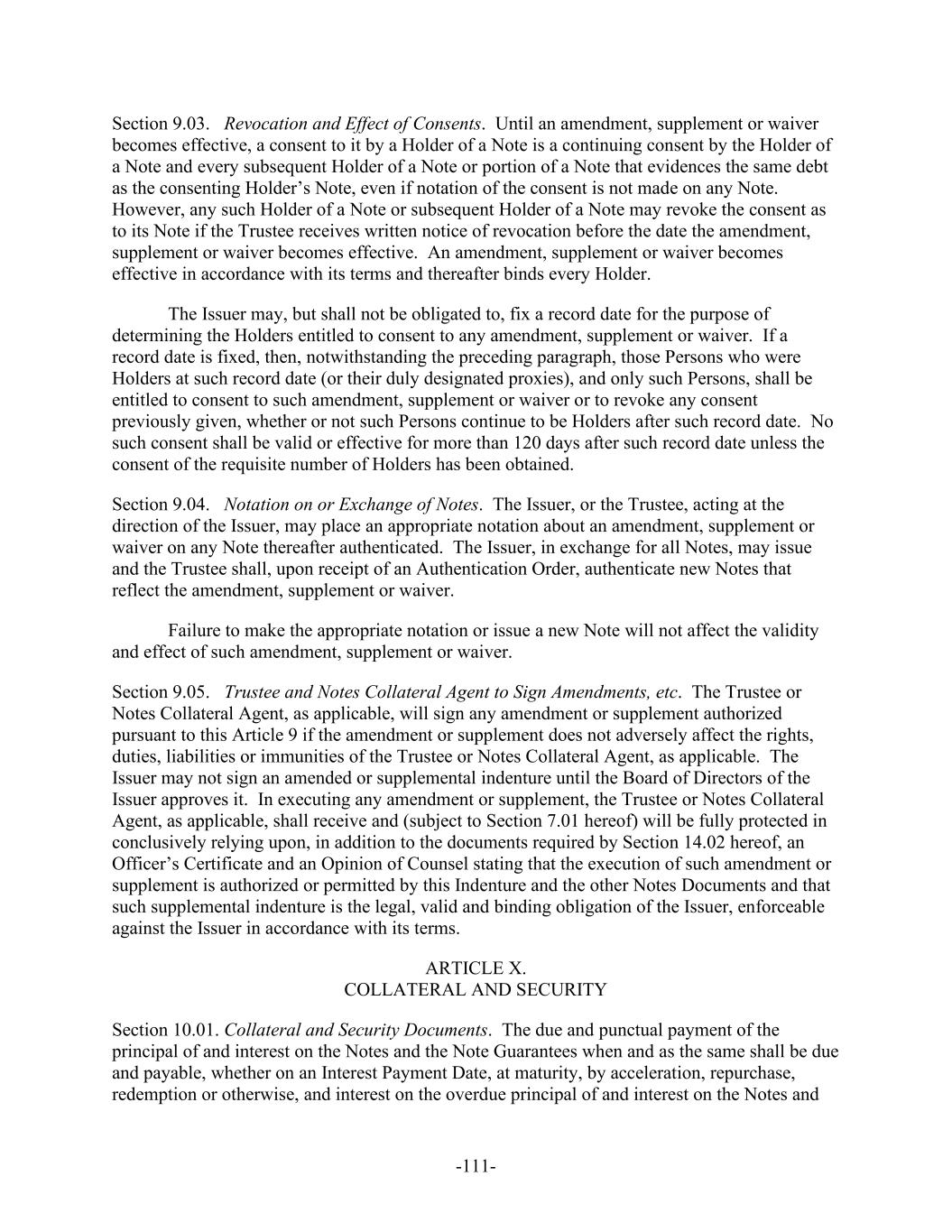 -111- Section 9.03. Revocation and Effect of Consents. Until an amendment, supplement or waiver becomes effective, a consent to it by a Holder of a Note is a continuing consent by the Holder of a Note and every subsequent Holder of a Note or portion of a Note that evidences the same debt as the consenting Holder’s Note, even if notation of the consent is not made on any Note. However, any such Holder of a Note or subsequent Holder of a Note may revoke the consent as to its Note if the Trustee receives written notice of revocation before the date the amendment, supplement or waiver becomes effective. An amendment, supplement or waiver becomes effective in accordance with its terms and thereafter binds every Holder. The Issuer may, but shall not be obligated to, fix a record date for the purpose of determining the Holders entitled to consent to any amendment, supplement or waiver. If a record date is fixed, then, notwithstanding the preceding paragraph, those Persons who were Holders at such record date (or their duly designated proxies), and only such Persons, shall be entitled to consent to such amendment, supplement or waiver or to revoke any consent previously given, whether or not such Persons continue to be Holders after such record date. No such consent shall be valid or effective for more than 120 days after such record date unless the consent of the requisite number of Holders has been obtained. Section 9.04. Notation on or Exchange of Notes. The Issuer, or the Trustee, acting at the direction of the Issuer, may place an appropriate notation about an amendment, supplement or waiver on any Note thereafter authenticated. The Issuer, in exchange for all Notes, may issue and the Trustee shall, upon receipt of an Authentication Order, authenticate new Notes that reflect the amendment, supplement or waiver. Failure to make the appropriate notation or issue a new Note will not affect the validity and effect of such amendment, supplement or waiver. Section 9.05. Trustee and Notes Collateral Agent to Sign Amendments, etc. The Trustee or Notes Collateral Agent, as applicable, will sign any amendment or supplement authorized pursuant to this Article 9 if the amendment or supplement does not adversely affect the rights, duties, liabilities or immunities of the Trustee or Notes Collateral Agent, as applicable. The Issuer may not sign an amended or supplemental indenture until the Board of Directors of the Issuer approves it. In executing any amendment or supplement, the Trustee or Notes Collateral Agent, as applicable, shall receive and (subject to Section 7.01 hereof) will be fully protected in conclusively relying upon, in addition to the documents required by Section 14.02 hereof, an Officer’s Certificate and an Opinion of Counsel stating that the execution of such amendment or supplement is authorized or permitted by this Indenture and the other Notes Documents and that such supplemental indenture is the legal, valid and binding obligation of the Issuer, enforceable against the Issuer in accordance with its terms. ARTICLE X. COLLATERAL AND SECURITY Section 10.01. Collateral and Security Documents. The due and punctual payment of the principal of and interest on the Notes and the Note Guarantees when and as the same shall be due and payable, whether on an Interest Payment Date, at maturity, by acceleration, repurchase, redemption or otherwise, and interest on the overdue principal of and interest on the Notes and