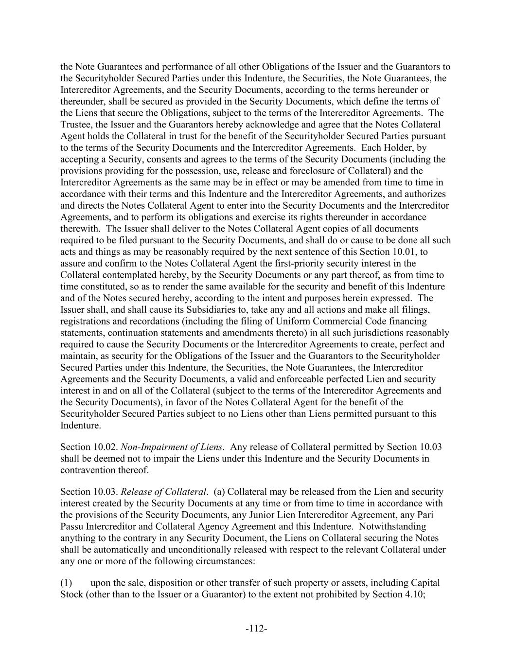 -112- the Note Guarantees and performance of all other Obligations of the Issuer and the Guarantors to the Securityholder Secured Parties under this Indenture, the Securities, the Note Guarantees, the Intercreditor Agreements, and the Security Documents, according to the terms hereunder or thereunder, shall be secured as provided in the Security Documents, which define the terms of the Liens that secure the Obligations, subject to the terms of the Intercreditor Agreements. The Trustee, the Issuer and the Guarantors hereby acknowledge and agree that the Notes Collateral Agent holds the Collateral in trust for the benefit of the Securityholder Secured Parties pursuant to the terms of the Security Documents and the Intercreditor Agreements. Each Holder, by accepting a Security, consents and agrees to the terms of the Security Documents (including the provisions providing for the possession, use, release and foreclosure of Collateral) and the Intercreditor Agreements as the same may be in effect or may be amended from time to time in accordance with their terms and this Indenture and the Intercreditor Agreements, and authorizes and directs the Notes Collateral Agent to enter into the Security Documents and the Intercreditor Agreements, and to perform its obligations and exercise its rights thereunder in accordance therewith. The Issuer shall deliver to the Notes Collateral Agent copies of all documents required to be filed pursuant to the Security Documents, and shall do or cause to be done all such acts and things as may be reasonably required by the next sentence of this Section 10.01, to assure and confirm to the Notes Collateral Agent the first-priority security interest in the Collateral contemplated hereby, by the Security Documents or any part thereof, as from time to time constituted, so as to render the same available for the security and benefit of this Indenture and of the Notes secured hereby, according to the intent and purposes herein expressed. The Issuer shall, and shall cause its Subsidiaries to, take any and all actions and make all filings, registrations and recordations (including the filing of Uniform Commercial Code financing statements, continuation statements and amendments thereto) in all such jurisdictions reasonably required to cause the Security Documents or the Intercreditor Agreements to create, perfect and maintain, as security for the Obligations of the Issuer and the Guarantors to the Securityholder Secured Parties under this Indenture, the Securities, the Note Guarantees, the Intercreditor Agreements and the Security Documents, a valid and enforceable perfected Lien and security interest in and on all of the Collateral (subject to the terms of the Intercreditor Agreements and the Security Documents), in favor of the Notes Collateral Agent for the benefit of the Securityholder Secured Parties subject to no Liens other than Liens permitted pursuant to this Indenture. Section 10.02. Non-Impairment of Liens. Any release of Collateral permitted by Section 10.03 shall be deemed not to impair the Liens under this Indenture and the Security Documents in contravention thereof. Section 10.03. Release of Collateral. (a) Collateral may be released from the Lien and security interest created by the Security Documents at any time or from time to time in accordance with the provisions of the Security Documents, any Junior Lien Intercreditor Agreement, any Pari Passu Intercreditor and Collateral Agency Agreement and this Indenture. Notwithstanding anything to the contrary in any Security Document, the Liens on Collateral securing the Notes shall be automatically and unconditionally released with respect to the relevant Collateral under any one or more of the following circumstances: (1) upon the sale, disposition or other transfer of such property or assets, including Capital Stock (other than to the Issuer or a Guarantor) to the extent not prohibited by Section 4.10;