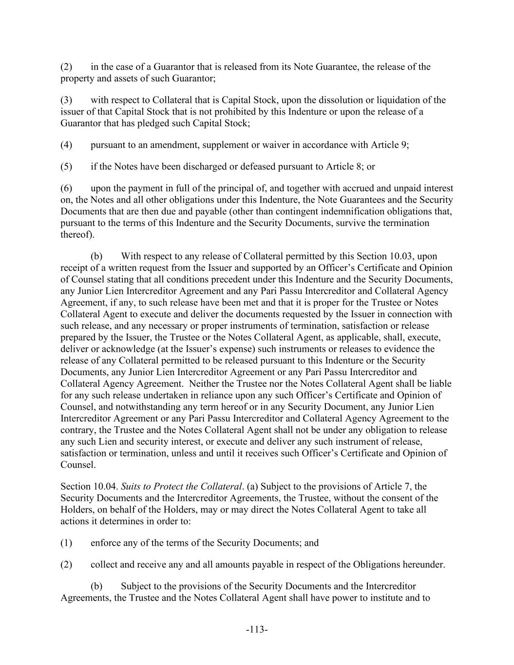 -113- (2) in the case of a Guarantor that is released from its Note Guarantee, the release of the property and assets of such Guarantor; (3) with respect to Collateral that is Capital Stock, upon the dissolution or liquidation of the issuer of that Capital Stock that is not prohibited by this Indenture or upon the release of a Guarantor that has pledged such Capital Stock; (4) pursuant to an amendment, supplement or waiver in accordance with Article 9; (5) if the Notes have been discharged or defeased pursuant to Article 8; or (6) upon the payment in full of the principal of, and together with accrued and unpaid interest on, the Notes and all other obligations under this Indenture, the Note Guarantees and the Security Documents that are then due and payable (other than contingent indemnification obligations that, pursuant to the terms of this Indenture and the Security Documents, survive the termination thereof). (b) With respect to any release of Collateral permitted by this Section 10.03, upon receipt of a written request from the Issuer and supported by an Officer’s Certificate and Opinion of Counsel stating that all conditions precedent under this Indenture and the Security Documents, any Junior Lien Intercreditor Agreement and any Pari Passu Intercreditor and Collateral Agency Agreement, if any, to such release have been met and that it is proper for the Trustee or Notes Collateral Agent to execute and deliver the documents requested by the Issuer in connection with such release, and any necessary or proper instruments of termination, satisfaction or release prepared by the Issuer, the Trustee or the Notes Collateral Agent, as applicable, shall, execute, deliver or acknowledge (at the Issuer’s expense) such instruments or releases to evidence the release of any Collateral permitted to be released pursuant to this Indenture or the Security Documents, any Junior Lien Intercreditor Agreement or any Pari Passu Intercreditor and Collateral Agency Agreement. Neither the Trustee nor the Notes Collateral Agent shall be liable for any such release undertaken in reliance upon any such Officer’s Certificate and Opinion of Counsel, and notwithstanding any term hereof or in any Security Document, any Junior Lien Intercreditor Agreement or any Pari Passu Intercreditor and Collateral Agency Agreement to the contrary, the Trustee and the Notes Collateral Agent shall not be under any obligation to release any such Lien and security interest, or execute and deliver any such instrument of release, satisfaction or termination, unless and until it receives such Officer’s Certificate and Opinion of Counsel. Section 10.04. Suits to Protect the Collateral. (a) Subject to the provisions of Article 7, the Security Documents and the Intercreditor Agreements, the Trustee, without the consent of the Holders, on behalf of the Holders, may or may direct the Notes Collateral Agent to take all actions it determines in order to: (1) enforce any of the terms of the Security Documents; and (2) collect and receive any and all amounts payable in respect of the Obligations hereunder. (b) Subject to the provisions of the Security Documents and the Intercreditor Agreements, the Trustee and the Notes Collateral Agent shall have power to institute and to