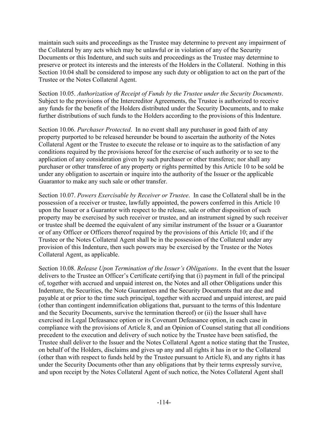 -114- maintain such suits and proceedings as the Trustee may determine to prevent any impairment of the Collateral by any acts which may be unlawful or in violation of any of the Security Documents or this Indenture, and such suits and proceedings as the Trustee may determine to preserve or protect its interests and the interests of the Holders in the Collateral. Nothing in this Section 10.04 shall be considered to impose any such duty or obligation to act on the part of the Trustee or the Notes Collateral Agent. Section 10.05. Authorization of Receipt of Funds by the Trustee under the Security Documents. Subject to the provisions of the Intercreditor Agreements, the Trustee is authorized to receive any funds for the benefit of the Holders distributed under the Security Documents, and to make further distributions of such funds to the Holders according to the provisions of this Indenture. Section 10.06. Purchaser Protected. In no event shall any purchaser in good faith of any property purported to be released hereunder be bound to ascertain the authority of the Notes Collateral Agent or the Trustee to execute the release or to inquire as to the satisfaction of any conditions required by the provisions hereof for the exercise of such authority or to see to the application of any consideration given by such purchaser or other transferee; nor shall any purchaser or other transferee of any property or rights permitted by this Article 10 to be sold be under any obligation to ascertain or inquire into the authority of the Issuer or the applicable Guarantor to make any such sale or other transfer. Section 10.07. Powers Exercisable by Receiver or Trustee. In case the Collateral shall be in the possession of a receiver or trustee, lawfully appointed, the powers conferred in this Article 10 upon the Issuer or a Guarantor with respect to the release, sale or other disposition of such property may be exercised by such receiver or trustee, and an instrument signed by such receiver or trustee shall be deemed the equivalent of any similar instrument of the Issuer or a Guarantor or of any Officer or Officers thereof required by the provisions of this Article 10; and if the Trustee or the Notes Collateral Agent shall be in the possession of the Collateral under any provision of this Indenture, then such powers may be exercised by the Trustee or the Notes Collateral Agent, as applicable. Section 10.08. Release Upon Termination of the Issuer’s Obligations. In the event that the Issuer delivers to the Trustee an Officer’s Certificate certifying that (i) payment in full of the principal of, together with accrued and unpaid interest on, the Notes and all other Obligations under this Indenture, the Securities, the Note Guarantees and the Security Documents that are due and payable at or prior to the time such principal, together with accrued and unpaid interest, are paid (other than contingent indemnification obligations that, pursuant to the terms of this Indenture and the Security Documents, survive the termination thereof) or (ii) the Issuer shall have exercised its Legal Defeasance option or its Covenant Defeasance option, in each case in compliance with the provisions of Article 8, and an Opinion of Counsel stating that all conditions precedent to the execution and delivery of such notice by the Trustee have been satisfied, the Trustee shall deliver to the Issuer and the Notes Collateral Agent a notice stating that the Trustee, on behalf of the Holders, disclaims and gives up any and all rights it has in or to the Collateral (other than with respect to funds held by the Trustee pursuant to Article 8), and any rights it has under the Security Documents other than any obligations that by their terms expressly survive, and upon receipt by the Notes Collateral Agent of such notice, the Notes Collateral Agent shall