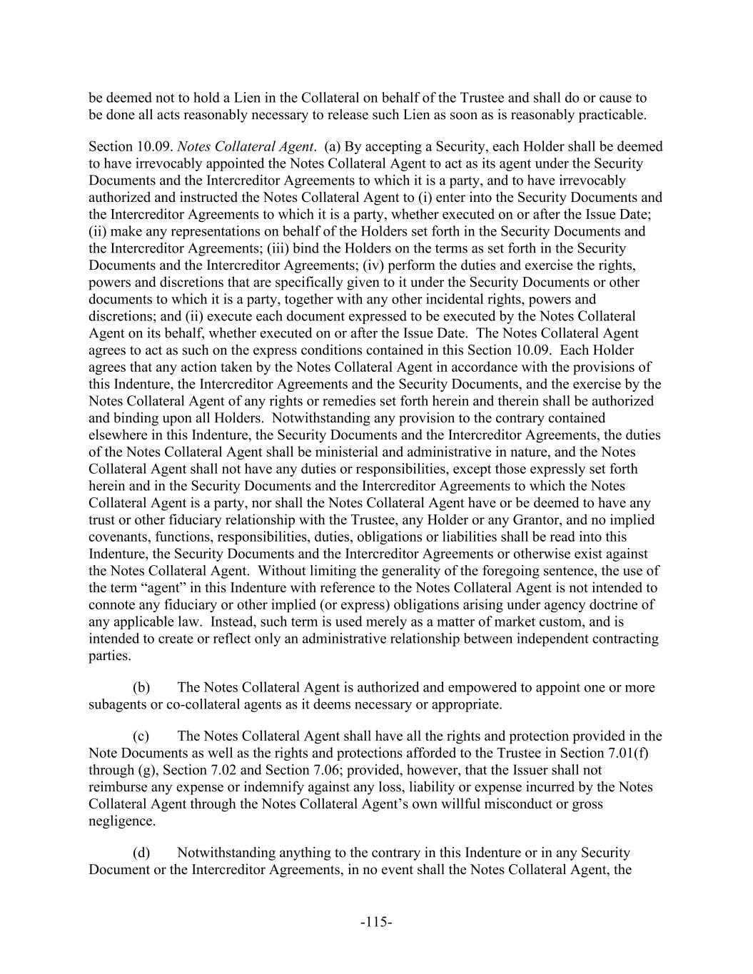 -115- be deemed not to hold a Lien in the Collateral on behalf of the Trustee and shall do or cause to be done all acts reasonably necessary to release such Lien as soon as is reasonably practicable. Section 10.09. Notes Collateral Agent. (a) By accepting a Security, each Holder shall be deemed to have irrevocably appointed the Notes Collateral Agent to act as its agent under the Security Documents and the Intercreditor Agreements to which it is a party, and to have irrevocably authorized and instructed the Notes Collateral Agent to (i) enter into the Security Documents and the Intercreditor Agreements to which it is a party, whether executed on or after the Issue Date; (ii) make any representations on behalf of the Holders set forth in the Security Documents and the Intercreditor Agreements; (iii) bind the Holders on the terms as set forth in the Security Documents and the Intercreditor Agreements; (iv) perform the duties and exercise the rights, powers and discretions that are specifically given to it under the Security Documents or other documents to which it is a party, together with any other incidental rights, powers and discretions; and (ii) execute each document expressed to be executed by the Notes Collateral Agent on its behalf, whether executed on or after the Issue Date. The Notes Collateral Agent agrees to act as such on the express conditions contained in this Section 10.09. Each Holder agrees that any action taken by the Notes Collateral Agent in accordance with the provisions of this Indenture, the Intercreditor Agreements and the Security Documents, and the exercise by the Notes Collateral Agent of any rights or remedies set forth herein and therein shall be authorized and binding upon all Holders. Notwithstanding any provision to the contrary contained elsewhere in this Indenture, the Security Documents and the Intercreditor Agreements, the duties of the Notes Collateral Agent shall be ministerial and administrative in nature, and the Notes Collateral Agent shall not have any duties or responsibilities, except those expressly set forth herein and in the Security Documents and the Intercreditor Agreements to which the Notes Collateral Agent is a party, nor shall the Notes Collateral Agent have or be deemed to have any trust or other fiduciary relationship with the Trustee, any Holder or any Grantor, and no implied covenants, functions, responsibilities, duties, obligations or liabilities shall be read into this Indenture, the Security Documents and the Intercreditor Agreements or otherwise exist against the Notes Collateral Agent. Without limiting the generality of the foregoing sentence, the use of the term “agent” in this Indenture with reference to the Notes Collateral Agent is not intended to connote any fiduciary or other implied (or express) obligations arising under agency doctrine of any applicable law. Instead, such term is used merely as a matter of market custom, and is intended to create or reflect only an administrative relationship between independent contracting parties. (b) The Notes Collateral Agent is authorized and empowered to appoint one or more subagents or co-collateral agents as it deems necessary or appropriate. (c) The Notes Collateral Agent shall have all the rights and protection provided in the Note Documents as well as the rights and protections afforded to the Trustee in Section 7.01(f) through (g), Section 7.02 and Section 7.06; provided, however, that the Issuer shall not reimburse any expense or indemnify against any loss, liability or expense incurred by the Notes Collateral Agent through the Notes Collateral Agent’s own willful misconduct or gross negligence. (d) Notwithstanding anything to the contrary in this Indenture or in any Security Document or the Intercreditor Agreements, in no event shall the Notes Collateral Agent, the