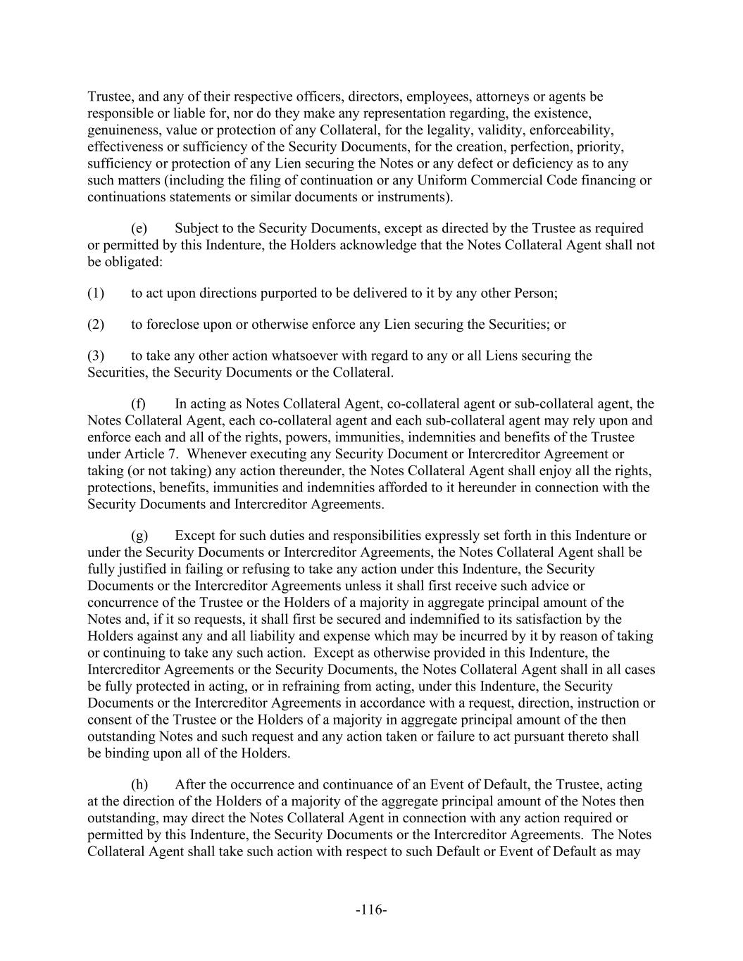 -116- Trustee, and any of their respective officers, directors, employees, attorneys or agents be responsible or liable for, nor do they make any representation regarding, the existence, genuineness, value or protection of any Collateral, for the legality, validity, enforceability, effectiveness or sufficiency of the Security Documents, for the creation, perfection, priority, sufficiency or protection of any Lien securing the Notes or any defect or deficiency as to any such matters (including the filing of continuation or any Uniform Commercial Code financing or continuations statements or similar documents or instruments). (e) Subject to the Security Documents, except as directed by the Trustee as required or permitted by this Indenture, the Holders acknowledge that the Notes Collateral Agent shall not be obligated: (1) to act upon directions purported to be delivered to it by any other Person; (2) to foreclose upon or otherwise enforce any Lien securing the Securities; or (3) to take any other action whatsoever with regard to any or all Liens securing the Securities, the Security Documents or the Collateral. (f) In acting as Notes Collateral Agent, co-collateral agent or sub-collateral agent, the Notes Collateral Agent, each co-collateral agent and each sub-collateral agent may rely upon and enforce each and all of the rights, powers, immunities, indemnities and benefits of the Trustee under Article 7. Whenever executing any Security Document or Intercreditor Agreement or taking (or not taking) any action thereunder, the Notes Collateral Agent shall enjoy all the rights, protections, benefits, immunities and indemnities afforded to it hereunder in connection with the Security Documents and Intercreditor Agreements. (g) Except for such duties and responsibilities expressly set forth in this Indenture or under the Security Documents or Intercreditor Agreements, the Notes Collateral Agent shall be fully justified in failing or refusing to take any action under this Indenture, the Security Documents or the Intercreditor Agreements unless it shall first receive such advice or concurrence of the Trustee or the Holders of a majority in aggregate principal amount of the Notes and, if it so requests, it shall first be secured and indemnified to its satisfaction by the Holders against any and all liability and expense which may be incurred by it by reason of taking or continuing to take any such action. Except as otherwise provided in this Indenture, the Intercreditor Agreements or the Security Documents, the Notes Collateral Agent shall in all cases be fully protected in acting, or in refraining from acting, under this Indenture, the Security Documents or the Intercreditor Agreements in accordance with a request, direction, instruction or consent of the Trustee or the Holders of a majority in aggregate principal amount of the then outstanding Notes and such request and any action taken or failure to act pursuant thereto shall be binding upon all of the Holders. (h) After the occurrence and continuance of an Event of Default, the Trustee, acting at the direction of the Holders of a majority of the aggregate principal amount of the Notes then outstanding, may direct the Notes Collateral Agent in connection with any action required or permitted by this Indenture, the Security Documents or the Intercreditor Agreements. The Notes Collateral Agent shall take such action with respect to such Default or Event of Default as may