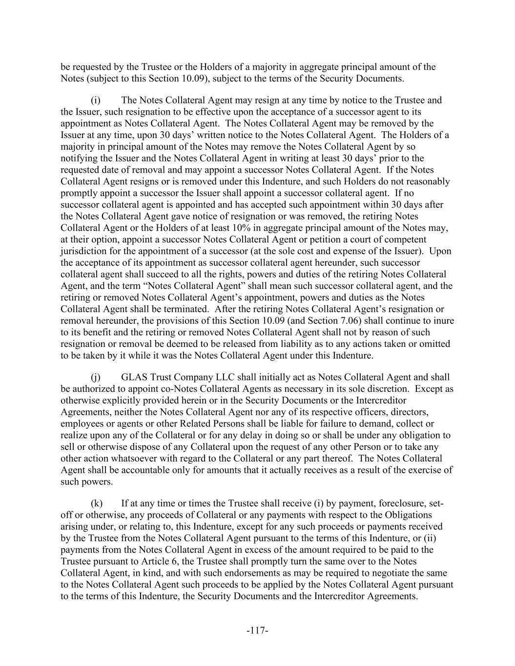 -117- be requested by the Trustee or the Holders of a majority in aggregate principal amount of the Notes (subject to this Section 10.09), subject to the terms of the Security Documents. (i) The Notes Collateral Agent may resign at any time by notice to the Trustee and the Issuer, such resignation to be effective upon the acceptance of a successor agent to its appointment as Notes Collateral Agent. The Notes Collateral Agent may be removed by the Issuer at any time, upon 30 days’ written notice to the Notes Collateral Agent. The Holders of a majority in principal amount of the Notes may remove the Notes Collateral Agent by so notifying the Issuer and the Notes Collateral Agent in writing at least 30 days’ prior to the requested date of removal and may appoint a successor Notes Collateral Agent. If the Notes Collateral Agent resigns or is removed under this Indenture, and such Holders do not reasonably promptly appoint a successor the Issuer shall appoint a successor collateral agent. If no successor collateral agent is appointed and has accepted such appointment within 30 days after the Notes Collateral Agent gave notice of resignation or was removed, the retiring Notes Collateral Agent or the Holders of at least 10% in aggregate principal amount of the Notes may, at their option, appoint a successor Notes Collateral Agent or petition a court of competent jurisdiction for the appointment of a successor (at the sole cost and expense of the Issuer). Upon the acceptance of its appointment as successor collateral agent hereunder, such successor collateral agent shall succeed to all the rights, powers and duties of the retiring Notes Collateral Agent, and the term “Notes Collateral Agent” shall mean such successor collateral agent, and the retiring or removed Notes Collateral Agent’s appointment, powers and duties as the Notes Collateral Agent shall be terminated. After the retiring Notes Collateral Agent’s resignation or removal hereunder, the provisions of this Section 10.09 (and Section 7.06) shall continue to inure to its benefit and the retiring or removed Notes Collateral Agent shall not by reason of such resignation or removal be deemed to be released from liability as to any actions taken or omitted to be taken by it while it was the Notes Collateral Agent under this Indenture. (j) GLAS Trust Company LLC shall initially act as Notes Collateral Agent and shall be authorized to appoint co-Notes Collateral Agents as necessary in its sole discretion. Except as otherwise explicitly provided herein or in the Security Documents or the Intercreditor Agreements, neither the Notes Collateral Agent nor any of its respective officers, directors, employees or agents or other Related Persons shall be liable for failure to demand, collect or realize upon any of the Collateral or for any delay in doing so or shall be under any obligation to sell or otherwise dispose of any Collateral upon the request of any other Person or to take any other action whatsoever with regard to the Collateral or any part thereof. The Notes Collateral Agent shall be accountable only for amounts that it actually receives as a result of the exercise of such powers. (k) If at any time or times the Trustee shall receive (i) by payment, foreclosure, set- off or otherwise, any proceeds of Collateral or any payments with respect to the Obligations arising under, or relating to, this Indenture, except for any such proceeds or payments received by the Trustee from the Notes Collateral Agent pursuant to the terms of this Indenture, or (ii) payments from the Notes Collateral Agent in excess of the amount required to be paid to the Trustee pursuant to Article 6, the Trustee shall promptly turn the same over to the Notes Collateral Agent, in kind, and with such endorsements as may be required to negotiate the same to the Notes Collateral Agent such proceeds to be applied by the Notes Collateral Agent pursuant to the terms of this Indenture, the Security Documents and the Intercreditor Agreements.