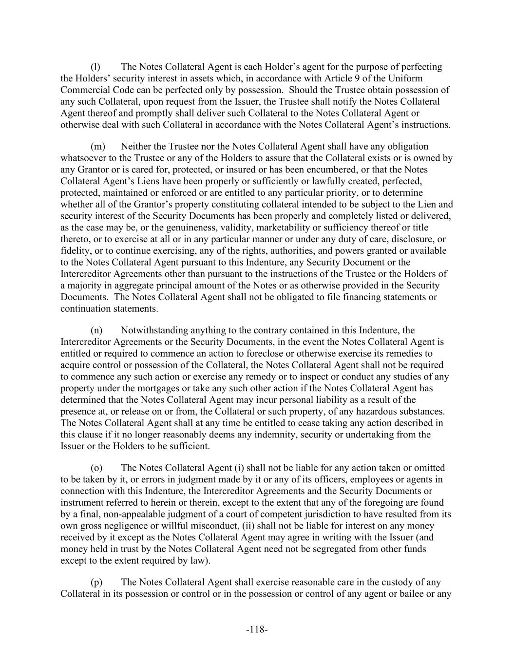 -118- (l) The Notes Collateral Agent is each Holder’s agent for the purpose of perfecting the Holders’ security interest in assets which, in accordance with Article 9 of the Uniform Commercial Code can be perfected only by possession. Should the Trustee obtain possession of any such Collateral, upon request from the Issuer, the Trustee shall notify the Notes Collateral Agent thereof and promptly shall deliver such Collateral to the Notes Collateral Agent or otherwise deal with such Collateral in accordance with the Notes Collateral Agent’s instructions. (m) Neither the Trustee nor the Notes Collateral Agent shall have any obligation whatsoever to the Trustee or any of the Holders to assure that the Collateral exists or is owned by any Grantor or is cared for, protected, or insured or has been encumbered, or that the Notes Collateral Agent’s Liens have been properly or sufficiently or lawfully created, perfected, protected, maintained or enforced or are entitled to any particular priority, or to determine whether all of the Grantor’s property constituting collateral intended to be subject to the Lien and security interest of the Security Documents has been properly and completely listed or delivered, as the case may be, or the genuineness, validity, marketability or sufficiency thereof or title thereto, or to exercise at all or in any particular manner or under any duty of care, disclosure, or fidelity, or to continue exercising, any of the rights, authorities, and powers granted or available to the Notes Collateral Agent pursuant to this Indenture, any Security Document or the Intercreditor Agreements other than pursuant to the instructions of the Trustee or the Holders of a majority in aggregate principal amount of the Notes or as otherwise provided in the Security Documents. The Notes Collateral Agent shall not be obligated to file financing statements or continuation statements. (n) Notwithstanding anything to the contrary contained in this Indenture, the Intercreditor Agreements or the Security Documents, in the event the Notes Collateral Agent is entitled or required to commence an action to foreclose or otherwise exercise its remedies to acquire control or possession of the Collateral, the Notes Collateral Agent shall not be required to commence any such action or exercise any remedy or to inspect or conduct any studies of any property under the mortgages or take any such other action if the Notes Collateral Agent has determined that the Notes Collateral Agent may incur personal liability as a result of the presence at, or release on or from, the Collateral or such property, of any hazardous substances. The Notes Collateral Agent shall at any time be entitled to cease taking any action described in this clause if it no longer reasonably deems any indemnity, security or undertaking from the Issuer or the Holders to be sufficient. (o) The Notes Collateral Agent (i) shall not be liable for any action taken or omitted to be taken by it, or errors in judgment made by it or any of its officers, employees or agents in connection with this Indenture, the Intercreditor Agreements and the Security Documents or instrument referred to herein or therein, except to the extent that any of the foregoing are found by a final, non-appealable judgment of a court of competent jurisdiction to have resulted from its own gross negligence or willful misconduct, (ii) shall not be liable for interest on any money received by it except as the Notes Collateral Agent may agree in writing with the Issuer (and money held in trust by the Notes Collateral Agent need not be segregated from other funds except to the extent required by law). (p) The Notes Collateral Agent shall exercise reasonable care in the custody of any Collateral in its possession or control or in the possession or control of any agent or bailee or any