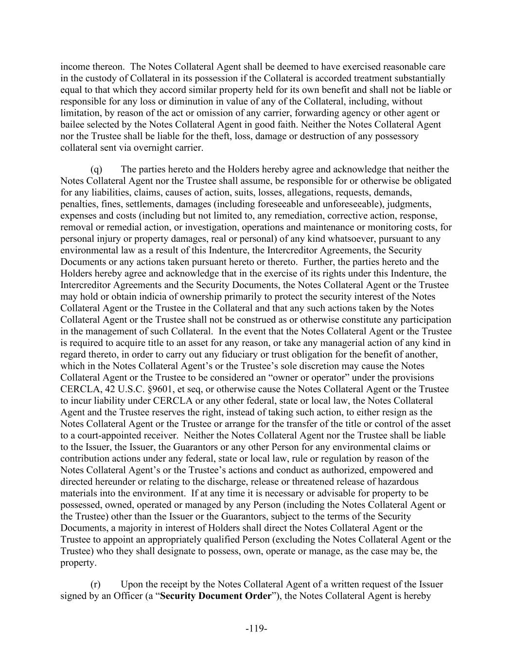 -119- income thereon. The Notes Collateral Agent shall be deemed to have exercised reasonable care in the custody of Collateral in its possession if the Collateral is accorded treatment substantially equal to that which they accord similar property held for its own benefit and shall not be liable or responsible for any loss or diminution in value of any of the Collateral, including, without limitation, by reason of the act or omission of any carrier, forwarding agency or other agent or bailee selected by the Notes Collateral Agent in good faith. Neither the Notes Collateral Agent nor the Trustee shall be liable for the theft, loss, damage or destruction of any possessory collateral sent via overnight carrier. (q) The parties hereto and the Holders hereby agree and acknowledge that neither the Notes Collateral Agent nor the Trustee shall assume, be responsible for or otherwise be obligated for any liabilities, claims, causes of action, suits, losses, allegations, requests, demands, penalties, fines, settlements, damages (including foreseeable and unforeseeable), judgments, expenses and costs (including but not limited to, any remediation, corrective action, response, removal or remedial action, or investigation, operations and maintenance or monitoring costs, for personal injury or property damages, real or personal) of any kind whatsoever, pursuant to any environmental law as a result of this Indenture, the Intercreditor Agreements, the Security Documents or any actions taken pursuant hereto or thereto. Further, the parties hereto and the Holders hereby agree and acknowledge that in the exercise of its rights under this Indenture, the Intercreditor Agreements and the Security Documents, the Notes Collateral Agent or the Trustee may hold or obtain indicia of ownership primarily to protect the security interest of the Notes Collateral Agent or the Trustee in the Collateral and that any such actions taken by the Notes Collateral Agent or the Trustee shall not be construed as or otherwise constitute any participation in the management of such Collateral. In the event that the Notes Collateral Agent or the Trustee is required to acquire title to an asset for any reason, or take any managerial action of any kind in regard thereto, in order to carry out any fiduciary or trust obligation for the benefit of another, which in the Notes Collateral Agent’s or the Trustee’s sole discretion may cause the Notes Collateral Agent or the Trustee to be considered an “owner or operator” under the provisions CERCLA, 42 U.S.C. §9601, et seq, or otherwise cause the Notes Collateral Agent or the Trustee to incur liability under CERCLA or any other federal, state or local law, the Notes Collateral Agent and the Trustee reserves the right, instead of taking such action, to either resign as the Notes Collateral Agent or the Trustee or arrange for the transfer of the title or control of the asset to a court-appointed receiver. Neither the Notes Collateral Agent nor the Trustee shall be liable to the Issuer, the Issuer, the Guarantors or any other Person for any environmental claims or contribution actions under any federal, state or local law, rule or regulation by reason of the Notes Collateral Agent’s or the Trustee’s actions and conduct as authorized, empowered and directed hereunder or relating to the discharge, release or threatened release of hazardous materials into the environment. If at any time it is necessary or advisable for property to be possessed, owned, operated or managed by any Person (including the Notes Collateral Agent or the Trustee) other than the Issuer or the Guarantors, subject to the terms of the Security Documents, a majority in interest of Holders shall direct the Notes Collateral Agent or the Trustee to appoint an appropriately qualified Person (excluding the Notes Collateral Agent or the Trustee) who they shall designate to possess, own, operate or manage, as the case may be, the property. (r) Upon the receipt by the Notes Collateral Agent of a written request of the Issuer signed by an Officer (a “Security Document Order”), the Notes Collateral Agent is hereby