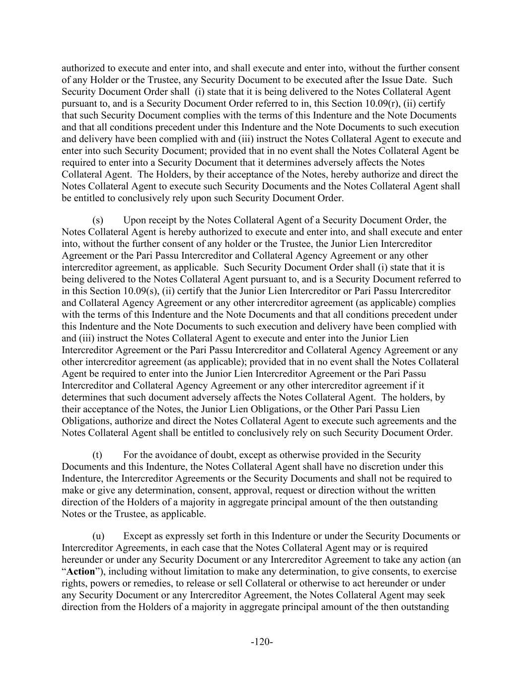 -120- authorized to execute and enter into, and shall execute and enter into, without the further consent of any Holder or the Trustee, any Security Document to be executed after the Issue Date. Such Security Document Order shall (i) state that it is being delivered to the Notes Collateral Agent pursuant to, and is a Security Document Order referred to in, this Section 10.09(r), (ii) certify that such Security Document complies with the terms of this Indenture and the Note Documents and that all conditions precedent under this Indenture and the Note Documents to such execution and delivery have been complied with and (iii) instruct the Notes Collateral Agent to execute and enter into such Security Document; provided that in no event shall the Notes Collateral Agent be required to enter into a Security Document that it determines adversely affects the Notes Collateral Agent. The Holders, by their acceptance of the Notes, hereby authorize and direct the Notes Collateral Agent to execute such Security Documents and the Notes Collateral Agent shall be entitled to conclusively rely upon such Security Document Order. (s) Upon receipt by the Notes Collateral Agent of a Security Document Order, the Notes Collateral Agent is hereby authorized to execute and enter into, and shall execute and enter into, without the further consent of any holder or the Trustee, the Junior Lien Intercreditor Agreement or the Pari Passu Intercreditor and Collateral Agency Agreement or any other intercreditor agreement, as applicable. Such Security Document Order shall (i) state that it is being delivered to the Notes Collateral Agent pursuant to, and is a Security Document referred to in this Section 10.09(s), (ii) certify that the Junior Lien Intercreditor or Pari Passu Intercreditor and Collateral Agency Agreement or any other intercreditor agreement (as applicable) complies with the terms of this Indenture and the Note Documents and that all conditions precedent under this Indenture and the Note Documents to such execution and delivery have been complied with and (iii) instruct the Notes Collateral Agent to execute and enter into the Junior Lien Intercreditor Agreement or the Pari Passu Intercreditor and Collateral Agency Agreement or any other intercreditor agreement (as applicable); provided that in no event shall the Notes Collateral Agent be required to enter into the Junior Lien Intercreditor Agreement or the Pari Passu Intercreditor and Collateral Agency Agreement or any other intercreditor agreement if it determines that such document adversely affects the Notes Collateral Agent. The holders, by their acceptance of the Notes, the Junior Lien Obligations, or the Other Pari Passu Lien Obligations, authorize and direct the Notes Collateral Agent to execute such agreements and the Notes Collateral Agent shall be entitled to conclusively rely on such Security Document Order. (t) For the avoidance of doubt, except as otherwise provided in the Security Documents and this Indenture, the Notes Collateral Agent shall have no discretion under this Indenture, the Intercreditor Agreements or the Security Documents and shall not be required to make or give any determination, consent, approval, request or direction without the written direction of the Holders of a majority in aggregate principal amount of the then outstanding Notes or the Trustee, as applicable. (u) Except as expressly set forth in this Indenture or under the Security Documents or Intercreditor Agreements, in each case that the Notes Collateral Agent may or is required hereunder or under any Security Document or any Intercreditor Agreement to take any action (an “Action”), including without limitation to make any determination, to give consents, to exercise rights, powers or remedies, to release or sell Collateral or otherwise to act hereunder or under any Security Document or any Intercreditor Agreement, the Notes Collateral Agent may seek direction from the Holders of a majority in aggregate principal amount of the then outstanding