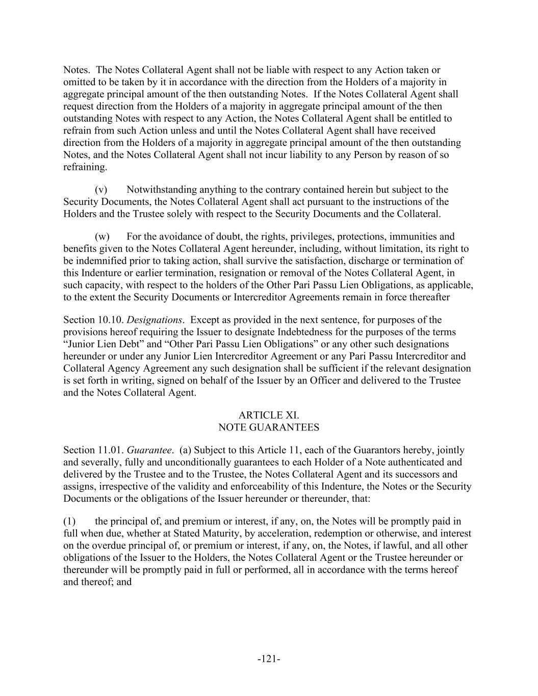 -121- Notes. The Notes Collateral Agent shall not be liable with respect to any Action taken or omitted to be taken by it in accordance with the direction from the Holders of a majority in aggregate principal amount of the then outstanding Notes. If the Notes Collateral Agent shall request direction from the Holders of a majority in aggregate principal amount of the then outstanding Notes with respect to any Action, the Notes Collateral Agent shall be entitled to refrain from such Action unless and until the Notes Collateral Agent shall have received direction from the Holders of a majority in aggregate principal amount of the then outstanding Notes, and the Notes Collateral Agent shall not incur liability to any Person by reason of so refraining. (v) Notwithstanding anything to the contrary contained herein but subject to the Security Documents, the Notes Collateral Agent shall act pursuant to the instructions of the Holders and the Trustee solely with respect to the Security Documents and the Collateral. (w) For the avoidance of doubt, the rights, privileges, protections, immunities and benefits given to the Notes Collateral Agent hereunder, including, without limitation, its right to be indemnified prior to taking action, shall survive the satisfaction, discharge or termination of this Indenture or earlier termination, resignation or removal of the Notes Collateral Agent, in such capacity, with respect to the holders of the Other Pari Passu Lien Obligations, as applicable, to the extent the Security Documents or Intercreditor Agreements remain in force thereafter Section 10.10. Designations. Except as provided in the next sentence, for purposes of the provisions hereof requiring the Issuer to designate Indebtedness for the purposes of the terms “Junior Lien Debt” and “Other Pari Passu Lien Obligations” or any other such designations hereunder or under any Junior Lien Intercreditor Agreement or any Pari Passu Intercreditor and Collateral Agency Agreement any such designation shall be sufficient if the relevant designation is set forth in writing, signed on behalf of the Issuer by an Officer and delivered to the Trustee and the Notes Collateral Agent. ARTICLE XI. NOTE GUARANTEES Section 11.01. Guarantee. (a) Subject to this Article 11, each of the Guarantors hereby, jointly and severally, fully and unconditionally guarantees to each Holder of a Note authenticated and delivered by the Trustee and to the Trustee, the Notes Collateral Agent and its successors and assigns, irrespective of the validity and enforceability of this Indenture, the Notes or the Security Documents or the obligations of the Issuer hereunder or thereunder, that: (1) the principal of, and premium or interest, if any, on, the Notes will be promptly paid in full when due, whether at Stated Maturity, by acceleration, redemption or otherwise, and interest on the overdue principal of, or premium or interest, if any, on, the Notes, if lawful, and all other obligations of the Issuer to the Holders, the Notes Collateral Agent or the Trustee hereunder or thereunder will be promptly paid in full or performed, all in accordance with the terms hereof and thereof; and