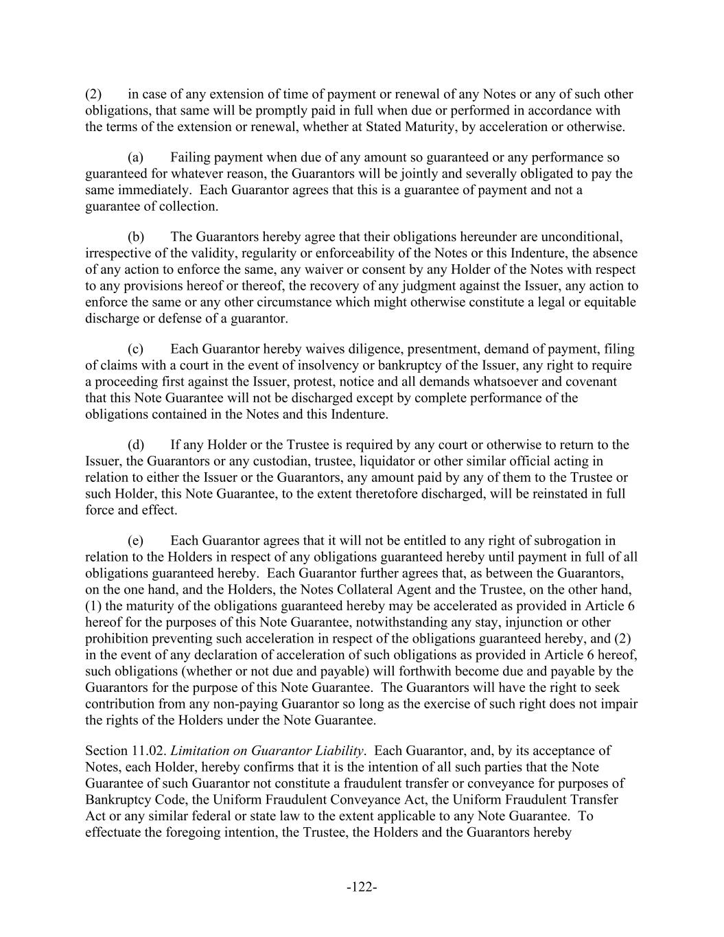 -122- (2) in case of any extension of time of payment or renewal of any Notes or any of such other obligations, that same will be promptly paid in full when due or performed in accordance with the terms of the extension or renewal, whether at Stated Maturity, by acceleration or otherwise. (a) Failing payment when due of any amount so guaranteed or any performance so guaranteed for whatever reason, the Guarantors will be jointly and severally obligated to pay the same immediately. Each Guarantor agrees that this is a guarantee of payment and not a guarantee of collection. (b) The Guarantors hereby agree that their obligations hereunder are unconditional, irrespective of the validity, regularity or enforceability of the Notes or this Indenture, the absence of any action to enforce the same, any waiver or consent by any Holder of the Notes with respect to any provisions hereof or thereof, the recovery of any judgment against the Issuer, any action to enforce the same or any other circumstance which might otherwise constitute a legal or equitable discharge or defense of a guarantor. (c) Each Guarantor hereby waives diligence, presentment, demand of payment, filing of claims with a court in the event of insolvency or bankruptcy of the Issuer, any right to require a proceeding first against the Issuer, protest, notice and all demands whatsoever and covenant that this Note Guarantee will not be discharged except by complete performance of the obligations contained in the Notes and this Indenture. (d) If any Holder or the Trustee is required by any court or otherwise to return to the Issuer, the Guarantors or any custodian, trustee, liquidator or other similar official acting in relation to either the Issuer or the Guarantors, any amount paid by any of them to the Trustee or such Holder, this Note Guarantee, to the extent theretofore discharged, will be reinstated in full force and effect. (e) Each Guarantor agrees that it will not be entitled to any right of subrogation in relation to the Holders in respect of any obligations guaranteed hereby until payment in full of all obligations guaranteed hereby. Each Guarantor further agrees that, as between the Guarantors, on the one hand, and the Holders, the Notes Collateral Agent and the Trustee, on the other hand, (1) the maturity of the obligations guaranteed hereby may be accelerated as provided in Article 6 hereof for the purposes of this Note Guarantee, notwithstanding any stay, injunction or other prohibition preventing such acceleration in respect of the obligations guaranteed hereby, and (2) in the event of any declaration of acceleration of such obligations as provided in Article 6 hereof, such obligations (whether or not due and payable) will forthwith become due and payable by the Guarantors for the purpose of this Note Guarantee. The Guarantors will have the right to seek contribution from any non-paying Guarantor so long as the exercise of such right does not impair the rights of the Holders under the Note Guarantee. Section 11.02. Limitation on Guarantor Liability. Each Guarantor, and, by its acceptance of Notes, each Holder, hereby confirms that it is the intention of all such parties that the Note Guarantee of such Guarantor not constitute a fraudulent transfer or conveyance for purposes of Bankruptcy Code, the Uniform Fraudulent Conveyance Act, the Uniform Fraudulent Transfer Act or any similar federal or state law to the extent applicable to any Note Guarantee. To effectuate the foregoing intention, the Trustee, the Holders and the Guarantors hereby
