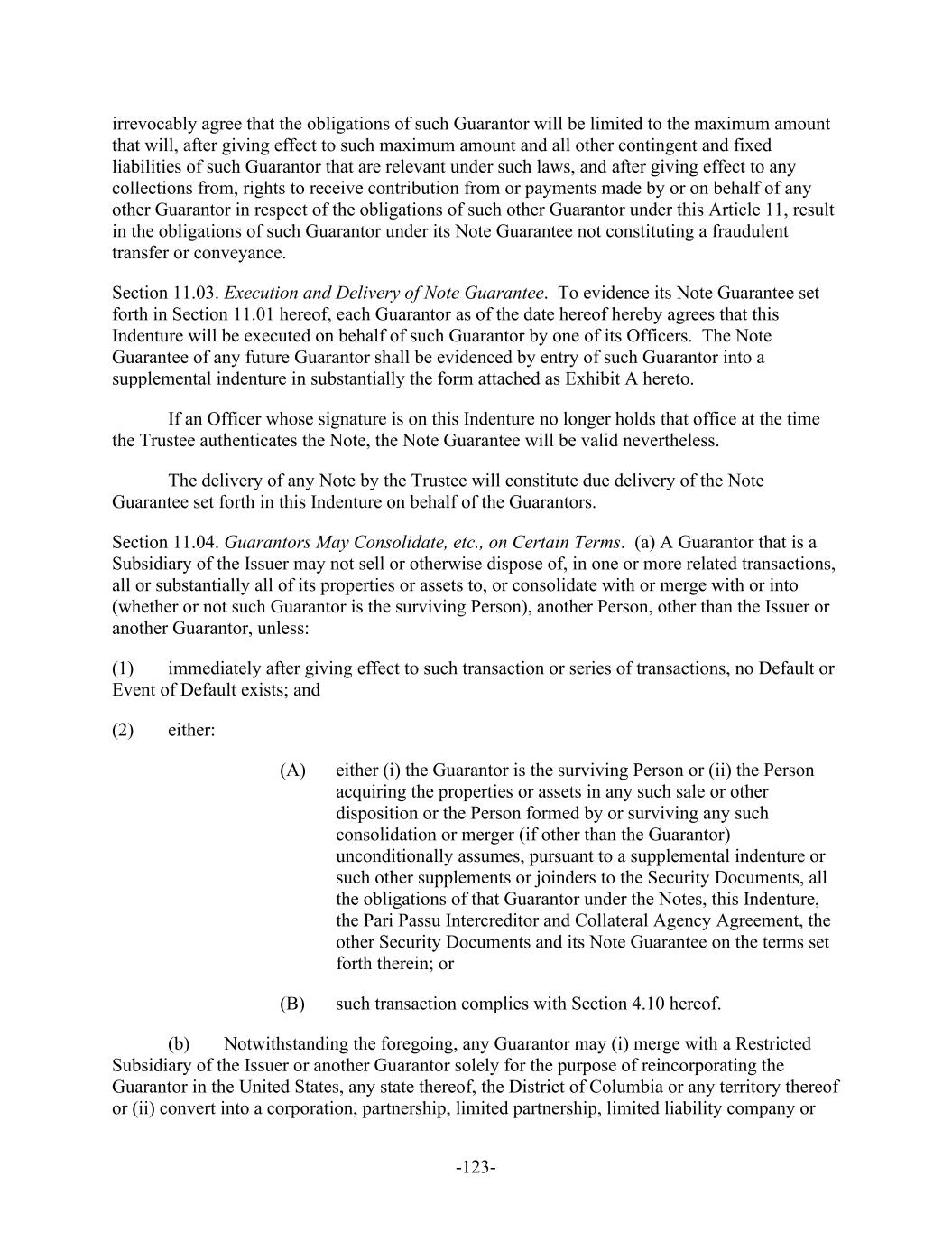 -123- irrevocably agree that the obligations of such Guarantor will be limited to the maximum amount that will, after giving effect to such maximum amount and all other contingent and fixed liabilities of such Guarantor that are relevant under such laws, and after giving effect to any collections from, rights to receive contribution from or payments made by or on behalf of any other Guarantor in respect of the obligations of such other Guarantor under this Article 11, result in the obligations of such Guarantor under its Note Guarantee not constituting a fraudulent transfer or conveyance. Section 11.03. Execution and Delivery of Note Guarantee. To evidence its Note Guarantee set forth in Section 11.01 hereof, each Guarantor as of the date hereof hereby agrees that this Indenture will be executed on behalf of such Guarantor by one of its Officers. The Note Guarantee of any future Guarantor shall be evidenced by entry of such Guarantor into a supplemental indenture in substantially the form attached as Exhibit A hereto. If an Officer whose signature is on this Indenture no longer holds that office at the time the Trustee authenticates the Note, the Note Guarantee will be valid nevertheless. The delivery of any Note by the Trustee will constitute due delivery of the Note Guarantee set forth in this Indenture on behalf of the Guarantors. Section 11.04. Guarantors May Consolidate, etc., on Certain Terms. (a) A Guarantor that is a Subsidiary of the Issuer may not sell or otherwise dispose of, in one or more related transactions, all or substantially all of its properties or assets to, or consolidate with or merge with or into (whether or not such Guarantor is the surviving Person), another Person, other than the Issuer or another Guarantor, unless: (1) immediately after giving effect to such transaction or series of transactions, no Default or Event of Default exists; and (2) either: (A) either (i) the Guarantor is the surviving Person or (ii) the Person acquiring the properties or assets in any such sale or other disposition or the Person formed by or surviving any such consolidation or merger (if other than the Guarantor) unconditionally assumes, pursuant to a supplemental indenture or such other supplements or joinders to the Security Documents, all the obligations of that Guarantor under the Notes, this Indenture, the Pari Passu Intercreditor and Collateral Agency Agreement, the other Security Documents and its Note Guarantee on the terms set forth therein; or (B) such transaction complies with Section 4.10 hereof. (b) Notwithstanding the foregoing, any Guarantor may (i) merge with a Restricted Subsidiary of the Issuer or another Guarantor solely for the purpose of reincorporating the Guarantor in the United States, any state thereof, the District of Columbia or any territory thereof or (ii) convert into a corporation, partnership, limited partnership, limited liability company or