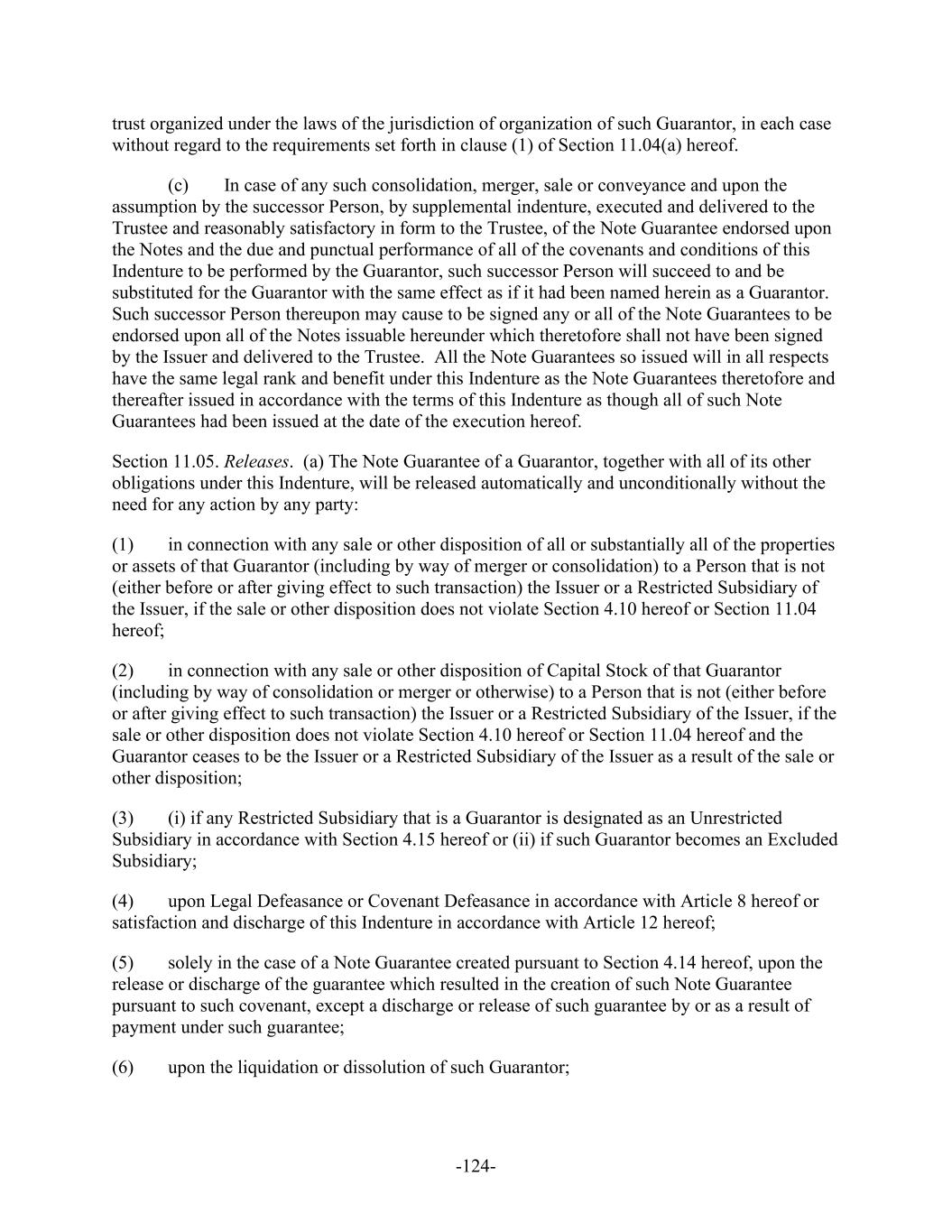 -124- trust organized under the laws of the jurisdiction of organization of such Guarantor, in each case without regard to the requirements set forth in clause (1) of Section 11.04(a) hereof. (c) In case of any such consolidation, merger, sale or conveyance and upon the assumption by the successor Person, by supplemental indenture, executed and delivered to the Trustee and reasonably satisfactory in form to the Trustee, of the Note Guarantee endorsed upon the Notes and the due and punctual performance of all of the covenants and conditions of this Indenture to be performed by the Guarantor, such successor Person will succeed to and be substituted for the Guarantor with the same effect as if it had been named herein as a Guarantor. Such successor Person thereupon may cause to be signed any or all of the Note Guarantees to be endorsed upon all of the Notes issuable hereunder which theretofore shall not have been signed by the Issuer and delivered to the Trustee. All the Note Guarantees so issued will in all respects have the same legal rank and benefit under this Indenture as the Note Guarantees theretofore and thereafter issued in accordance with the terms of this Indenture as though all of such Note Guarantees had been issued at the date of the execution hereof. Section 11.05. Releases. (a) The Note Guarantee of a Guarantor, together with all of its other obligations under this Indenture, will be released automatically and unconditionally without the need for any action by any party: (1) in connection with any sale or other disposition of all or substantially all of the properties or assets of that Guarantor (including by way of merger or consolidation) to a Person that is not (either before or after giving effect to such transaction) the Issuer or a Restricted Subsidiary of the Issuer, if the sale or other disposition does not violate Section 4.10 hereof or Section 11.04 hereof; (2) in connection with any sale or other disposition of Capital Stock of that Guarantor (including by way of consolidation or merger or otherwise) to a Person that is not (either before or after giving effect to such transaction) the Issuer or a Restricted Subsidiary of the Issuer, if the sale or other disposition does not violate Section 4.10 hereof or Section 11.04 hereof and the Guarantor ceases to be the Issuer or a Restricted Subsidiary of the Issuer as a result of the sale or other disposition; (3) (i) if any Restricted Subsidiary that is a Guarantor is designated as an Unrestricted Subsidiary in accordance with Section 4.15 hereof or (ii) if such Guarantor becomes an Excluded Subsidiary; (4) upon Legal Defeasance or Covenant Defeasance in accordance with Article 8 hereof or satisfaction and discharge of this Indenture in accordance with Article 12 hereof; (5) solely in the case of a Note Guarantee created pursuant to Section 4.14 hereof, upon the release or discharge of the guarantee which resulted in the creation of such Note Guarantee pursuant to such covenant, except a discharge or release of such guarantee by or as a result of payment under such guarantee; (6) upon the liquidation or dissolution of such Guarantor;