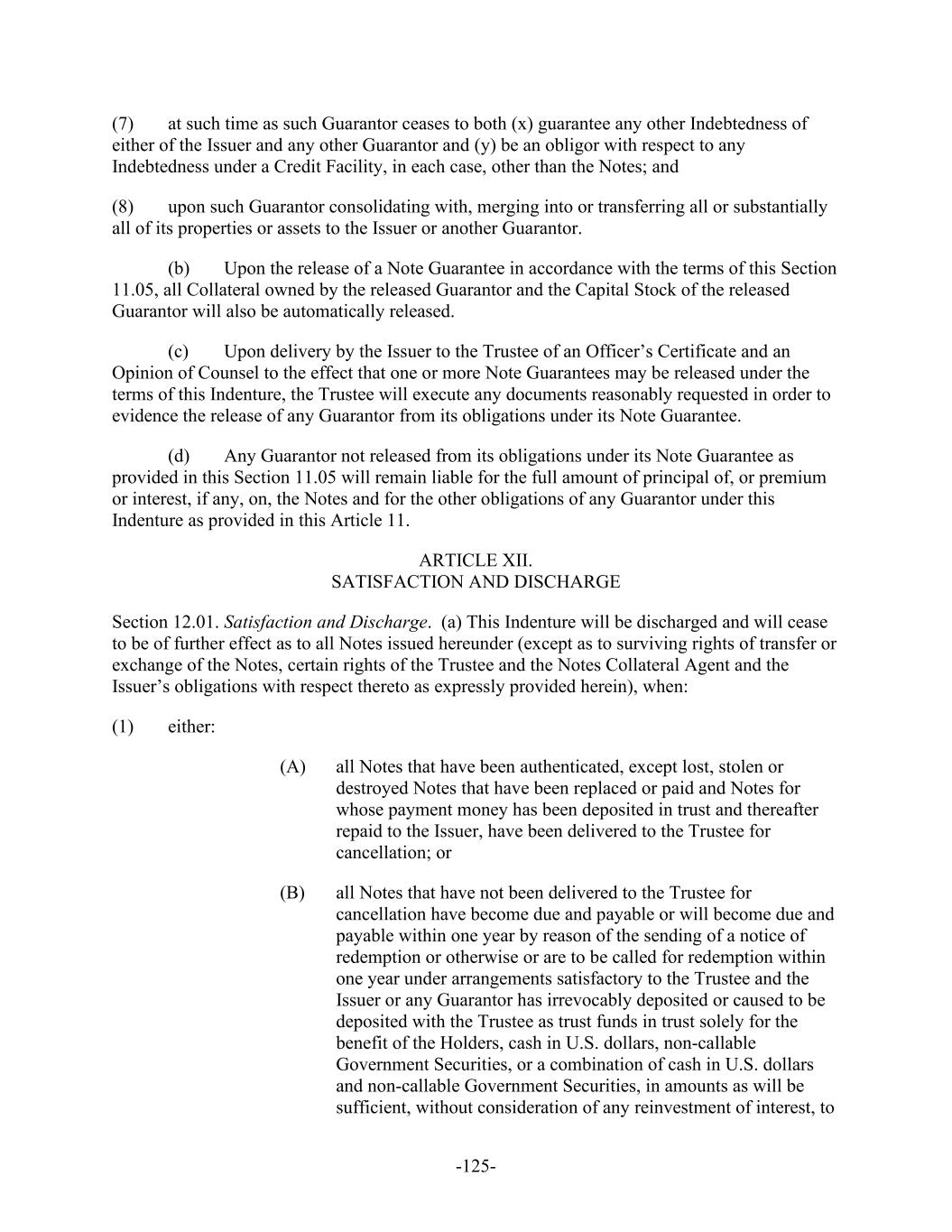 -125- (7) at such time as such Guarantor ceases to both (x) guarantee any other Indebtedness of either of the Issuer and any other Guarantor and (y) be an obligor with respect to any Indebtedness under a Credit Facility, in each case, other than the Notes; and (8) upon such Guarantor consolidating with, merging into or transferring all or substantially all of its properties or assets to the Issuer or another Guarantor. (b) Upon the release of a Note Guarantee in accordance with the terms of this Section 11.05, all Collateral owned by the released Guarantor and the Capital Stock of the released Guarantor will also be automatically released. (c) Upon delivery by the Issuer to the Trustee of an Officer’s Certificate and an Opinion of Counsel to the effect that one or more Note Guarantees may be released under the terms of this Indenture, the Trustee will execute any documents reasonably requested in order to evidence the release of any Guarantor from its obligations under its Note Guarantee. (d) Any Guarantor not released from its obligations under its Note Guarantee as provided in this Section 11.05 will remain liable for the full amount of principal of, or premium or interest, if any, on, the Notes and for the other obligations of any Guarantor under this Indenture as provided in this Article 11. ARTICLE XII. SATISFACTION AND DISCHARGE Section 12.01. Satisfaction and Discharge. (a) This Indenture will be discharged and will cease to be of further effect as to all Notes issued hereunder (except as to surviving rights of transfer or exchange of the Notes, certain rights of the Trustee and the Notes Collateral Agent and the Issuer’s obligations with respect thereto as expressly provided herein), when: (1) either: (A) all Notes that have been authenticated, except lost, stolen or destroyed Notes that have been replaced or paid and Notes for whose payment money has been deposited in trust and thereafter repaid to the Issuer, have been delivered to the Trustee for cancellation; or (B) all Notes that have not been delivered to the Trustee for cancellation have become due and payable or will become due and payable within one year by reason of the sending of a notice of redemption or otherwise or are to be called for redemption within one year under arrangements satisfactory to the Trustee and the Issuer or any Guarantor has irrevocably deposited or caused to be deposited with the Trustee as trust funds in trust solely for the benefit of the Holders, cash in U.S. dollars, non-callable Government Securities, or a combination of cash in U.S. dollars and non-callable Government Securities, in amounts as will be sufficient, without consideration of any reinvestment of interest, to