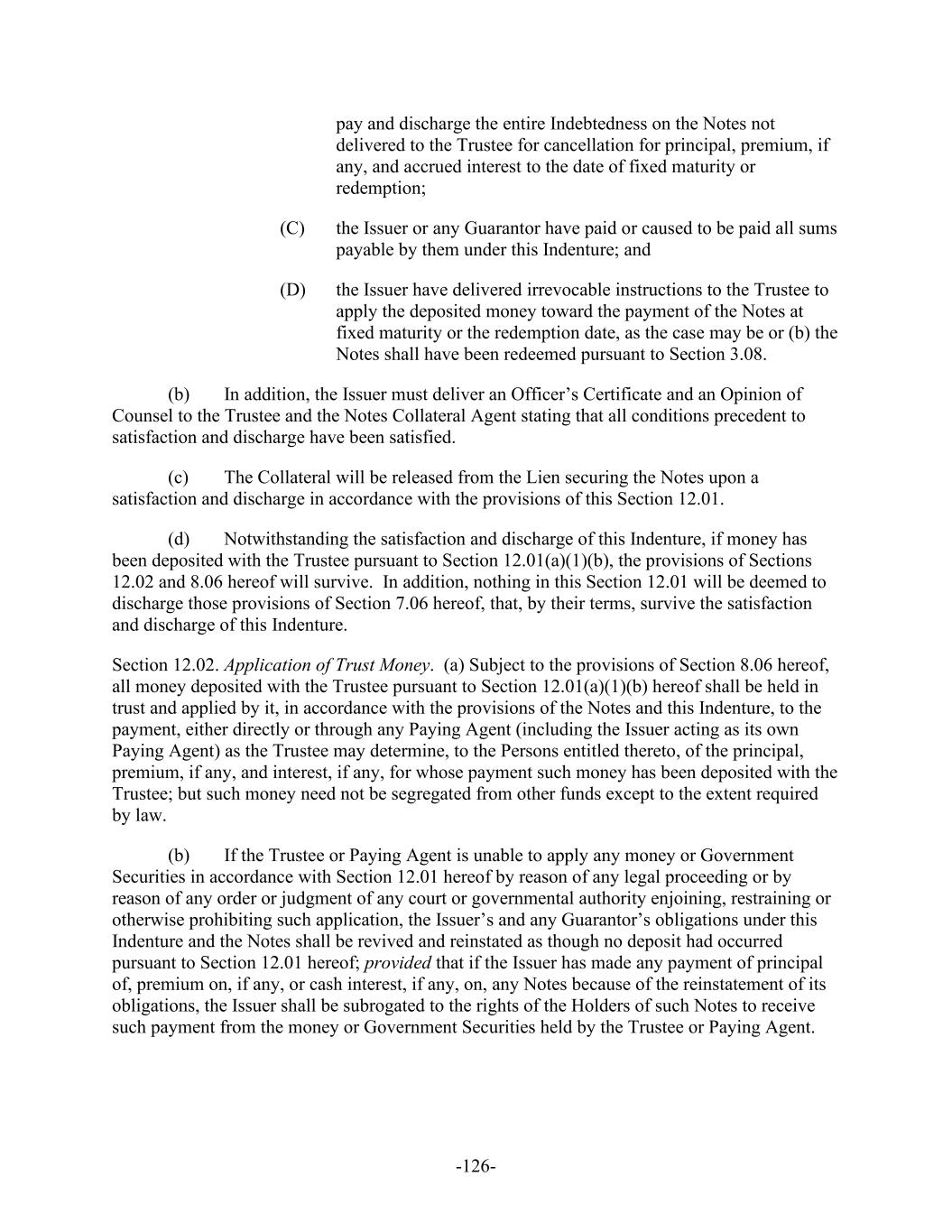 -126- pay and discharge the entire Indebtedness on the Notes not delivered to the Trustee for cancellation for principal, premium, if any, and accrued interest to the date of fixed maturity or redemption; (C) the Issuer or any Guarantor have paid or caused to be paid all sums payable by them under this Indenture; and (D) the Issuer have delivered irrevocable instructions to the Trustee to apply the deposited money toward the payment of the Notes at fixed maturity or the redemption date, as the case may be or (b) the Notes shall have been redeemed pursuant to Section 3.08. (b) In addition, the Issuer must deliver an Officer’s Certificate and an Opinion of Counsel to the Trustee and the Notes Collateral Agent stating that all conditions precedent to satisfaction and discharge have been satisfied. (c) The Collateral will be released from the Lien securing the Notes upon a satisfaction and discharge in accordance with the provisions of this Section 12.01. (d) Notwithstanding the satisfaction and discharge of this Indenture, if money has been deposited with the Trustee pursuant to Section 12.01(a)(1)(b), the provisions of Sections 12.02 and 8.06 hereof will survive. In addition, nothing in this Section 12.01 will be deemed to discharge those provisions of Section 7.06 hereof, that, by their terms, survive the satisfaction and discharge of this Indenture. Section 12.02. Application of Trust Money. (a) Subject to the provisions of Section 8.06 hereof, all money deposited with the Trustee pursuant to Section 12.01(a)(1)(b) hereof shall be held in trust and applied by it, in accordance with the provisions of the Notes and this Indenture, to the payment, either directly or through any Paying Agent (including the Issuer acting as its own Paying Agent) as the Trustee may determine, to the Persons entitled thereto, of the principal, premium, if any, and interest, if any, for whose payment such money has been deposited with the Trustee; but such money need not be segregated from other funds except to the extent required by law. (b) If the Trustee or Paying Agent is unable to apply any money or Government Securities in accordance with Section 12.01 hereof by reason of any legal proceeding or by reason of any order or judgment of any court or governmental authority enjoining, restraining or otherwise prohibiting such application, the Issuer’s and any Guarantor’s obligations under this Indenture and the Notes shall be revived and reinstated as though no deposit had occurred pursuant to Section 12.01 hereof; provided that if the Issuer has made any payment of principal of, premium on, if any, or cash interest, if any, on, any Notes because of the reinstatement of its obligations, the Issuer shall be subrogated to the rights of the Holders of such Notes to receive such payment from the money or Government Securities held by the Trustee or Paying Agent.