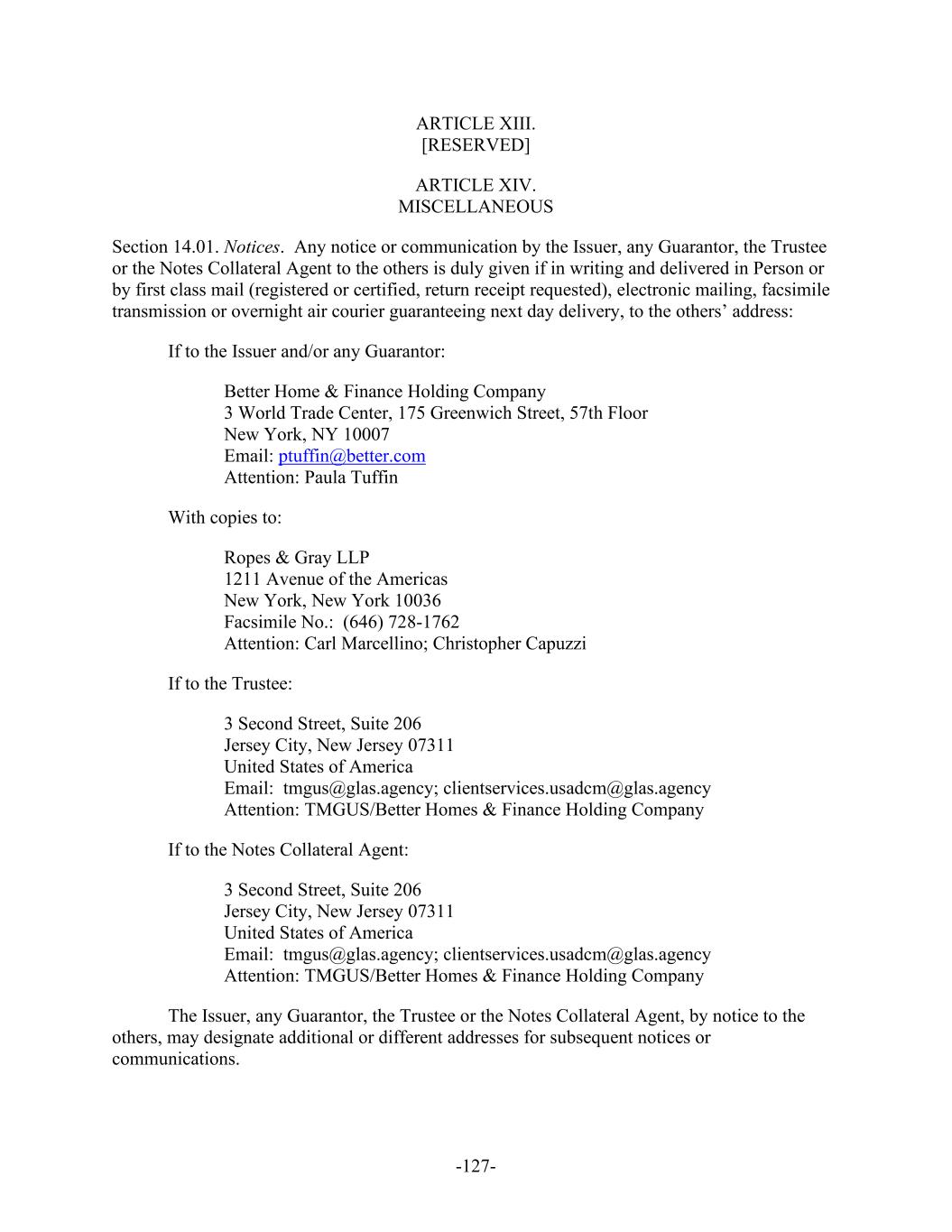 -127- ARTICLE XIII. [RESERVED] ARTICLE XIV. MISCELLANEOUS Section 14.01. Notices. Any notice or communication by the Issuer, any Guarantor, the Trustee or the Notes Collateral Agent to the others is duly given if in writing and delivered in Person or by first class mail (registered or certified, return receipt requested), electronic mailing, facsimile transmission or overnight air courier guaranteeing next day delivery, to the others’ address: If to the Issuer and/or any Guarantor: Better Home & Finance Holding Company 3 World Trade Center, 175 Greenwich Street, 57th Floor New York, NY 10007 Email: ptuffin@better.com Attention: Paula Tuffin With copies to: Ropes & Gray LLP 1211 Avenue of the Americas New York, New York 10036 Facsimile No.: (646) 728-1762 Attention: Carl Marcellino; Christopher Capuzzi If to the Trustee: 3 Second Street, Suite 206 Jersey City, New Jersey 07311 United States of America Email: tmgus@glas.agency; clientservices.usadcm@glas.agency Attention: TMGUS/Better Homes & Finance Holding Company If to the Notes Collateral Agent: 3 Second Street, Suite 206 Jersey City, New Jersey 07311 United States of America Email: tmgus@glas.agency; clientservices.usadcm@glas.agency Attention: TMGUS/Better Homes & Finance Holding Company The Issuer, any Guarantor, the Trustee or the Notes Collateral Agent, by notice to the others, may designate additional or different addresses for subsequent notices or communications.