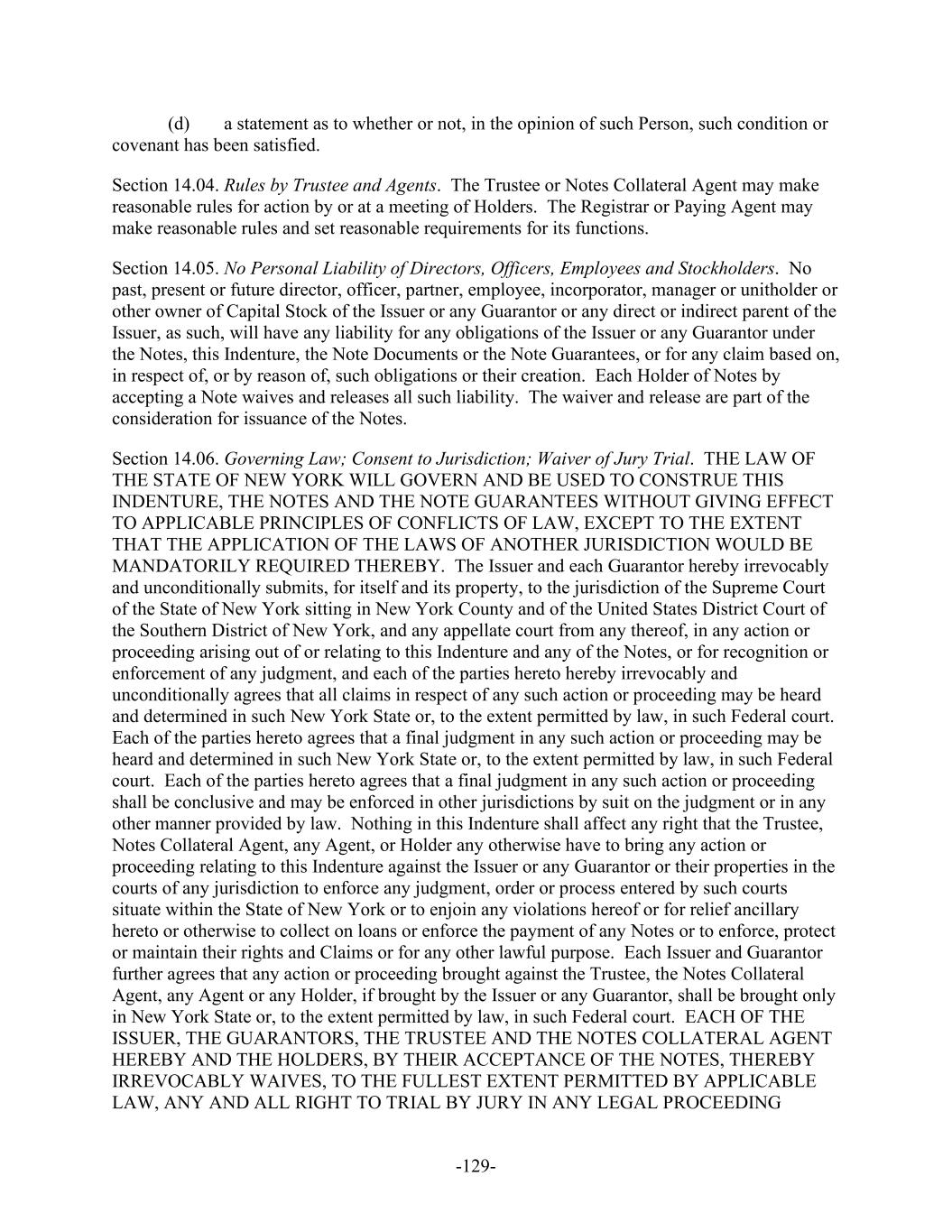 -129- (d) a statement as to whether or not, in the opinion of such Person, such condition or covenant has been satisfied. Section 14.04. Rules by Trustee and Agents. The Trustee or Notes Collateral Agent may make reasonable rules for action by or at a meeting of Holders. The Registrar or Paying Agent may make reasonable rules and set reasonable requirements for its functions. Section 14.05. No Personal Liability of Directors, Officers, Employees and Stockholders. No past, present or future director, officer, partner, employee, incorporator, manager or unitholder or other owner of Capital Stock of the Issuer or any Guarantor or any direct or indirect parent of the Issuer, as such, will have any liability for any obligations of the Issuer or any Guarantor under the Notes, this Indenture, the Note Documents or the Note Guarantees, or for any claim based on, in respect of, or by reason of, such obligations or their creation. Each Holder of Notes by accepting a Note waives and releases all such liability. The waiver and release are part of the consideration for issuance of the Notes. Section 14.06. Governing Law; Consent to Jurisdiction; Waiver of Jury Trial. THE LAW OF THE STATE OF NEW YORK WILL GOVERN AND BE USED TO CONSTRUE THIS INDENTURE, THE NOTES AND THE NOTE GUARANTEES WITHOUT GIVING EFFECT TO APPLICABLE PRINCIPLES OF CONFLICTS OF LAW, EXCEPT TO THE EXTENT THAT THE APPLICATION OF THE LAWS OF ANOTHER JURISDICTION WOULD BE MANDATORILY REQUIRED THEREBY. The Issuer and each Guarantor hereby irrevocably and unconditionally submits, for itself and its property, to the jurisdiction of the Supreme Court of the State of New York sitting in New York County and of the United States District Court of the Southern District of New York, and any appellate court from any thereof, in any action or proceeding arising out of or relating to this Indenture and any of the Notes, or for recognition or enforcement of any judgment, and each of the parties hereto hereby irrevocably and unconditionally agrees that all claims in respect of any such action or proceeding may be heard and determined in such New York State or, to the extent permitted by law, in such Federal court. Each of the parties hereto agrees that a final judgment in any such action or proceeding may be heard and determined in such New York State or, to the extent permitted by law, in such Federal court. Each of the parties hereto agrees that a final judgment in any such action or proceeding shall be conclusive and may be enforced in other jurisdictions by suit on the judgment or in any other manner provided by law. Nothing in this Indenture shall affect any right that the Trustee, Notes Collateral Agent, any Agent, or Holder any otherwise have to bring any action or proceeding relating to this Indenture against the Issuer or any Guarantor or their properties in the courts of any jurisdiction to enforce any judgment, order or process entered by such courts situate within the State of New York or to enjoin any violations hereof or for relief ancillary hereto or otherwise to collect on loans or enforce the payment of any Notes or to enforce, protect or maintain their rights and Claims or for any other lawful purpose. Each Issuer and Guarantor further agrees that any action or proceeding brought against the Trustee, the Notes Collateral Agent, any Agent or any Holder, if brought by the Issuer or any Guarantor, shall be brought only in New York State or, to the extent permitted by law, in such Federal court. EACH OF THE ISSUER, THE GUARANTORS, THE TRUSTEE AND THE NOTES COLLATERAL AGENT HEREBY AND THE HOLDERS, BY THEIR ACCEPTANCE OF THE NOTES, THEREBY IRREVOCABLY WAIVES, TO THE FULLEST EXTENT PERMITTED BY APPLICABLE LAW, ANY AND ALL RIGHT TO TRIAL BY JURY IN ANY LEGAL PROCEEDING