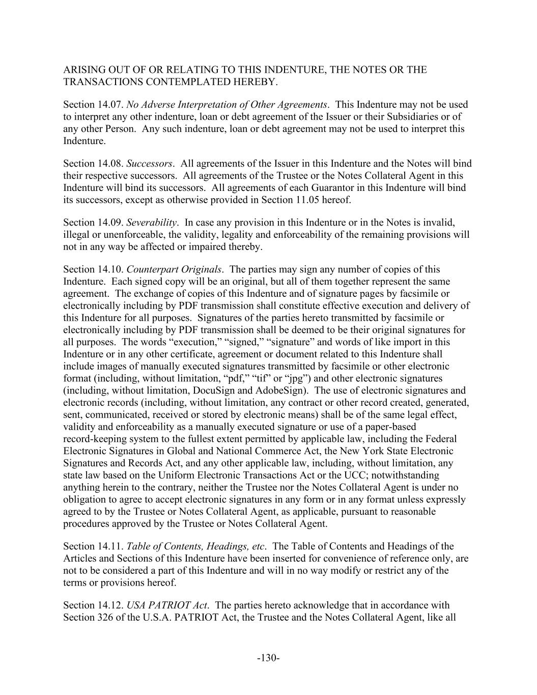 -130- ARISING OUT OF OR RELATING TO THIS INDENTURE, THE NOTES OR THE TRANSACTIONS CONTEMPLATED HEREBY. Section 14.07. No Adverse Interpretation of Other Agreements. This Indenture may not be used to interpret any other indenture, loan or debt agreement of the Issuer or their Subsidiaries or of any other Person. Any such indenture, loan or debt agreement may not be used to interpret this Indenture. Section 14.08. Successors. All agreements of the Issuer in this Indenture and the Notes will bind their respective successors. All agreements of the Trustee or the Notes Collateral Agent in this Indenture will bind its successors. All agreements of each Guarantor in this Indenture will bind its successors, except as otherwise provided in Section 11.05 hereof. Section 14.09. Severability. In case any provision in this Indenture or in the Notes is invalid, illegal or unenforceable, the validity, legality and enforceability of the remaining provisions will not in any way be affected or impaired thereby. Section 14.10. Counterpart Originals. The parties may sign any number of copies of this Indenture. Each signed copy will be an original, but all of them together represent the same agreement. The exchange of copies of this Indenture and of signature pages by facsimile or electronically including by PDF transmission shall constitute effective execution and delivery of this Indenture for all purposes. Signatures of the parties hereto transmitted by facsimile or electronically including by PDF transmission shall be deemed to be their original signatures for all purposes. The words “execution,” “signed,” “signature” and words of like import in this Indenture or in any other certificate, agreement or document related to this Indenture shall include images of manually executed signatures transmitted by facsimile or other electronic format (including, without limitation, “pdf,” “tif” or “jpg”) and other electronic signatures (including, without limitation, DocuSign and AdobeSign). The use of electronic signatures and electronic records (including, without limitation, any contract or other record created, generated, sent, communicated, received or stored by electronic means) shall be of the same legal effect, validity and enforceability as a manually executed signature or use of a paper-based record-keeping system to the fullest extent permitted by applicable law, including the Federal Electronic Signatures in Global and National Commerce Act, the New York State Electronic Signatures and Records Act, and any other applicable law, including, without limitation, any state law based on the Uniform Electronic Transactions Act or the UCC; notwithstanding anything herein to the contrary, neither the Trustee nor the Notes Collateral Agent is under no obligation to agree to accept electronic signatures in any form or in any format unless expressly agreed to by the Trustee or Notes Collateral Agent, as applicable, pursuant to reasonable procedures approved by the Trustee or Notes Collateral Agent. Section 14.11. Table of Contents, Headings, etc. The Table of Contents and Headings of the Articles and Sections of this Indenture have been inserted for convenience of reference only, are not to be considered a part of this Indenture and will in no way modify or restrict any of the terms or provisions hereof. Section 14.12. USA PATRIOT Act. The parties hereto acknowledge that in accordance with Section 326 of the U.S.A. PATRIOT Act, the Trustee and the Notes Collateral Agent, like all