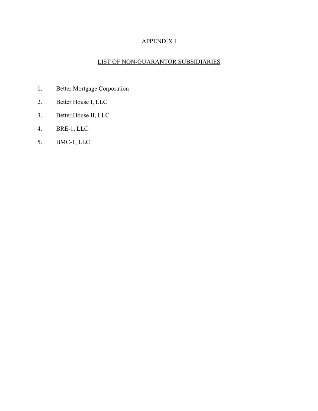 APPENDIX I LIST OF NON-GUARANTOR SUBSIDIARIES 1. Better Mortgage Corporation 2. Better House I, LLC 3. Better House II, LLC 4. BRE-1, LLC 5. BMC-1, LLC