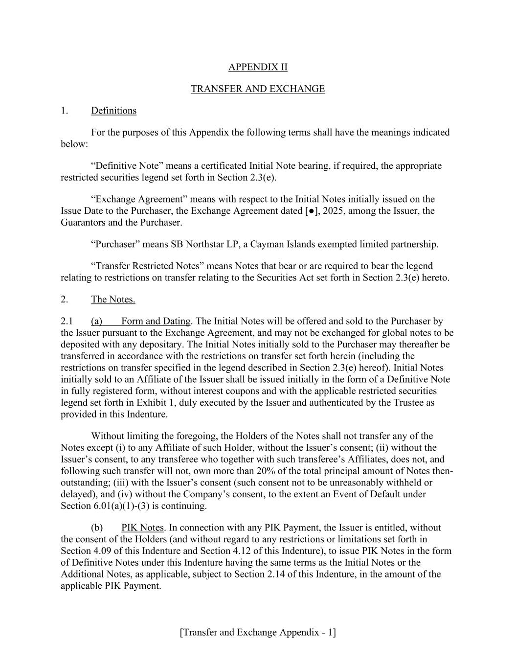 [Transfer and Exchange Appendix - 1] APPENDIX II TRANSFER AND EXCHANGE 1. Definitions For the purposes of this Appendix the following terms shall have the meanings indicated below: “Definitive Note” means a certificated Initial Note bearing, if required, the appropriate restricted securities legend set forth in Section 2.3(e). “Exchange Agreement” means with respect to the Initial Notes initially issued on the Issue Date to the Purchaser, the Exchange Agreement dated [●], 2025, among the Issuer, the Guarantors and the Purchaser. “Purchaser” means SB Northstar LP, a Cayman Islands exempted limited partnership. “Transfer Restricted Notes” means Notes that bear or are required to bear the legend relating to restrictions on transfer relating to the Securities Act set forth in Section 2.3(e) hereto. 2. The Notes. 2.1 (a) Form and Dating. The Initial Notes will be offered and sold to the Purchaser by the Issuer pursuant to the Exchange Agreement, and may not be exchanged for global notes to be deposited with any depositary. The Initial Notes initially sold to the Purchaser may thereafter be transferred in accordance with the restrictions on transfer set forth herein (including the restrictions on transfer specified in the legend described in Section 2.3(e) hereof). Initial Notes initially sold to an Affiliate of the Issuer shall be issued initially in the form of a Definitive Note in fully registered form, without interest coupons and with the applicable restricted securities legend set forth in Exhibit 1, duly executed by the Issuer and authenticated by the Trustee as provided in this Indenture. Without limiting the foregoing, the Holders of the Notes shall not transfer any of the Notes except (i) to any Affiliate of such Holder, without the Issuer’s consent; (ii) without the Issuer’s consent, to any transferee who together with such transferee’s Affiliates, does not, and following such transfer will not, own more than 20% of the total principal amount of Notes then- outstanding; (iii) with the Issuer’s consent (such consent not to be unreasonably withheld or delayed), and (iv) without the Company’s consent, to the extent an Event of Default under Section 6.01(a)(1)-(3) is continuing. (b) PIK Notes. In connection with any PIK Payment, the Issuer is entitled, without the consent of the Holders (and without regard to any restrictions or limitations set forth in Section 4.09 of this Indenture and Section 4.12 of this Indenture), to issue PIK Notes in the form of Definitive Notes under this Indenture having the same terms as the Initial Notes or the Additional Notes, as applicable, subject to Section 2.14 of this Indenture, in the amount of the applicable PIK Payment.