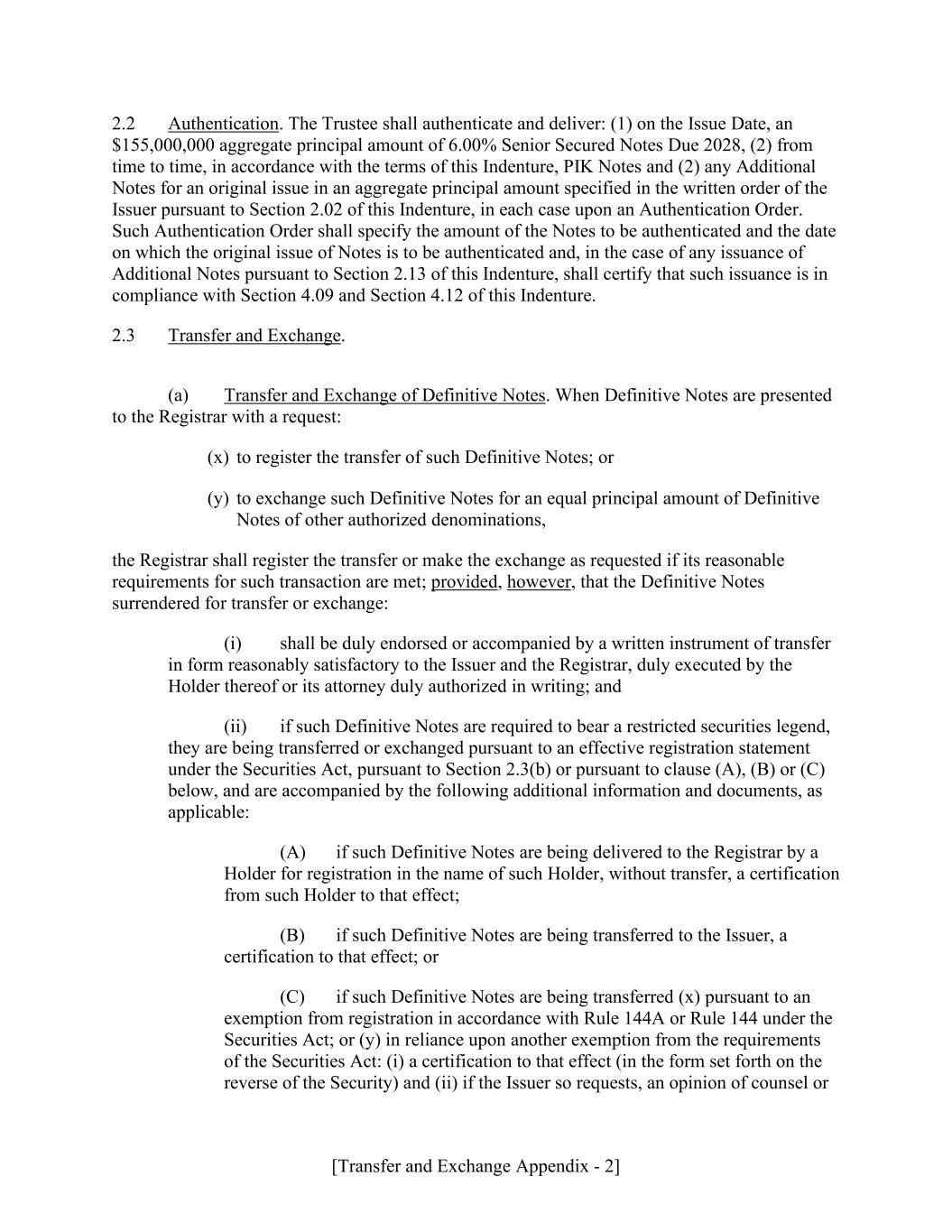 [Transfer and Exchange Appendix - 2] 2.2 Authentication. The Trustee shall authenticate and deliver: (1) on the Issue Date, an $155,000,000 aggregate principal amount of 6.00% Senior Secured Notes Due 2028, (2) from time to time, in accordance with the terms of this Indenture, PIK Notes and (2) any Additional Notes for an original issue in an aggregate principal amount specified in the written order of the Issuer pursuant to Section 2.02 of this Indenture, in each case upon an Authentication Order. Such Authentication Order shall specify the amount of the Notes to be authenticated and the date on which the original issue of Notes is to be authenticated and, in the case of any issuance of Additional Notes pursuant to Section 2.13 of this Indenture, shall certify that such issuance is in compliance with Section 4.09 and Section 4.12 of this Indenture. 2.3 Transfer and Exchange. (a) Transfer and Exchange of Definitive Notes. When Definitive Notes are presented to the Registrar with a request: (x) to register the transfer of such Definitive Notes; or (y) to exchange such Definitive Notes for an equal principal amount of Definitive Notes of other authorized denominations, the Registrar shall register the transfer or make the exchange as requested if its reasonable requirements for such transaction are met; provided, however, that the Definitive Notes surrendered for transfer or exchange: (i) shall be duly endorsed or accompanied by a written instrument of transfer in form reasonably satisfactory to the Issuer and the Registrar, duly executed by the Holder thereof or its attorney duly authorized in writing; and (ii) if such Definitive Notes are required to bear a restricted securities legend, they are being transferred or exchanged pursuant to an effective registration statement under the Securities Act, pursuant to Section 2.3(b) or pursuant to clause (A), (B) or (C) below, and are accompanied by the following additional information and documents, as applicable: (A) if such Definitive Notes are being delivered to the Registrar by a Holder for registration in the name of such Holder, without transfer, a certification from such Holder to that effect; (B) if such Definitive Notes are being transferred to the Issuer, a certification to that effect; or (C) if such Definitive Notes are being transferred (x) pursuant to an exemption from registration in accordance with Rule 144A or Rule 144 under the Securities Act; or (y) in reliance upon another exemption from the requirements of the Securities Act: (i) a certification to that effect (in the form set forth on the reverse of the Security) and (ii) if the Issuer so requests, an opinion of counsel or