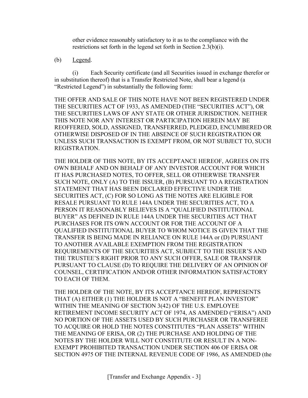 [Transfer and Exchange Appendix - 3] other evidence reasonably satisfactory to it as to the compliance with the restrictions set forth in the legend set forth in Section 2.3(b)(i). (b) Legend. (i) Each Security certificate (and all Securities issued in exchange therefor or in substitution thereof) that is a Transfer Restricted Note, shall bear a legend (a “Restricted Legend”) in substantially the following form: THE OFFER AND SALE OF THIS NOTE HAVE NOT BEEN REGISTERED UNDER THE SECURITIES ACT OF 1933, AS AMENDED (THE “SECURITIES ACT”), OR THE SECURITIES LAWS OF ANY STATE OR OTHER JURISDICTION. NEITHER THIS NOTE NOR ANY INTEREST OR PARTICIPATION HEREIN MAY BE REOFFERED, SOLD, ASSIGNED, TRANSFERRED, PLEDGED, ENCUMBERED OR OTHERWISE DISPOSED OF IN THE ABSENCE OF SUCH REGISTRATION OR UNLESS SUCH TRANSACTION IS EXEMPT FROM, OR NOT SUBJECT TO, SUCH REGISTRATION. THE HOLDER OF THIS NOTE, BY ITS ACCEPTANCE HEREOF, AGREES ON ITS OWN BEHALF AND ON BEHALF OF ANY INVESTOR ACCOUNT FOR WHICH IT HAS PURCHASED NOTES, TO OFFER, SELL OR OTHERWISE TRANSFER SUCH NOTE, ONLY (A) TO THE ISSUER, (B) PURSUANT TO A REGISTRATION STATEMENT THAT HAS BEEN DECLARED EFFECTIVE UNDER THE SECURITIES ACT, (C) FOR SO LONG AS THE NOTES ARE ELIGIBLE FOR RESALE PURSUANT TO RULE 144A UNDER THE SECURITIES ACT, TO A PERSON IT REASONABLY BELIEVES IS A “QUALIFIED INSTITUTIONAL BUYER” AS DEFINED IN RULE 144A UNDER THE SECURITIES ACT THAT PURCHASES FOR ITS OWN ACCOUNT OR FOR THE ACCOUNT OF A QUALIFIED INSTITUTIONAL BUYER TO WHOM NOTICE IS GIVEN THAT THE TRANSFER IS BEING MADE IN RELIANCE ON RULE 144A or (D) PURSUANT TO ANOTHER AVAILABLE EXEMPTION FROM THE REGISTRATION REQUIREMENTS OF THE SECURITIES ACT, SUBJECT TO THE ISSUER’S AND THE TRUSTEE’S RIGHT PRIOR TO ANY SUCH OFFER, SALE OR TRANSFER PURSUANT TO CLAUSE (D) TO REQUIRE THE DELIVERY OF AN OPINION OF COUNSEL, CERTIFICATION AND/OR OTHER INFORMATION SATISFACTORY TO EACH OF THEM. THE HOLDER OF THE NOTE, BY ITS ACCEPTANCE HEREOF, REPRESENTS THAT (A) EITHER (1) THE HOLDER IS NOT A “BENEFIT PLAN INVESTOR” WITHIN THE MEANING OF SECTION 3(42) OF THE U.S. EMPLOYEE RETIREMENT INCOME SECURITY ACT OF 1974, AS AMENDED (“ERISA”) AND NO PORTION OF THE ASSETS USED BY SUCH PURCHASER OR TRANSFEREE TO ACQUIRE OR HOLD THE NOTES CONSTITUTES “PLAN ASSETS” WITHIN THE MEANING OF ERISA, OR (2) THE PURCHASE AND HOLDING OF THE NOTES BY THE HOLDER WILL NOT CONSTITUTE OR RESULT IN A NON- EXEMPT PROHIBITED TRANSACTION UNDER SECTION 406 OF ERISA OR SECTION 4975 OF THE INTERNAL REVENUE CODE OF 1986, AS AMENDED (the