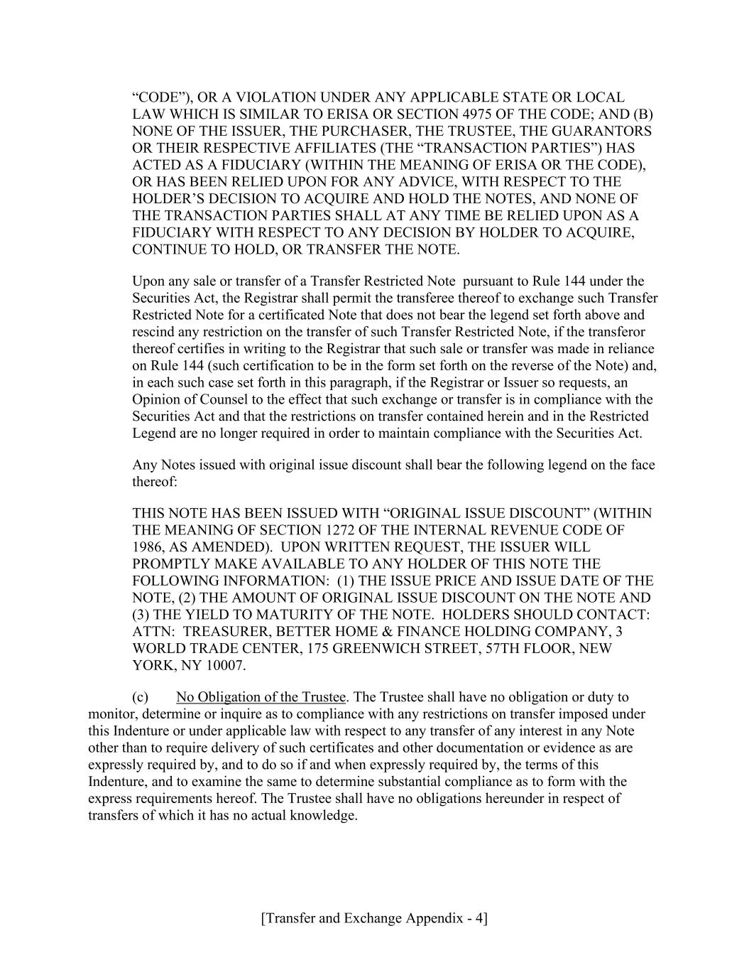 [Transfer and Exchange Appendix - 4] “CODE”), OR A VIOLATION UNDER ANY APPLICABLE STATE OR LOCAL LAW WHICH IS SIMILAR TO ERISA OR SECTION 4975 OF THE CODE; AND (B) NONE OF THE ISSUER, THE PURCHASER, THE TRUSTEE, THE GUARANTORS OR THEIR RESPECTIVE AFFILIATES (THE “TRANSACTION PARTIES”) HAS ACTED AS A FIDUCIARY (WITHIN THE MEANING OF ERISA OR THE CODE), OR HAS BEEN RELIED UPON FOR ANY ADVICE, WITH RESPECT TO THE HOLDER’S DECISION TO ACQUIRE AND HOLD THE NOTES, AND NONE OF THE TRANSACTION PARTIES SHALL AT ANY TIME BE RELIED UPON AS A FIDUCIARY WITH RESPECT TO ANY DECISION BY HOLDER TO ACQUIRE, CONTINUE TO HOLD, OR TRANSFER THE NOTE. Upon any sale or transfer of a Transfer Restricted Note pursuant to Rule 144 under the Securities Act, the Registrar shall permit the transferee thereof to exchange such Transfer Restricted Note for a certificated Note that does not bear the legend set forth above and rescind any restriction on the transfer of such Transfer Restricted Note, if the transferor thereof certifies in writing to the Registrar that such sale or transfer was made in reliance on Rule 144 (such certification to be in the form set forth on the reverse of the Note) and, in each such case set forth in this paragraph, if the Registrar or Issuer so requests, an Opinion of Counsel to the effect that such exchange or transfer is in compliance with the Securities Act and that the restrictions on transfer contained herein and in the Restricted Legend are no longer required in order to maintain compliance with the Securities Act. Any Notes issued with original issue discount shall bear the following legend on the face thereof: THIS NOTE HAS BEEN ISSUED WITH “ORIGINAL ISSUE DISCOUNT” (WITHIN THE MEANING OF SECTION 1272 OF THE INTERNAL REVENUE CODE OF 1986, AS AMENDED). UPON WRITTEN REQUEST, THE ISSUER WILL PROMPTLY MAKE AVAILABLE TO ANY HOLDER OF THIS NOTE THE FOLLOWING INFORMATION: (1) THE ISSUE PRICE AND ISSUE DATE OF THE NOTE, (2) THE AMOUNT OF ORIGINAL ISSUE DISCOUNT ON THE NOTE AND (3) THE YIELD TO MATURITY OF THE NOTE. HOLDERS SHOULD CONTACT: ATTN: TREASURER, BETTER HOME & FINANCE HOLDING COMPANY, 3 WORLD TRADE CENTER, 175 GREENWICH STREET, 57TH FLOOR, NEW YORK, NY 10007. (c) No Obligation of the Trustee. The Trustee shall have no obligation or duty to monitor, determine or inquire as to compliance with any restrictions on transfer imposed under this Indenture or under applicable law with respect to any transfer of any interest in any Note other than to require delivery of such certificates and other documentation or evidence as are expressly required by, and to do so if and when expressly required by, the terms of this Indenture, and to examine the same to determine substantial compliance as to form with the express requirements hereof. The Trustee shall have no obligations hereunder in respect of transfers of which it has no actual knowledge.