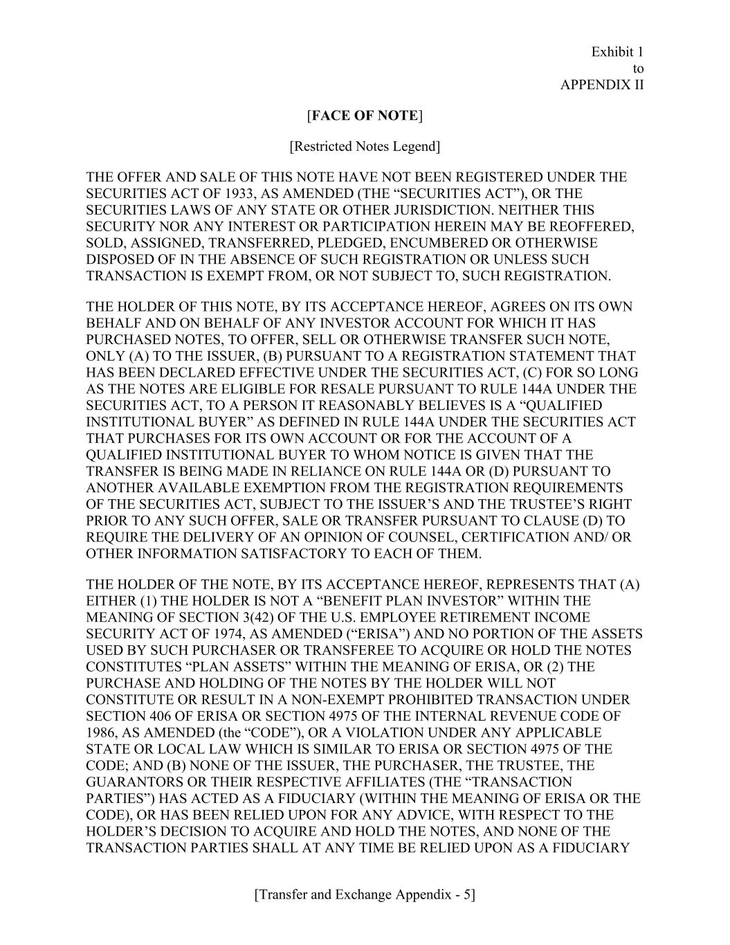 Exhibit 1 to APPENDIX II [Transfer and Exchange Appendix - 5] [FACE OF NOTE] [Restricted Notes Legend] THE OFFER AND SALE OF THIS NOTE HAVE NOT BEEN REGISTERED UNDER THE SECURITIES ACT OF 1933, AS AMENDED (THE “SECURITIES ACT”), OR THE SECURITIES LAWS OF ANY STATE OR OTHER JURISDICTION. NEITHER THIS SECURITY NOR ANY INTEREST OR PARTICIPATION HEREIN MAY BE REOFFERED, SOLD, ASSIGNED, TRANSFERRED, PLEDGED, ENCUMBERED OR OTHERWISE DISPOSED OF IN THE ABSENCE OF SUCH REGISTRATION OR UNLESS SUCH TRANSACTION IS EXEMPT FROM, OR NOT SUBJECT TO, SUCH REGISTRATION. THE HOLDER OF THIS NOTE, BY ITS ACCEPTANCE HEREOF, AGREES ON ITS OWN BEHALF AND ON BEHALF OF ANY INVESTOR ACCOUNT FOR WHICH IT HAS PURCHASED NOTES, TO OFFER, SELL OR OTHERWISE TRANSFER SUCH NOTE, ONLY (A) TO THE ISSUER, (B) PURSUANT TO A REGISTRATION STATEMENT THAT HAS BEEN DECLARED EFFECTIVE UNDER THE SECURITIES ACT, (C) FOR SO LONG AS THE NOTES ARE ELIGIBLE FOR RESALE PURSUANT TO RULE 144A UNDER THE SECURITIES ACT, TO A PERSON IT REASONABLY BELIEVES IS A “QUALIFIED INSTITUTIONAL BUYER” AS DEFINED IN RULE 144A UNDER THE SECURITIES ACT THAT PURCHASES FOR ITS OWN ACCOUNT OR FOR THE ACCOUNT OF A QUALIFIED INSTITUTIONAL BUYER TO WHOM NOTICE IS GIVEN THAT THE TRANSFER IS BEING MADE IN RELIANCE ON RULE 144A OR (D) PURSUANT TO ANOTHER AVAILABLE EXEMPTION FROM THE REGISTRATION REQUIREMENTS OF THE SECURITIES ACT, SUBJECT TO THE ISSUER’S AND THE TRUSTEE’S RIGHT PRIOR TO ANY SUCH OFFER, SALE OR TRANSFER PURSUANT TO CLAUSE (D) TO REQUIRE THE DELIVERY OF AN OPINION OF COUNSEL, CERTIFICATION AND/ OR OTHER INFORMATION SATISFACTORY TO EACH OF THEM. THE HOLDER OF THE NOTE, BY ITS ACCEPTANCE HEREOF, REPRESENTS THAT (A) EITHER (1) THE HOLDER IS NOT A “BENEFIT PLAN INVESTOR” WITHIN THE MEANING OF SECTION 3(42) OF THE U.S. EMPLOYEE RETIREMENT INCOME SECURITY ACT OF 1974, AS AMENDED (“ERISA”) AND NO PORTION OF THE ASSETS USED BY SUCH PURCHASER OR TRANSFEREE TO ACQUIRE OR HOLD THE NOTES CONSTITUTES “PLAN ASSETS” WITHIN THE MEANING OF ERISA, OR (2) THE PURCHASE AND HOLDING OF THE NOTES BY THE HOLDER WILL NOT CONSTITUTE OR RESULT IN A NON-EXEMPT PROHIBITED TRANSACTION UNDER SECTION 406 OF ERISA OR SECTION 4975 OF THE INTERNAL REVENUE CODE OF 1986, AS AMENDED (the “CODE”), OR A VIOLATION UNDER ANY APPLICABLE STATE OR LOCAL LAW WHICH IS SIMILAR TO ERISA OR SECTION 4975 OF THE CODE; AND (B) NONE OF THE ISSUER, THE PURCHASER, THE TRUSTEE, THE GUARANTORS OR THEIR RESPECTIVE AFFILIATES (THE “TRANSACTION PARTIES”) HAS ACTED AS A FIDUCIARY (WITHIN THE MEANING OF ERISA OR THE CODE), OR HAS BEEN RELIED UPON FOR ANY ADVICE, WITH RESPECT TO THE HOLDER’S DECISION TO ACQUIRE AND HOLD THE NOTES, AND NONE OF THE TRANSACTION PARTIES SHALL AT ANY TIME BE RELIED UPON AS A FIDUCIARY