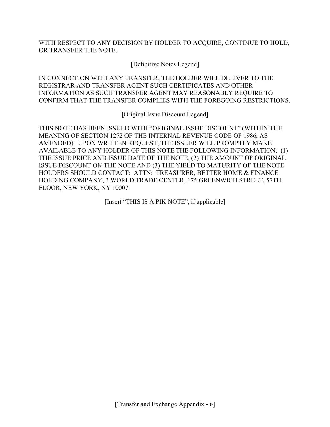 [Transfer and Exchange Appendix - 6] WITH RESPECT TO ANY DECISION BY HOLDER TO ACQUIRE, CONTINUE TO HOLD, OR TRANSFER THE NOTE. [Definitive Notes Legend] IN CONNECTION WITH ANY TRANSFER, THE HOLDER WILL DELIVER TO THE REGISTRAR AND TRANSFER AGENT SUCH CERTIFICATES AND OTHER INFORMATION AS SUCH TRANSFER AGENT MAY REASONABLY REQUIRE TO CONFIRM THAT THE TRANSFER COMPLIES WITH THE FOREGOING RESTRICTIONS. [Original Issue Discount Legend] THIS NOTE HAS BEEN ISSUED WITH “ORIGINAL ISSUE DISCOUNT” (WITHIN THE MEANING OF SECTION 1272 OF THE INTERNAL REVENUE CODE OF 1986, AS AMENDED). UPON WRITTEN REQUEST, THE ISSUER WILL PROMPTLY MAKE AVAILABLE TO ANY HOLDER OF THIS NOTE THE FOLLOWING INFORMATION: (1) THE ISSUE PRICE AND ISSUE DATE OF THE NOTE, (2) THE AMOUNT OF ORIGINAL ISSUE DISCOUNT ON THE NOTE AND (3) THE YIELD TO MATURITY OF THE NOTE. HOLDERS SHOULD CONTACT: ATTN: TREASURER, BETTER HOME & FINANCE HOLDING COMPANY, 3 WORLD TRADE CENTER, 175 GREENWICH STREET, 57TH FLOOR, NEW YORK, NY 10007. [Insert “THIS IS A PIK NOTE”, if applicable]