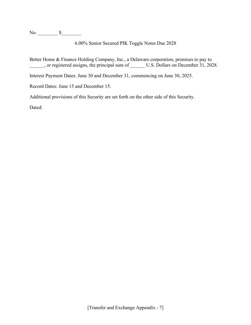 [Transfer and Exchange Appendix - 7] No. ________ $________ 6.00% Senior Secured PIK Toggle Notes Due 2028 Better Home & Finance Holding Company, Inc., a Delaware corporation, promises to pay to ______, or registered assigns, the principal sum of ______ U.S. Dollars on December 31, 2028. Interest Payment Dates: June 30 and December 31, commencing on June 30, 2025. Record Dates: June 15 and December 15. Additional provisions of this Security are set forth on the other side of this Security. Dated: