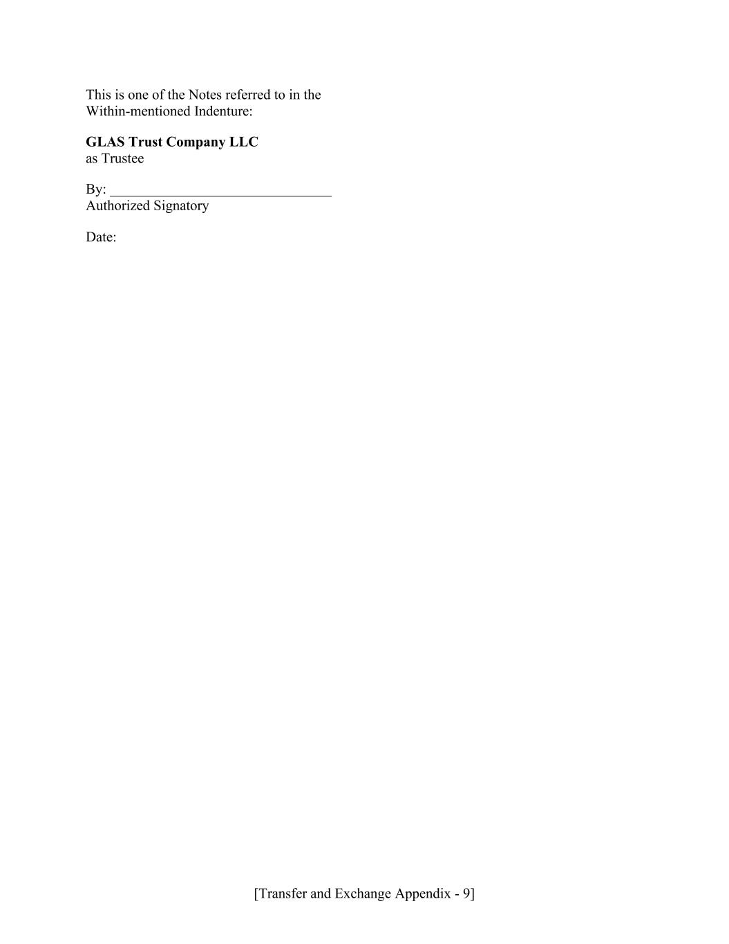 [Transfer and Exchange Appendix - 9] This is one of the Notes referred to in the Within-mentioned Indenture: GLAS Trust Company LLC as Trustee By: _______________________________ Authorized Signatory Date: