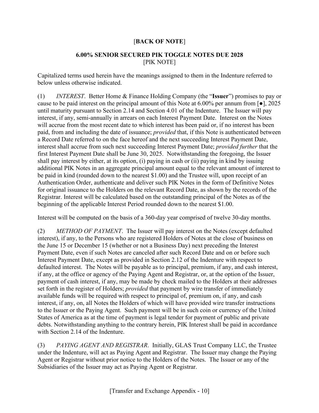 [Transfer and Exchange Appendix - 10] [BACK OF NOTE] 6.00% SENIOR SECURED PIK TOGGLE NOTES DUE 2028 [PIK NOTE] Capitalized terms used herein have the meanings assigned to them in the Indenture referred to below unless otherwise indicated. (1) INTEREST. Better Home & Finance Holding Company (the “Issuer”) promises to pay or cause to be paid interest on the principal amount of this Note at 6.00% per annum from [●], 2025 until maturity pursuant to Section 2.14 and Section 4.01 of the Indenture. The Issuer will pay interest, if any, semi-annually in arrears on each Interest Payment Date. Interest on the Notes will accrue from the most recent date to which interest has been paid or, if no interest has been paid, from and including the date of issuance; provided that, if this Note is authenticated between a Record Date referred to on the face hereof and the next succeeding Interest Payment Date, interest shall accrue from such next succeeding Interest Payment Date; provided further that the first Interest Payment Date shall be June 30, 2025. Notwithstanding the foregoing, the Issuer shall pay interest by either, at its option, (i) paying in cash or (ii) paying in kind by issuing additional PIK Notes in an aggregate principal amount equal to the relevant amount of interest to be paid in kind (rounded down to the nearest $1.00) and the Trustee will, upon receipt of an Authentication Order, authenticate and deliver such PIK Notes in the form of Definitive Notes for original issuance to the Holders on the relevant Record Date, as shown by the records of the Registrar. Interest will be calculated based on the outstanding principal of the Notes as of the beginning of the applicable Interest Period rounded down to the nearest $1.00. Interest will be computed on the basis of a 360-day year comprised of twelve 30-day months. (2) METHOD OF PAYMENT. The Issuer will pay interest on the Notes (except defaulted interest), if any, to the Persons who are registered Holders of Notes at the close of business on the June 15 or December 15 (whether or not a Business Day) next preceding the Interest Payment Date, even if such Notes are canceled after such Record Date and on or before such Interest Payment Date, except as provided in Section 2.12 of the Indenture with respect to defaulted interest. The Notes will be payable as to principal, premium, if any, and cash interest, if any, at the office or agency of the Paying Agent and Registrar, or, at the option of the Issuer, payment of cash interest, if any, may be made by check mailed to the Holders at their addresses set forth in the register of Holders; provided that payment by wire transfer of immediately available funds will be required with respect to principal of, premium on, if any, and cash interest, if any, on, all Notes the Holders of which will have provided wire transfer instructions to the Issuer or the Paying Agent. Such payment will be in such coin or currency of the United States of America as at the time of payment is legal tender for payment of public and private debts. Notwithstanding anything to the contrary herein, PIK Interest shall be paid in accordance with Section 2.14 of the Indenture. (3) PAYING AGENT AND REGISTRAR. Initially, GLAS Trust Company LLC, the Trustee under the Indenture, will act as Paying Agent and Registrar. The Issuer may change the Paying Agent or Registrar without prior notice to the Holders of the Notes. The Issuer or any of the Subsidiaries of the Issuer may act as Paying Agent or Registrar.