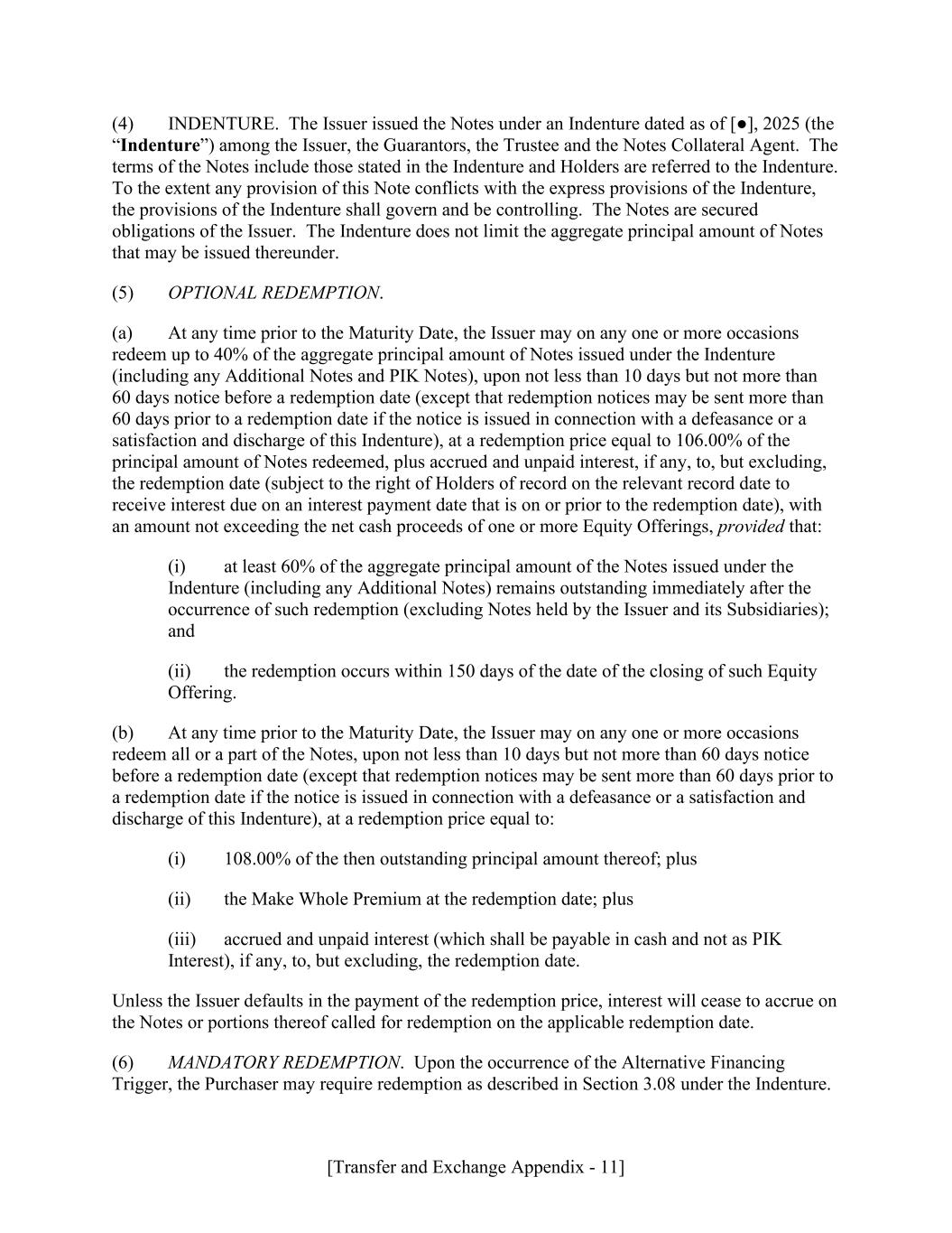 [Transfer and Exchange Appendix - 11] (4) INDENTURE. The Issuer issued the Notes under an Indenture dated as of [●], 2025 (the “Indenture”) among the Issuer, the Guarantors, the Trustee and the Notes Collateral Agent. The terms of the Notes include those stated in the Indenture and Holders are referred to the Indenture. To the extent any provision of this Note conflicts with the express provisions of the Indenture, the provisions of the Indenture shall govern and be controlling. The Notes are secured obligations of the Issuer. The Indenture does not limit the aggregate principal amount of Notes that may be issued thereunder. (5) OPTIONAL REDEMPTION. (a) At any time prior to the Maturity Date, the Issuer may on any one or more occasions redeem up to 40% of the aggregate principal amount of Notes issued under the Indenture (including any Additional Notes and PIK Notes), upon not less than 10 days but not more than 60 days notice before a redemption date (except that redemption notices may be sent more than 60 days prior to a redemption date if the notice is issued in connection with a defeasance or a satisfaction and discharge of this Indenture), at a redemption price equal to 106.00% of the principal amount of Notes redeemed, plus accrued and unpaid interest, if any, to, but excluding, the redemption date (subject to the right of Holders of record on the relevant record date to receive interest due on an interest payment date that is on or prior to the redemption date), with an amount not exceeding the net cash proceeds of one or more Equity Offerings, provided that: (i) at least 60% of the aggregate principal amount of the Notes issued under the Indenture (including any Additional Notes) remains outstanding immediately after the occurrence of such redemption (excluding Notes held by the Issuer and its Subsidiaries); and (ii) the redemption occurs within 150 days of the date of the closing of such Equity Offering. (b) At any time prior to the Maturity Date, the Issuer may on any one or more occasions redeem all or a part of the Notes, upon not less than 10 days but not more than 60 days notice before a redemption date (except that redemption notices may be sent more than 60 days prior to a redemption date if the notice is issued in connection with a defeasance or a satisfaction and discharge of this Indenture), at a redemption price equal to: (i) 108.00% of the then outstanding principal amount thereof; plus (ii) the Make Whole Premium at the redemption date; plus (iii) accrued and unpaid interest (which shall be payable in cash and not as PIK Interest), if any, to, but excluding, the redemption date. Unless the Issuer defaults in the payment of the redemption price, interest will cease to accrue on the Notes or portions thereof called for redemption on the applicable redemption date. (6) MANDATORY REDEMPTION. Upon the occurrence of the Alternative Financing Trigger, the Purchaser may require redemption as described in Section 3.08 under the Indenture.