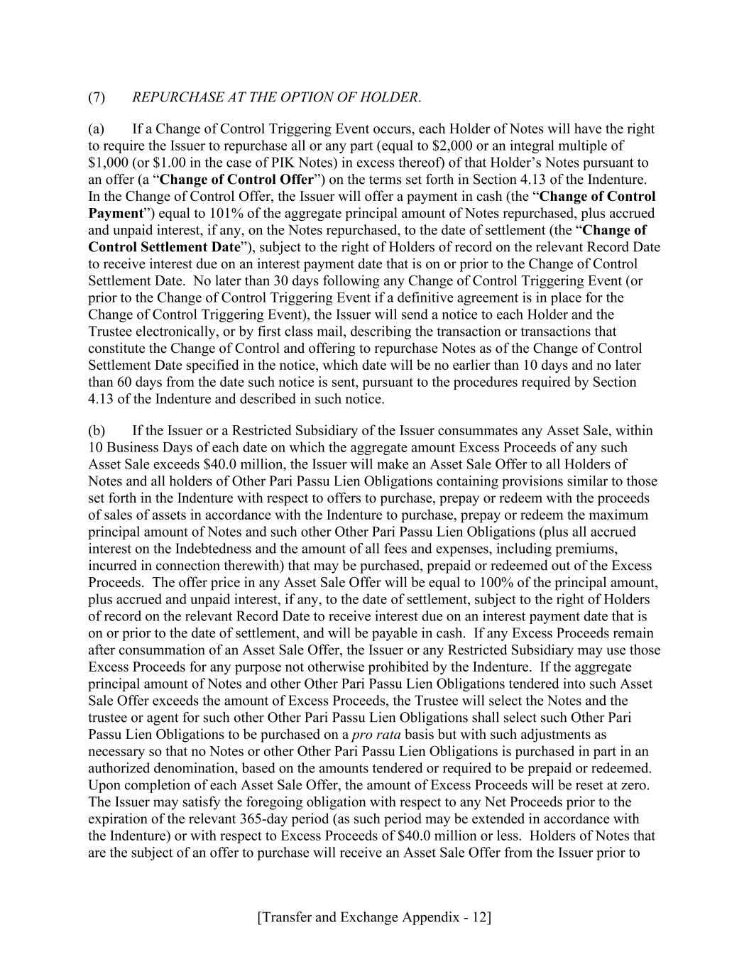 [Transfer and Exchange Appendix - 12] (7) REPURCHASE AT THE OPTION OF HOLDER. (a) If a Change of Control Triggering Event occurs, each Holder of Notes will have the right to require the Issuer to repurchase all or any part (equal to $2,000 or an integral multiple of $1,000 (or $1.00 in the case of PIK Notes) in excess thereof) of that Holder’s Notes pursuant to an offer (a “Change of Control Offer”) on the terms set forth in Section 4.13 of the Indenture. In the Change of Control Offer, the Issuer will offer a payment in cash (the “Change of Control Payment”) equal to 101% of the aggregate principal amount of Notes repurchased, plus accrued and unpaid interest, if any, on the Notes repurchased, to the date of settlement (the “Change of Control Settlement Date”), subject to the right of Holders of record on the relevant Record Date to receive interest due on an interest payment date that is on or prior to the Change of Control Settlement Date. No later than 30 days following any Change of Control Triggering Event (or prior to the Change of Control Triggering Event if a definitive agreement is in place for the Change of Control Triggering Event), the Issuer will send a notice to each Holder and the Trustee electronically, or by first class mail, describing the transaction or transactions that constitute the Change of Control and offering to repurchase Notes as of the Change of Control Settlement Date specified in the notice, which date will be no earlier than 10 days and no later than 60 days from the date such notice is sent, pursuant to the procedures required by Section 4.13 of the Indenture and described in such notice. (b) If the Issuer or a Restricted Subsidiary of the Issuer consummates any Asset Sale, within 10 Business Days of each date on which the aggregate amount Excess Proceeds of any such Asset Sale exceeds $40.0 million, the Issuer will make an Asset Sale Offer to all Holders of Notes and all holders of Other Pari Passu Lien Obligations containing provisions similar to those set forth in the Indenture with respect to offers to purchase, prepay or redeem with the proceeds of sales of assets in accordance with the Indenture to purchase, prepay or redeem the maximum principal amount of Notes and such other Other Pari Passu Lien Obligations (plus all accrued interest on the Indebtedness and the amount of all fees and expenses, including premiums, incurred in connection therewith) that may be purchased, prepaid or redeemed out of the Excess Proceeds. The offer price in any Asset Sale Offer will be equal to 100% of the principal amount, plus accrued and unpaid interest, if any, to the date of settlement, subject to the right of Holders of record on the relevant Record Date to receive interest due on an interest payment date that is on or prior to the date of settlement, and will be payable in cash. If any Excess Proceeds remain after consummation of an Asset Sale Offer, the Issuer or any Restricted Subsidiary may use those Excess Proceeds for any purpose not otherwise prohibited by the Indenture. If the aggregate principal amount of Notes and other Other Pari Passu Lien Obligations tendered into such Asset Sale Offer exceeds the amount of Excess Proceeds, the Trustee will select the Notes and the trustee or agent for such other Other Pari Passu Lien Obligations shall select such Other Pari Passu Lien Obligations to be purchased on a pro rata basis but with such adjustments as necessary so that no Notes or other Other Pari Passu Lien Obligations is purchased in part in an authorized denomination, based on the amounts tendered or required to be prepaid or redeemed. Upon completion of each Asset Sale Offer, the amount of Excess Proceeds will be reset at zero. The Issuer may satisfy the foregoing obligation with respect to any Net Proceeds prior to the expiration of the relevant 365-day period (as such period may be extended in accordance with the Indenture) or with respect to Excess Proceeds of $40.0 million or less. Holders of Notes that are the subject of an offer to purchase will receive an Asset Sale Offer from the Issuer prior to