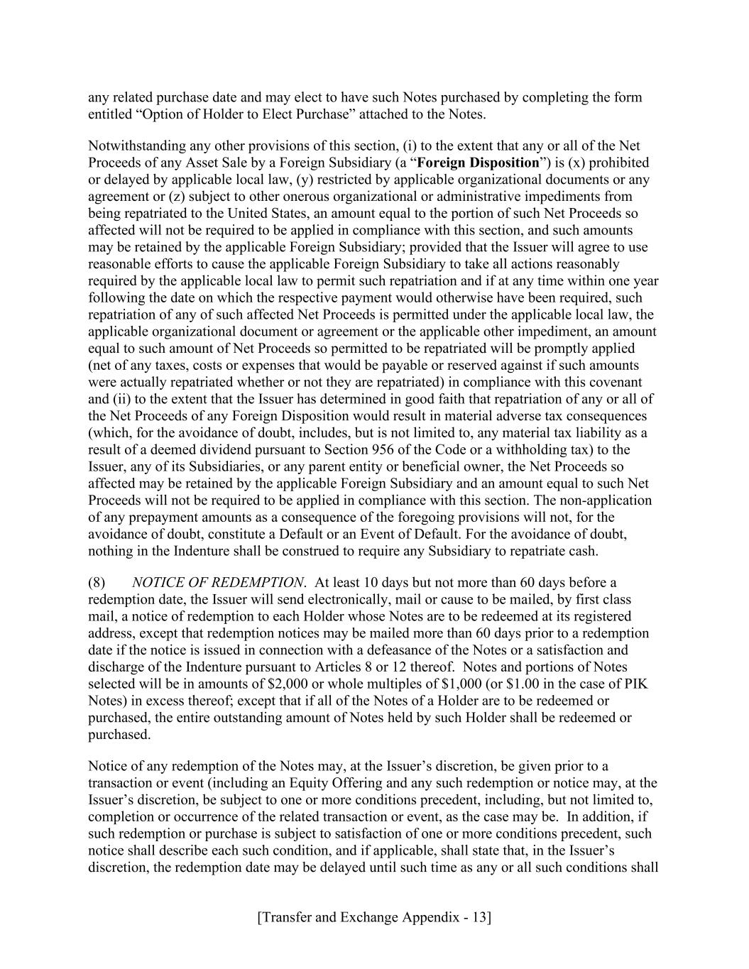 [Transfer and Exchange Appendix - 13] any related purchase date and may elect to have such Notes purchased by completing the form entitled “Option of Holder to Elect Purchase” attached to the Notes. Notwithstanding any other provisions of this section, (i) to the extent that any or all of the Net Proceeds of any Asset Sale by a Foreign Subsidiary (a “Foreign Disposition”) is (x) prohibited or delayed by applicable local law, (y) restricted by applicable organizational documents or any agreement or (z) subject to other onerous organizational or administrative impediments from being repatriated to the United States, an amount equal to the portion of such Net Proceeds so affected will not be required to be applied in compliance with this section, and such amounts may be retained by the applicable Foreign Subsidiary; provided that the Issuer will agree to use reasonable efforts to cause the applicable Foreign Subsidiary to take all actions reasonably required by the applicable local law to permit such repatriation and if at any time within one year following the date on which the respective payment would otherwise have been required, such repatriation of any of such affected Net Proceeds is permitted under the applicable local law, the applicable organizational document or agreement or the applicable other impediment, an amount equal to such amount of Net Proceeds so permitted to be repatriated will be promptly applied (net of any taxes, costs or expenses that would be payable or reserved against if such amounts were actually repatriated whether or not they are repatriated) in compliance with this covenant and (ii) to the extent that the Issuer has determined in good faith that repatriation of any or all of the Net Proceeds of any Foreign Disposition would result in material adverse tax consequences (which, for the avoidance of doubt, includes, but is not limited to, any material tax liability as a result of a deemed dividend pursuant to Section 956 of the Code or a withholding tax) to the Issuer, any of its Subsidiaries, or any parent entity or beneficial owner, the Net Proceeds so affected may be retained by the applicable Foreign Subsidiary and an amount equal to such Net Proceeds will not be required to be applied in compliance with this section. The non-application of any prepayment amounts as a consequence of the foregoing provisions will not, for the avoidance of doubt, constitute a Default or an Event of Default. For the avoidance of doubt, nothing in the Indenture shall be construed to require any Subsidiary to repatriate cash. (8) NOTICE OF REDEMPTION. At least 10 days but not more than 60 days before a redemption date, the Issuer will send electronically, mail or cause to be mailed, by first class mail, a notice of redemption to each Holder whose Notes are to be redeemed at its registered address, except that redemption notices may be mailed more than 60 days prior to a redemption date if the notice is issued in connection with a defeasance of the Notes or a satisfaction and discharge of the Indenture pursuant to Articles 8 or 12 thereof. Notes and portions of Notes selected will be in amounts of $2,000 or whole multiples of $1,000 (or $1.00 in the case of PIK Notes) in excess thereof; except that if all of the Notes of a Holder are to be redeemed or purchased, the entire outstanding amount of Notes held by such Holder shall be redeemed or purchased. Notice of any redemption of the Notes may, at the Issuer’s discretion, be given prior to a transaction or event (including an Equity Offering and any such redemption or notice may, at the Issuer’s discretion, be subject to one or more conditions precedent, including, but not limited to, completion or occurrence of the related transaction or event, as the case may be. In addition, if such redemption or purchase is subject to satisfaction of one or more conditions precedent, such notice shall describe each such condition, and if applicable, shall state that, in the Issuer’s discretion, the redemption date may be delayed until such time as any or all such conditions shall