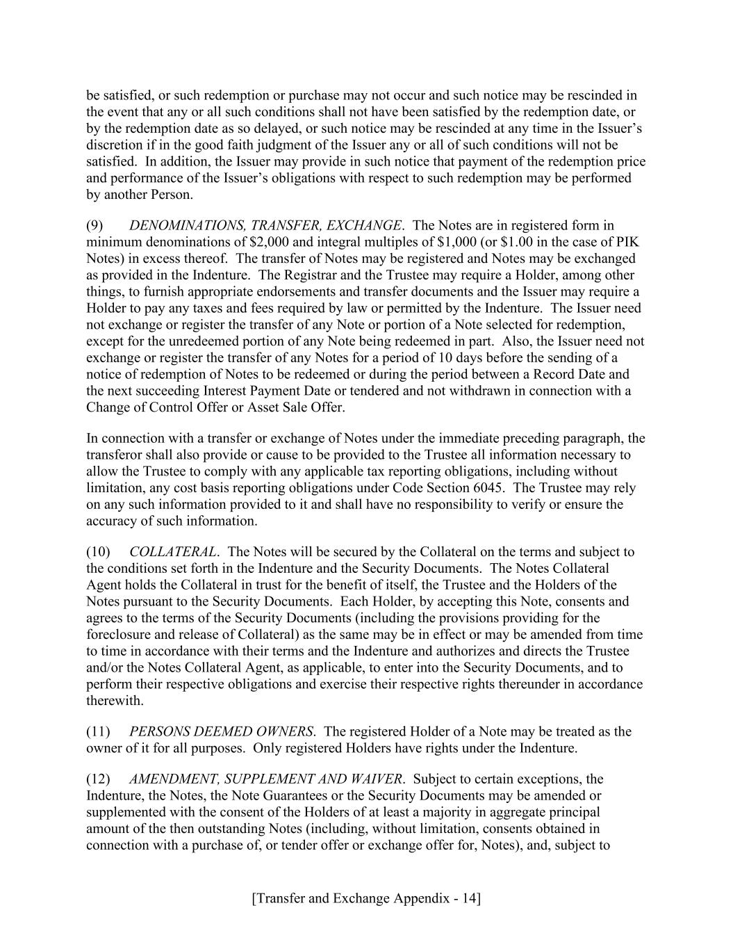 [Transfer and Exchange Appendix - 14] be satisfied, or such redemption or purchase may not occur and such notice may be rescinded in the event that any or all such conditions shall not have been satisfied by the redemption date, or by the redemption date as so delayed, or such notice may be rescinded at any time in the Issuer’s discretion if in the good faith judgment of the Issuer any or all of such conditions will not be satisfied. In addition, the Issuer may provide in such notice that payment of the redemption price and performance of the Issuer’s obligations with respect to such redemption may be performed by another Person. (9) DENOMINATIONS, TRANSFER, EXCHANGE. The Notes are in registered form in minimum denominations of $2,000 and integral multiples of $1,000 (or $1.00 in the case of PIK Notes) in excess thereof. The transfer of Notes may be registered and Notes may be exchanged as provided in the Indenture. The Registrar and the Trustee may require a Holder, among other things, to furnish appropriate endorsements and transfer documents and the Issuer may require a Holder to pay any taxes and fees required by law or permitted by the Indenture. The Issuer need not exchange or register the transfer of any Note or portion of a Note selected for redemption, except for the unredeemed portion of any Note being redeemed in part. Also, the Issuer need not exchange or register the transfer of any Notes for a period of 10 days before the sending of a notice of redemption of Notes to be redeemed or during the period between a Record Date and the next succeeding Interest Payment Date or tendered and not withdrawn in connection with a Change of Control Offer or Asset Sale Offer. In connection with a transfer or exchange of Notes under the immediate preceding paragraph, the transferor shall also provide or cause to be provided to the Trustee all information necessary to allow the Trustee to comply with any applicable tax reporting obligations, including without limitation, any cost basis reporting obligations under Code Section 6045. The Trustee may rely on any such information provided to it and shall have no responsibility to verify or ensure the accuracy of such information. (10) COLLATERAL. The Notes will be secured by the Collateral on the terms and subject to the conditions set forth in the Indenture and the Security Documents. The Notes Collateral Agent holds the Collateral in trust for the benefit of itself, the Trustee and the Holders of the Notes pursuant to the Security Documents. Each Holder, by accepting this Note, consents and agrees to the terms of the Security Documents (including the provisions providing for the foreclosure and release of Collateral) as the same may be in effect or may be amended from time to time in accordance with their terms and the Indenture and authorizes and directs the Trustee and/or the Notes Collateral Agent, as applicable, to enter into the Security Documents, and to perform their respective obligations and exercise their respective rights thereunder in accordance therewith. (11) PERSONS DEEMED OWNERS. The registered Holder of a Note may be treated as the owner of it for all purposes. Only registered Holders have rights under the Indenture. (12) AMENDMENT, SUPPLEMENT AND WAIVER. Subject to certain exceptions, the Indenture, the Notes, the Note Guarantees or the Security Documents may be amended or supplemented with the consent of the Holders of at least a majority in aggregate principal amount of the then outstanding Notes (including, without limitation, consents obtained in connection with a purchase of, or tender offer or exchange offer for, Notes), and, subject to