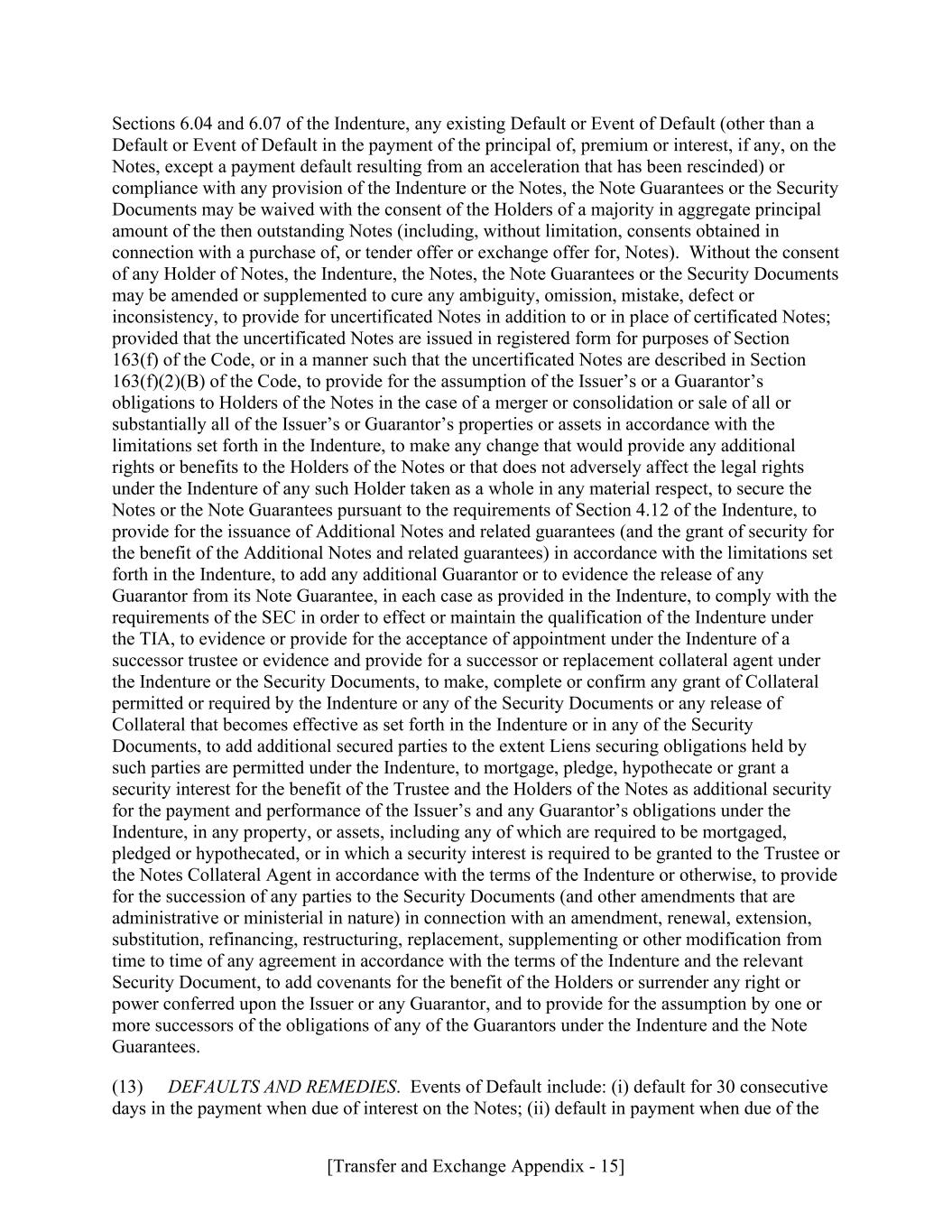 [Transfer and Exchange Appendix - 15] Sections 6.04 and 6.07 of the Indenture, any existing Default or Event of Default (other than a Default or Event of Default in the payment of the principal of, premium or interest, if any, on the Notes, except a payment default resulting from an acceleration that has been rescinded) or compliance with any provision of the Indenture or the Notes, the Note Guarantees or the Security Documents may be waived with the consent of the Holders of a majority in aggregate principal amount of the then outstanding Notes (including, without limitation, consents obtained in connection with a purchase of, or tender offer or exchange offer for, Notes). Without the consent of any Holder of Notes, the Indenture, the Notes, the Note Guarantees or the Security Documents may be amended or supplemented to cure any ambiguity, omission, mistake, defect or inconsistency, to provide for uncertificated Notes in addition to or in place of certificated Notes; provided that the uncertificated Notes are issued in registered form for purposes of Section 163(f) of the Code, or in a manner such that the uncertificated Notes are described in Section 163(f)(2)(B) of the Code, to provide for the assumption of the Issuer’s or a Guarantor’s obligations to Holders of the Notes in the case of a merger or consolidation or sale of all or substantially all of the Issuer’s or Guarantor’s properties or assets in accordance with the limitations set forth in the Indenture, to make any change that would provide any additional rights or benefits to the Holders of the Notes or that does not adversely affect the legal rights under the Indenture of any such Holder taken as a whole in any material respect, to secure the Notes or the Note Guarantees pursuant to the requirements of Section 4.12 of the Indenture, to provide for the issuance of Additional Notes and related guarantees (and the grant of security for the benefit of the Additional Notes and related guarantees) in accordance with the limitations set forth in the Indenture, to add any additional Guarantor or to evidence the release of any Guarantor from its Note Guarantee, in each case as provided in the Indenture, to comply with the requirements of the SEC in order to effect or maintain the qualification of the Indenture under the TIA, to evidence or provide for the acceptance of appointment under the Indenture of a successor trustee or evidence and provide for a successor or replacement collateral agent under the Indenture or the Security Documents, to make, complete or confirm any grant of Collateral permitted or required by the Indenture or any of the Security Documents or any release of Collateral that becomes effective as set forth in the Indenture or in any of the Security Documents, to add additional secured parties to the extent Liens securing obligations held by such parties are permitted under the Indenture, to mortgage, pledge, hypothecate or grant a security interest for the benefit of the Trustee and the Holders of the Notes as additional security for the payment and performance of the Issuer’s and any Guarantor’s obligations under the Indenture, in any property, or assets, including any of which are required to be mortgaged, pledged or hypothecated, or in which a security interest is required to be granted to the Trustee or the Notes Collateral Agent in accordance with the terms of the Indenture or otherwise, to provide for the succession of any parties to the Security Documents (and other amendments that are administrative or ministerial in nature) in connection with an amendment, renewal, extension, substitution, refinancing, restructuring, replacement, supplementing or other modification from time to time of any agreement in accordance with the terms of the Indenture and the relevant Security Document, to add covenants for the benefit of the Holders or surrender any right or power conferred upon the Issuer or any Guarantor, and to provide for the assumption by one or more successors of the obligations of any of the Guarantors under the Indenture and the Note Guarantees. (13) DEFAULTS AND REMEDIES. Events of Default include: (i) default for 30 consecutive days in the payment when due of interest on the Notes; (ii) default in payment when due of the