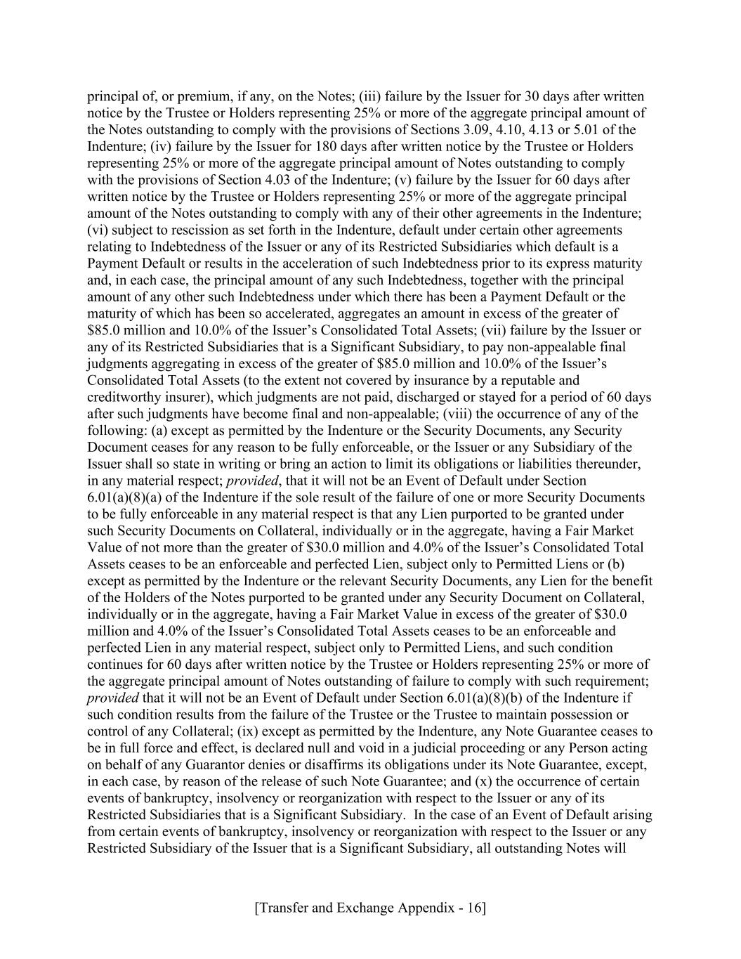 [Transfer and Exchange Appendix - 16] principal of, or premium, if any, on the Notes; (iii) failure by the Issuer for 30 days after written notice by the Trustee or Holders representing 25% or more of the aggregate principal amount of the Notes outstanding to comply with the provisions of Sections 3.09, 4.10, 4.13 or 5.01 of the Indenture; (iv) failure by the Issuer for 180 days after written notice by the Trustee or Holders representing 25% or more of the aggregate principal amount of Notes outstanding to comply with the provisions of Section 4.03 of the Indenture; (v) failure by the Issuer for 60 days after written notice by the Trustee or Holders representing 25% or more of the aggregate principal amount of the Notes outstanding to comply with any of their other agreements in the Indenture; (vi) subject to rescission as set forth in the Indenture, default under certain other agreements relating to Indebtedness of the Issuer or any of its Restricted Subsidiaries which default is a Payment Default or results in the acceleration of such Indebtedness prior to its express maturity and, in each case, the principal amount of any such Indebtedness, together with the principal amount of any other such Indebtedness under which there has been a Payment Default or the maturity of which has been so accelerated, aggregates an amount in excess of the greater of $85.0 million and 10.0% of the Issuer’s Consolidated Total Assets; (vii) failure by the Issuer or any of its Restricted Subsidiaries that is a Significant Subsidiary, to pay non-appealable final judgments aggregating in excess of the greater of $85.0 million and 10.0% of the Issuer’s Consolidated Total Assets (to the extent not covered by insurance by a reputable and creditworthy insurer), which judgments are not paid, discharged or stayed for a period of 60 days after such judgments have become final and non-appealable; (viii) the occurrence of any of the following: (a) except as permitted by the Indenture or the Security Documents, any Security Document ceases for any reason to be fully enforceable, or the Issuer or any Subsidiary of the Issuer shall so state in writing or bring an action to limit its obligations or liabilities thereunder, in any material respect; provided, that it will not be an Event of Default under Section 6.01(a)(8)(a) of the Indenture if the sole result of the failure of one or more Security Documents to be fully enforceable in any material respect is that any Lien purported to be granted under such Security Documents on Collateral, individually or in the aggregate, having a Fair Market Value of not more than the greater of $30.0 million and 4.0% of the Issuer’s Consolidated Total Assets ceases to be an enforceable and perfected Lien, subject only to Permitted Liens or (b) except as permitted by the Indenture or the relevant Security Documents, any Lien for the benefit of the Holders of the Notes purported to be granted under any Security Document on Collateral, individually or in the aggregate, having a Fair Market Value in excess of the greater of $30.0 million and 4.0% of the Issuer’s Consolidated Total Assets ceases to be an enforceable and perfected Lien in any material respect, subject only to Permitted Liens, and such condition continues for 60 days after written notice by the Trustee or Holders representing 25% or more of the aggregate principal amount of Notes outstanding of failure to comply with such requirement; provided that it will not be an Event of Default under Section 6.01(a)(8)(b) of the Indenture if such condition results from the failure of the Trustee or the Trustee to maintain possession or control of any Collateral; (ix) except as permitted by the Indenture, any Note Guarantee ceases to be in full force and effect, is declared null and void in a judicial proceeding or any Person acting on behalf of any Guarantor denies or disaffirms its obligations under its Note Guarantee, except, in each case, by reason of the release of such Note Guarantee; and (x) the occurrence of certain events of bankruptcy, insolvency or reorganization with respect to the Issuer or any of its Restricted Subsidiaries that is a Significant Subsidiary. In the case of an Event of Default arising from certain events of bankruptcy, insolvency or reorganization with respect to the Issuer or any Restricted Subsidiary of the Issuer that is a Significant Subsidiary, all outstanding Notes will